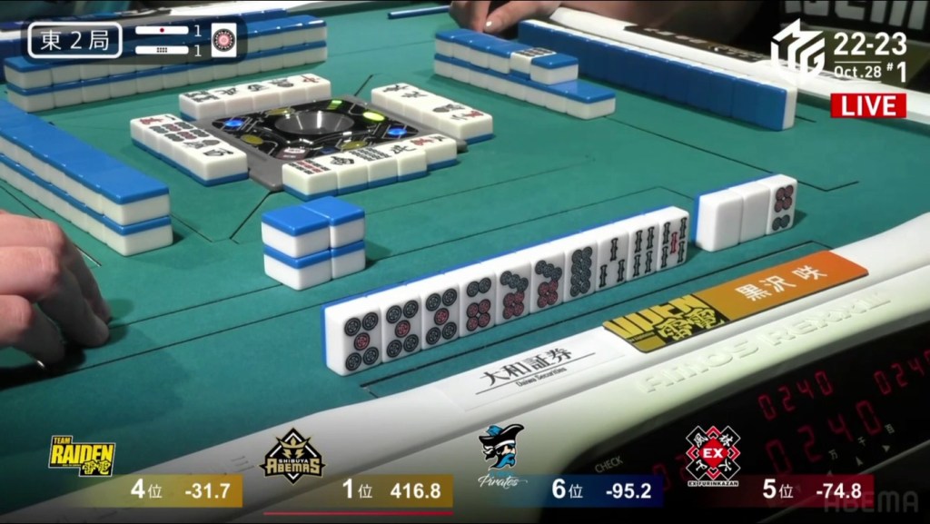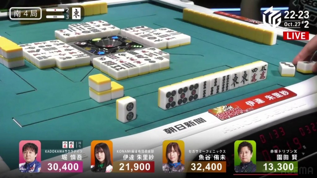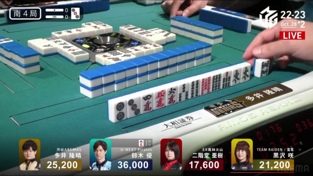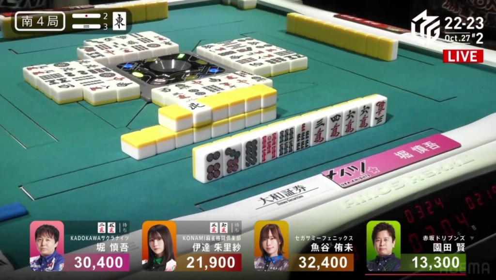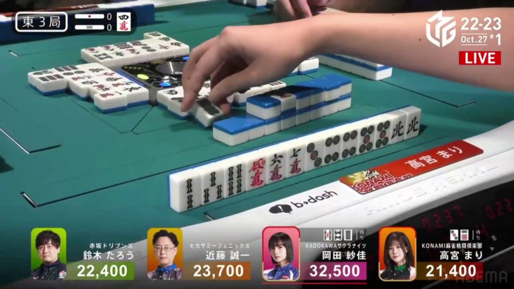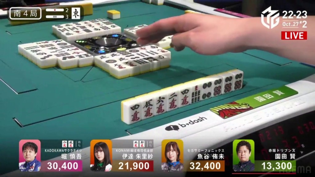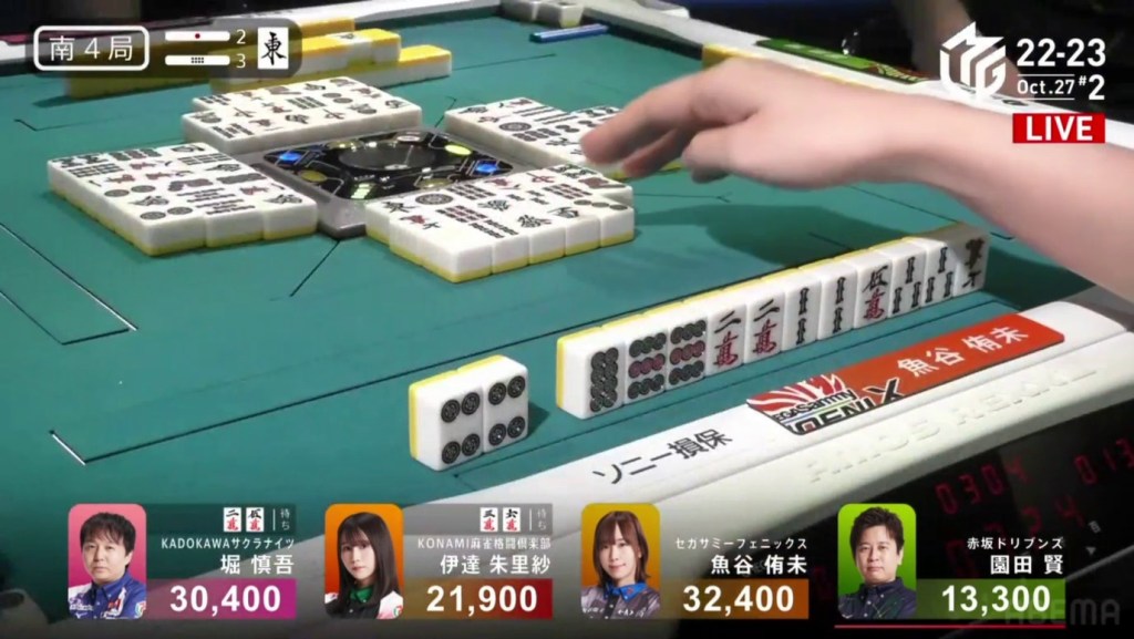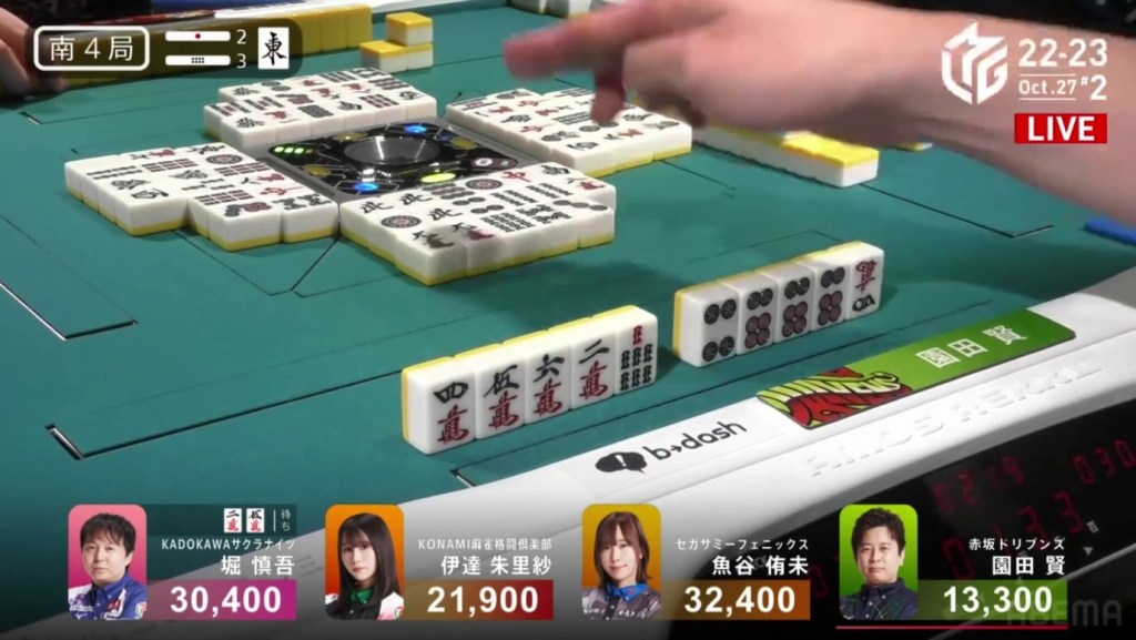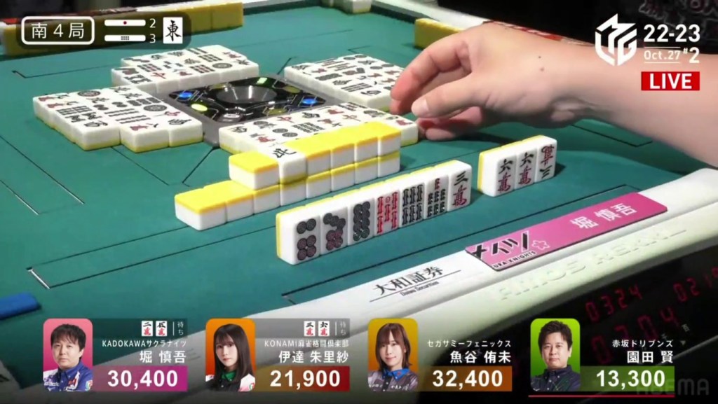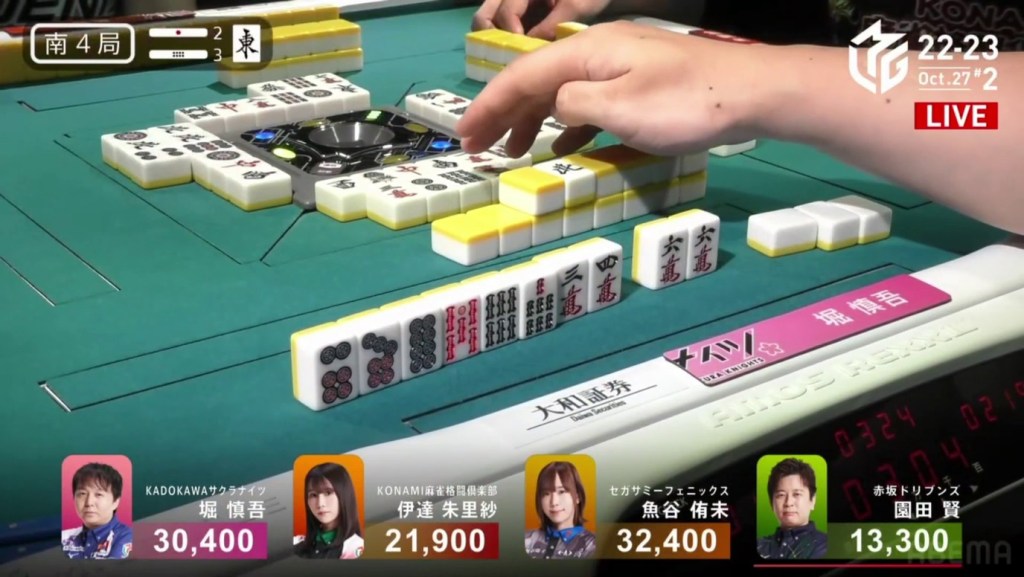 On the very last draw, Hori draws the 3m, Date’s winning tile. From here, Hori has to choose between the 3m, 4m and 6m if he wants to keep tenpai. Two of the three choices put him in 3rd place.