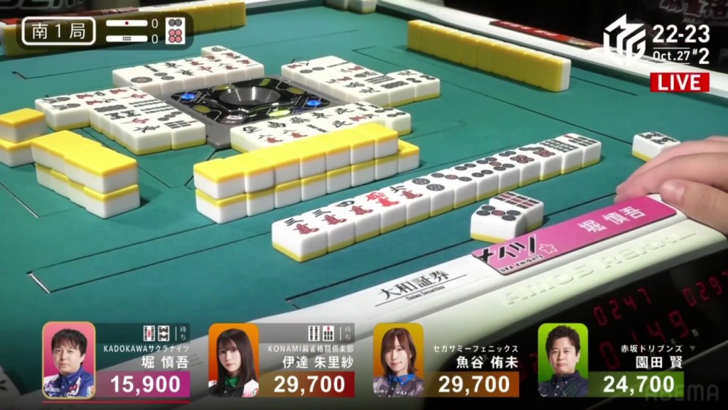In S1-0, Hori is in 4th place, 8,800 behind 3rd and 13,800 behind 2nd/1st. With this being his last dealership, he needs a big hand for a chance at a comeback. He starts out 4-shanten, but holds two ryanmens, a 6p dora and a red 5m. While he throws isolated honours, he creates and fills ryanmens and shifts his hand to tanyao. By the end of the row, he is 2-shanten with three ryanmens. Near the end of the 2nd row, Hori gets to tenpai and calls riichi on a 58s ryanmen, guaranteeing at least 5 han. Two turns later, he draws the 8s and wins the hand. Hori wins with Riichi/Tsumo/Pinfu/Tanyao/Dora 1/Aka 1 for 6,000 all, catapulting him from 4th place to 1st place.
