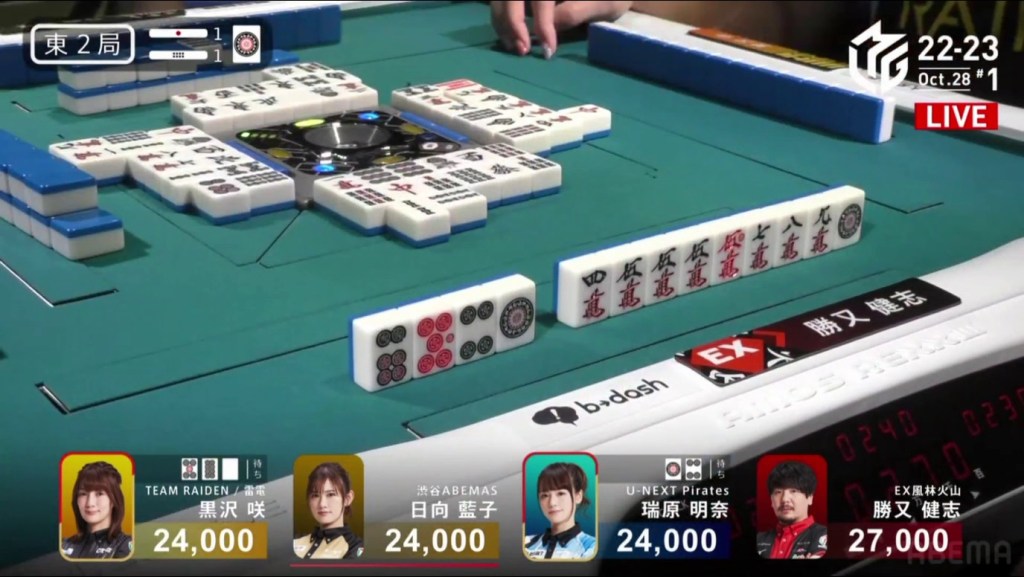 The game is relatively young in E2-1, with previous hand ending in a draw with Katsumata’s riichi being the only tenpai. At the start, all four players are 3-shanten, with Kurosawa’s hand looking promising with two completed groups. In the first row, Kurosawa draws a pair of white dragons, completes a ryanmen and gets to iishanten by turn 4. On turn 5, Kurosawa gets to tenpai and calls riichi on a 58p/white dragon wait.