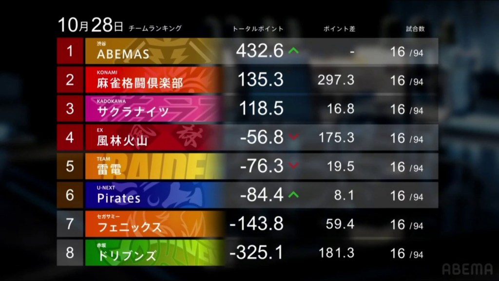 Next are the Shibuya Abemas. The success continues for the Shibuya Abemas. Four week of positive results. 16 games without a 4th. After just 4 weeks, they have around a +300.0 lead over the next team. This week, they added +54.8 with their 1/2/1/0 record.