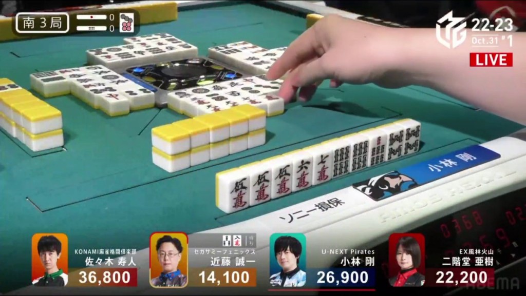 With every tile, we wondered if the month would end the same way it started: with a yakuman. Even with the riichi, Kobayashi worked around it. In the middle of the row, Kobayashi makes a call to get to a 7s kanchan tenpai.