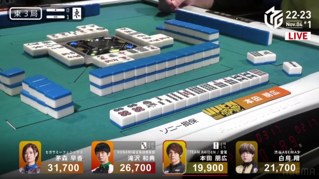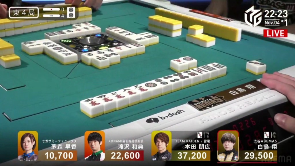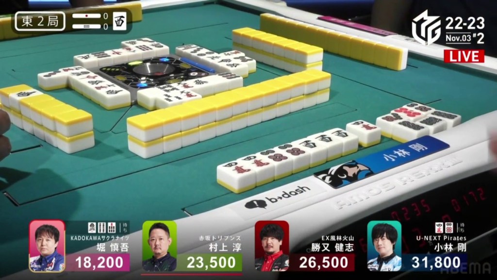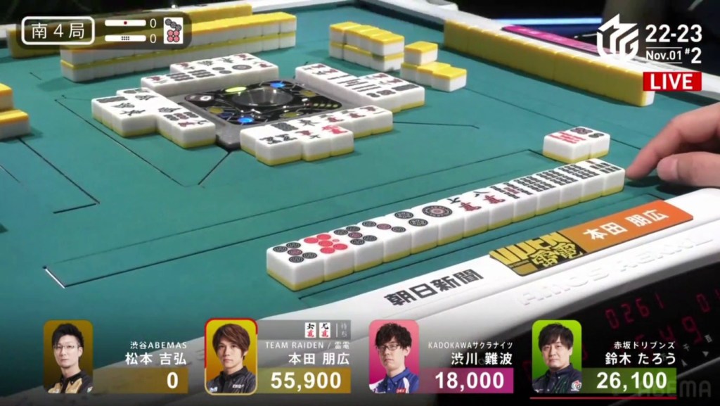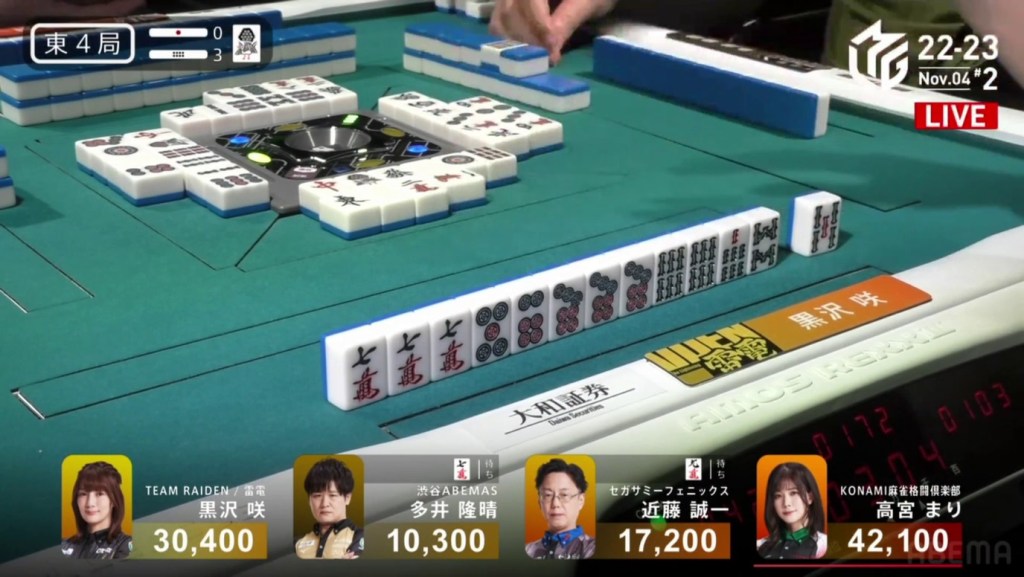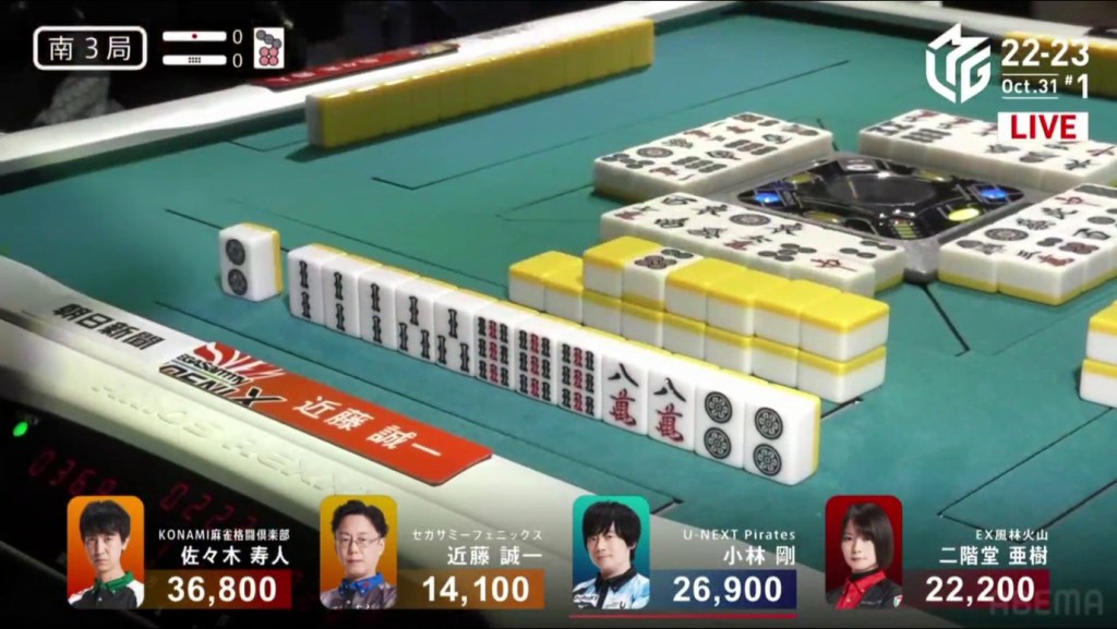 With the wall getting shorter, Kondo had one more chance. The last tile is… 3m. Right number, wrong suit. Kobayashi folds his hand and on Aki’s last draw, she manages to get to tenpai, but that was it. The hand went to a draw soon after with Kondo and Aki the only ones tenpai.