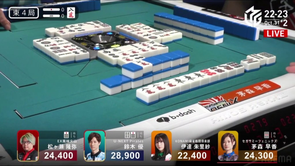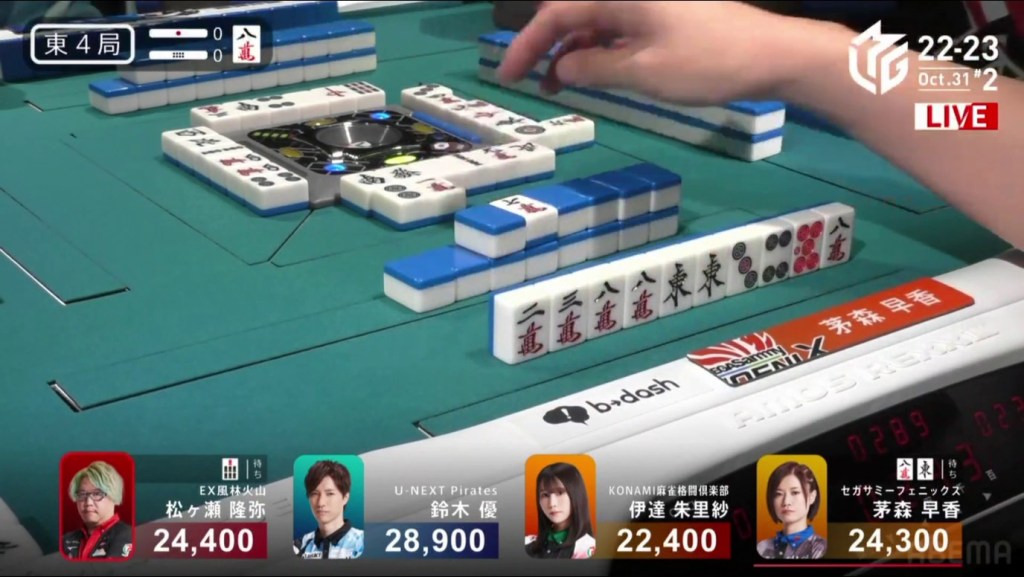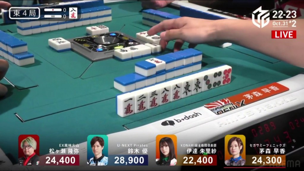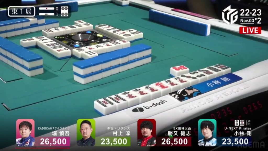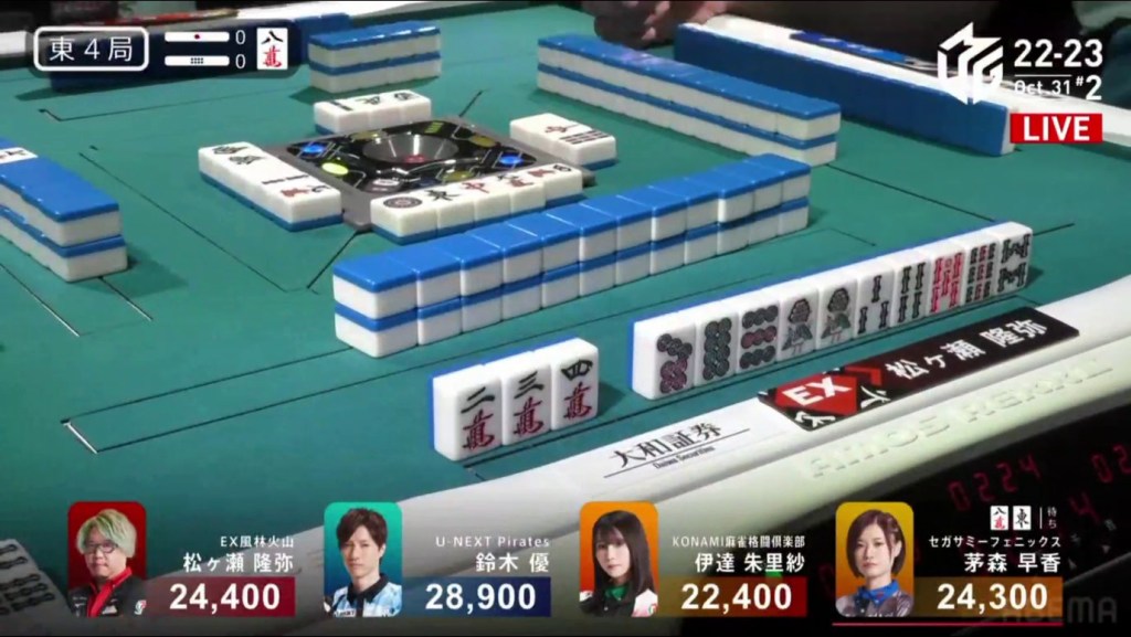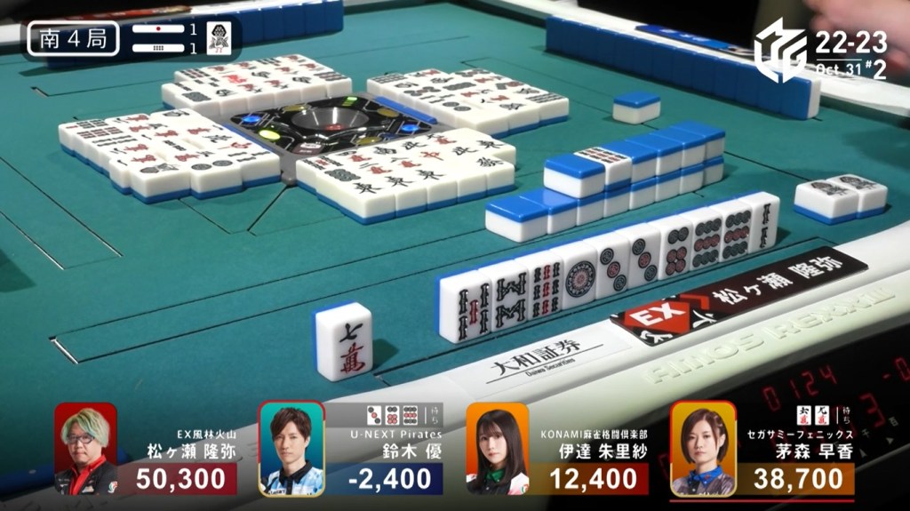 In E1-1, Kobayashi sits as the only member of the U-Next Pirates. He starts out the hand with a cool ryanmen-ryanmen iishanten with a 4p dora and a potential 456m iipeikou. Despite the good start, the wall didn’t do much besides giving him a red 5m. At the start of the 2nd row, he finally gets to tenpai, drawing the 6m for iipeikou. Kobayashi stays dama on a 25p ryanmen, sitting with a guaranteed mangan. On Hori’s draw he draws the red 5p. Since it didn’t fit with his souzu honitsu, he discarded it and dealt into Kobayashi. Kobayashi wins with Pinfu/Iipekou/Dora 1/Aka 2 for 8,000+300, moving into 1st place.