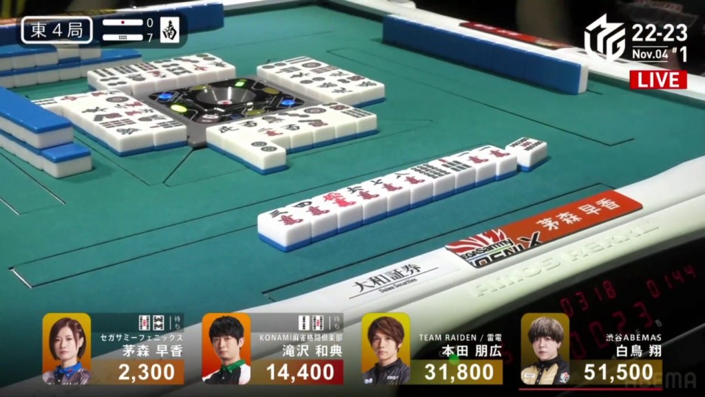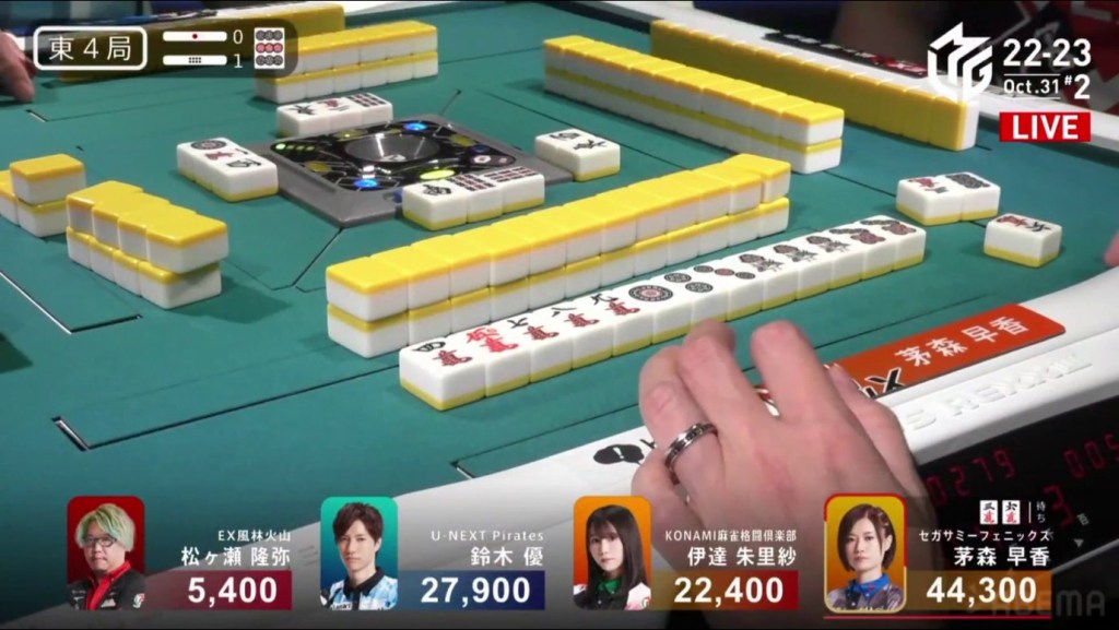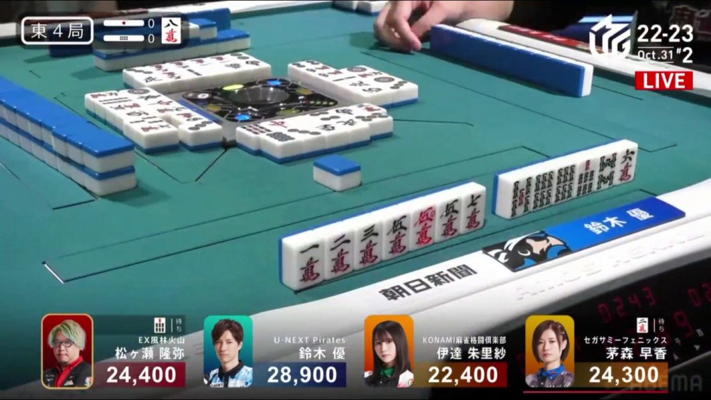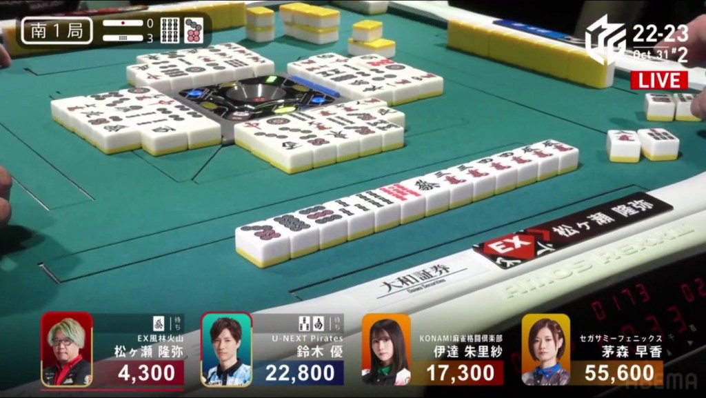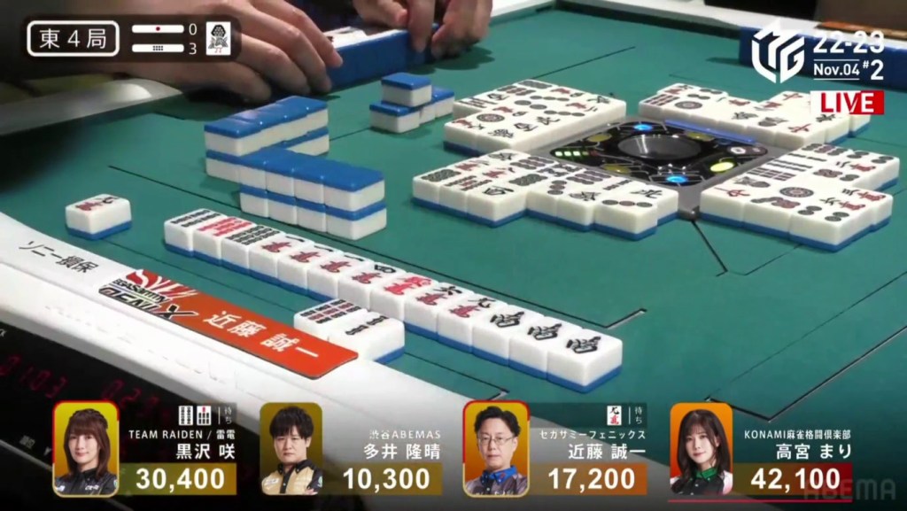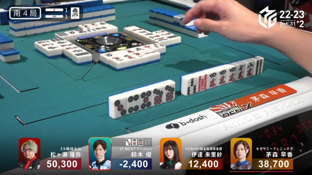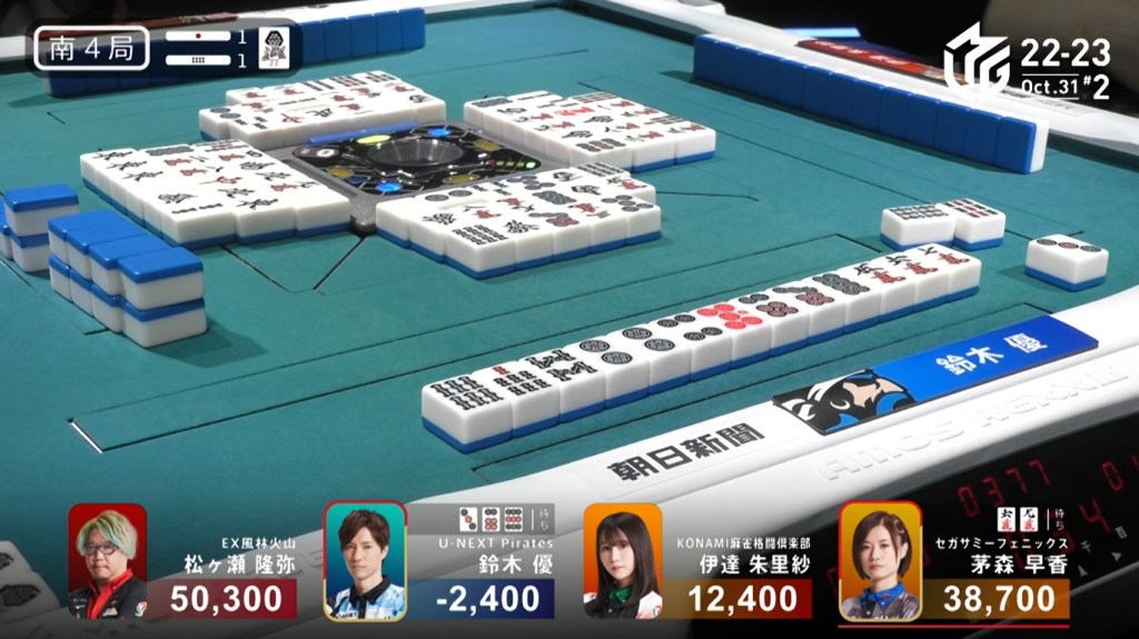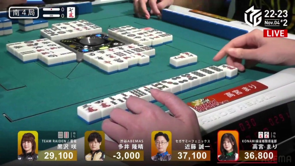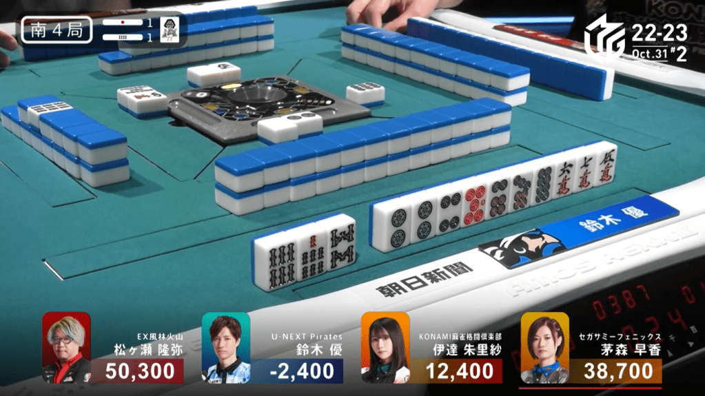 With the riichi, Matsugase chooses to fold, as his hand wasn’t going to advance anyways. To Matsugase’s left, Kayamori is hard at work. Holding the dealership and with no chance of falling into 3rd, Kayamori pushes her hand to go for 1st place. After some good draws, Kayamori gets to tenpai in the middle of the 2nd row on a 69m ryanmen.