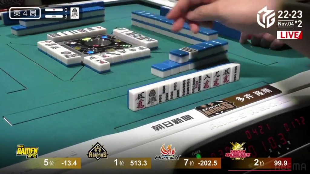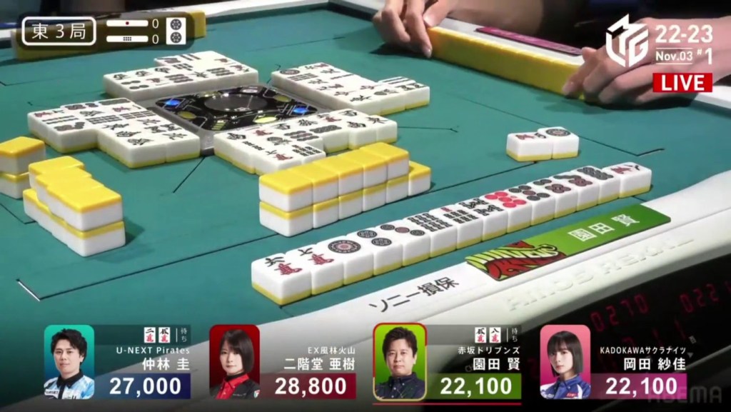 n E3-0, Sonoda is tied for 2nd/3rd and holding the hopes of the team on his shoulders. The Akasaka Drivens haven’t won a game in 17 games and the team needs a morale boost. He starts out the hand 4-shanten with two penchans, but a 2p dora provides the hand with a small glimmer of hope. On turn 2, he draws a red 5p, adding some value to the hand. Filling in a penchan and securing a ryanmen, Sonoda is 2-shanten by the end of the first row. On the 2nd row, he gets rid of his other penchan and moves his hand closer to a 678 sanshoku. In the middle of the row, Sonoda gets to tenpai and calls riichi on a 58m ryanmen. The difference between the two waits is substantial, with the 8m giving the additional sanshoku for a haneman. With the rest out of his control, Sonoda watches the rest of the table. In the third row, Nakabayashi calls pon on the 2p dora to get to tenpai on a 25m ryanmen, adding some worry for Sonoda. However, just two turns later, Sonoda draws the takame 8m and wins the hand. Sonoda wins the hand with Riichi/Tsumo/Pinfu/Sanshoku/Dora 1/Aka 1 for 6,000 all.