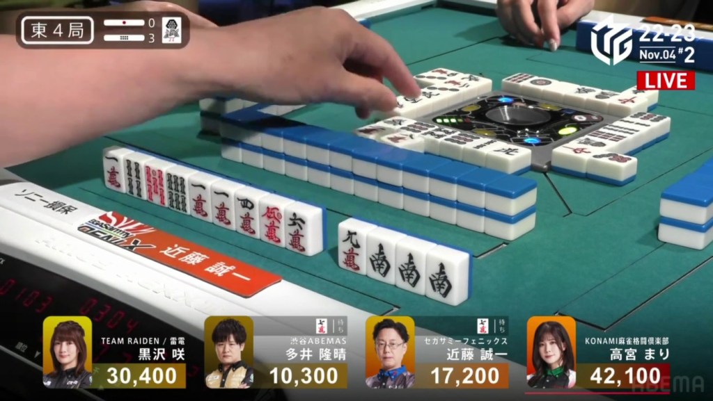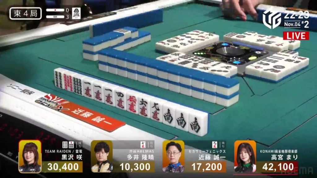 In E4-3, the scores are decently spread out, being around a mangan from one rank to the next.. Looking around the table, 1st place Takamiya’s hand is full of ryanmens at 3-shanten, 2nd place Kurosawa is 4-shanten with an ankou and a dora, 4th place Ooi is 3-shanten with a dora and a pair of easts and Kondo is 2-shanten with a red 5s. The first action comes in the 2nd turn, when Ooi calls pon on the east. By the end of the 1st row, everyone but Takamiya is iishanten. At the start of the 2nd row, Ooi is the first to tenpai, waiting on a 7m penchan.