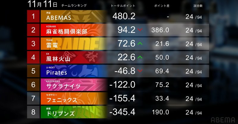 The Shibuya Abemas are next. This is the team’s first week of negative results, a “disastrous” week when compared to the others. Ooi registers another loss and Matsumoto and Hinata registered annoying 3rds. However, even with these drops, Shirato gained points and the team is still far in the lead. This week, they went 0/1/2/1 and lost -71.9.