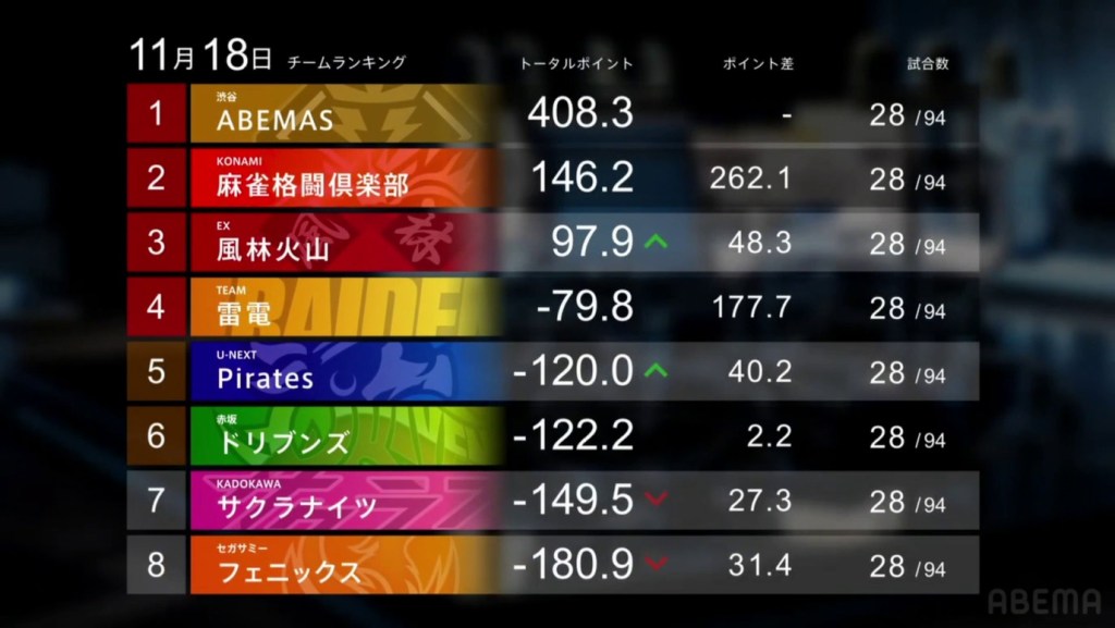 7th in the performance rankings are the U-Next Pirates. Unlucky deal-ins and close games plagued the team. However, Nakabayashi’s South 4 comeback did shine a little positive light for the team. The team still remains in 5th place in the standings, but they have lost -73.2 with their 0/2/0/2 record, breaking their 4-game positive week streak.