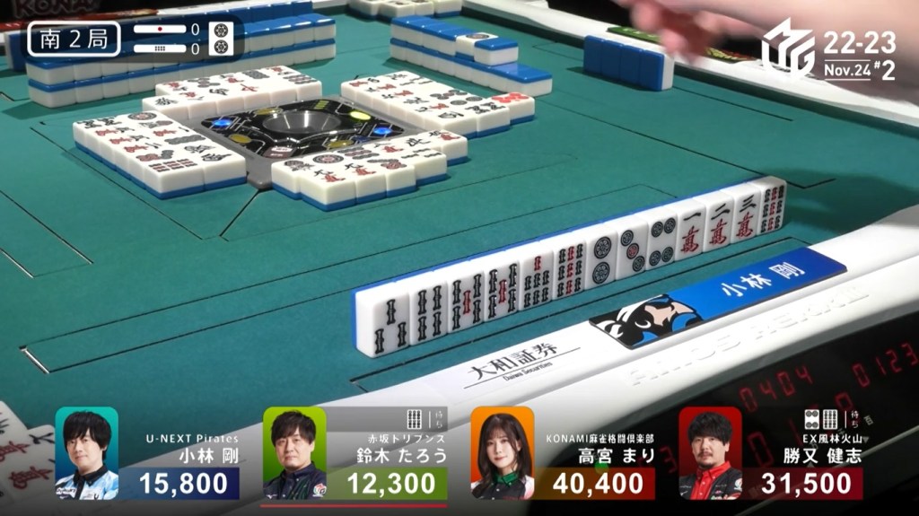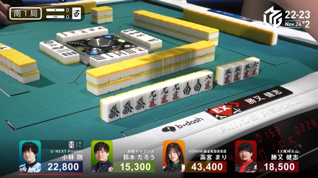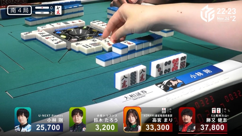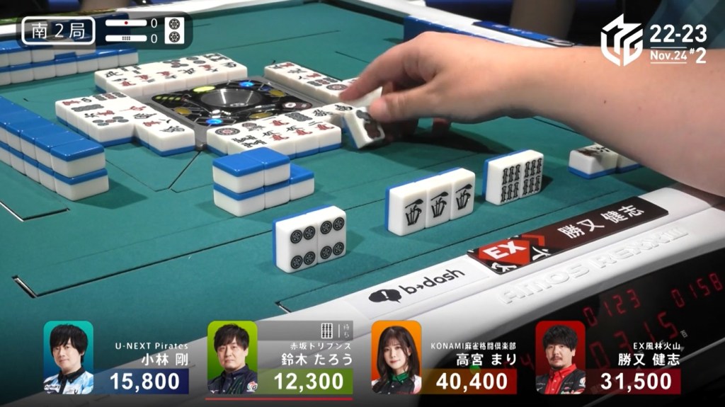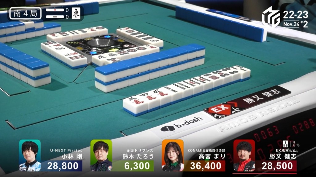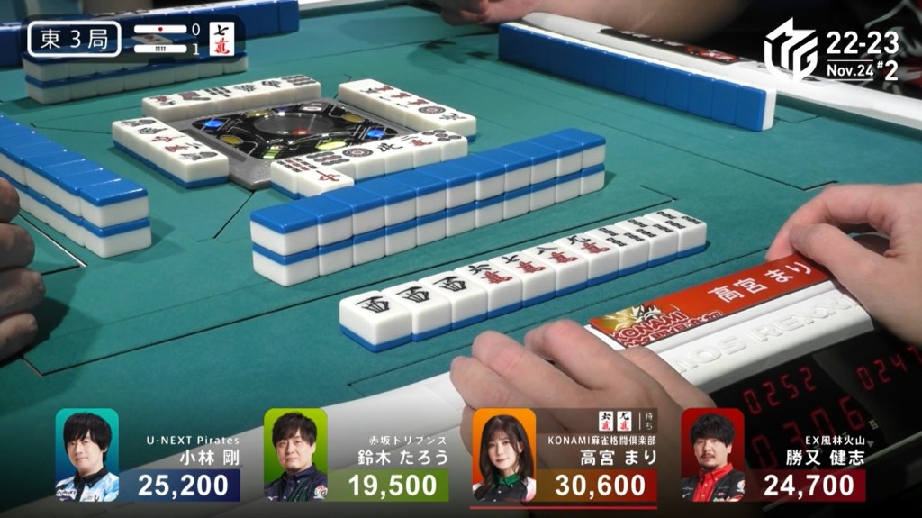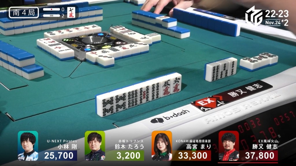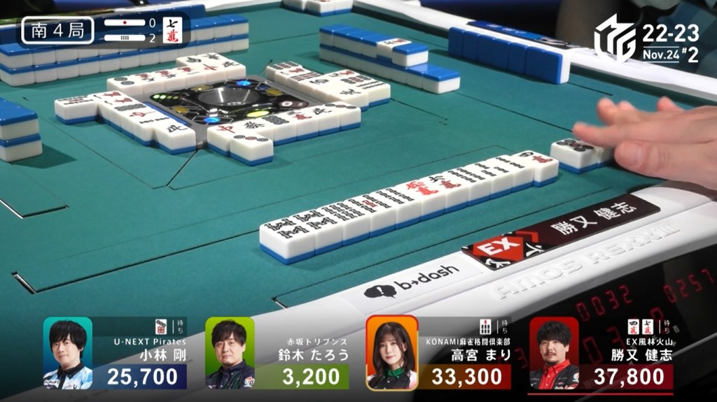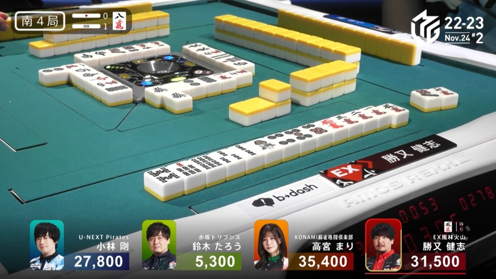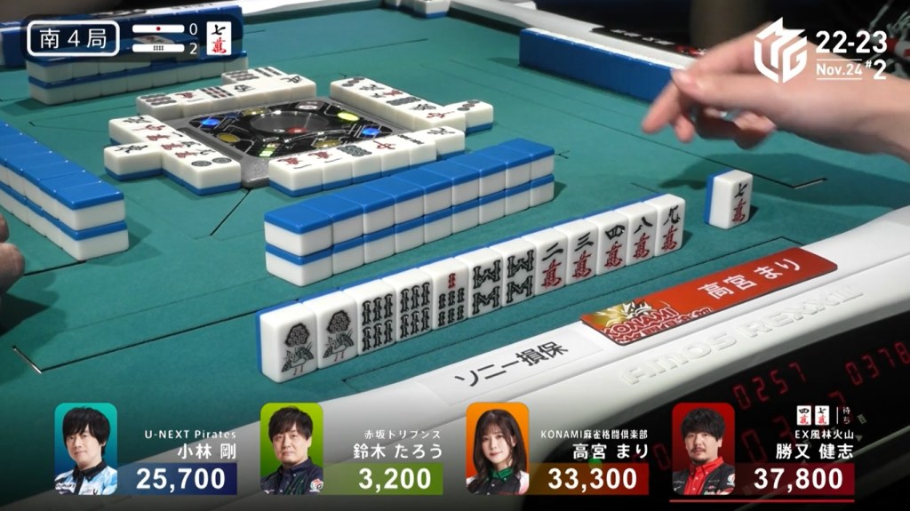 However, both Pirates and Konami fans were disappointed when Katsumata drew the 4m less than a turn later to win the hand. Katsumata wins with Tanyao/Aka 1 for 1,000+200 all plus Takamiya’s riichi stick.