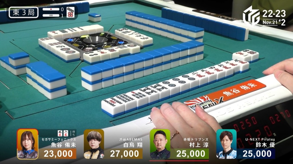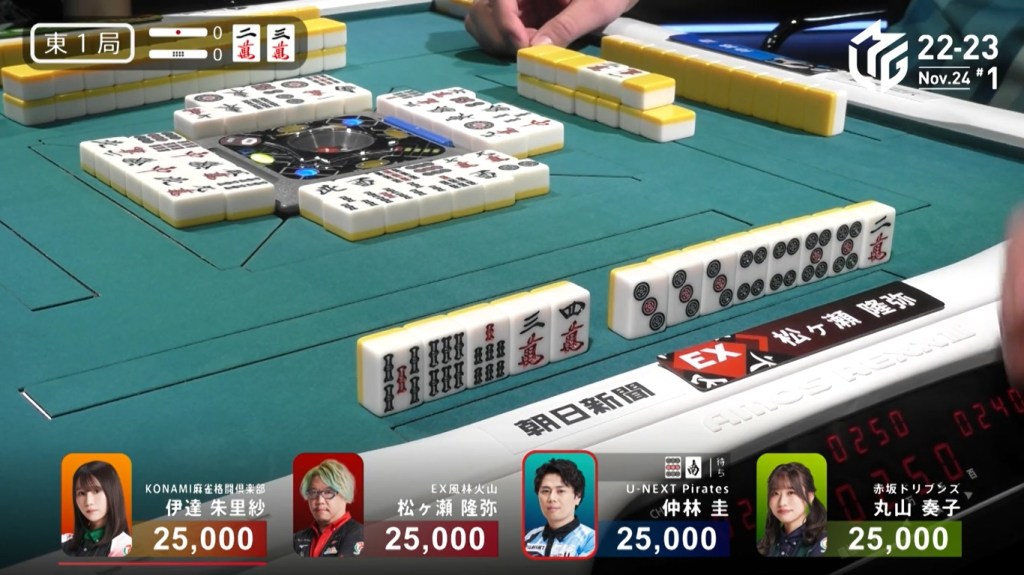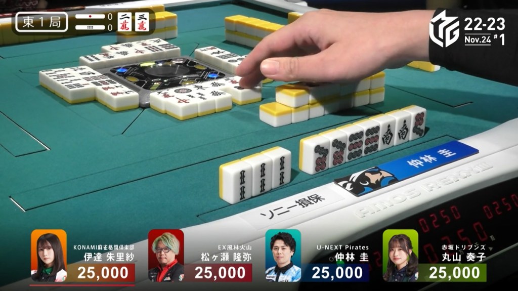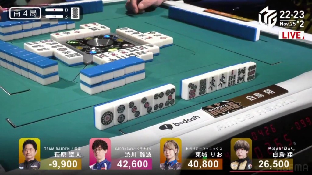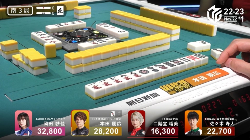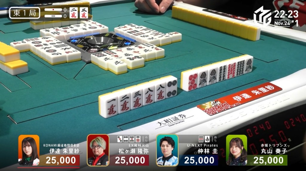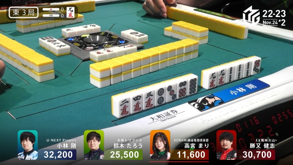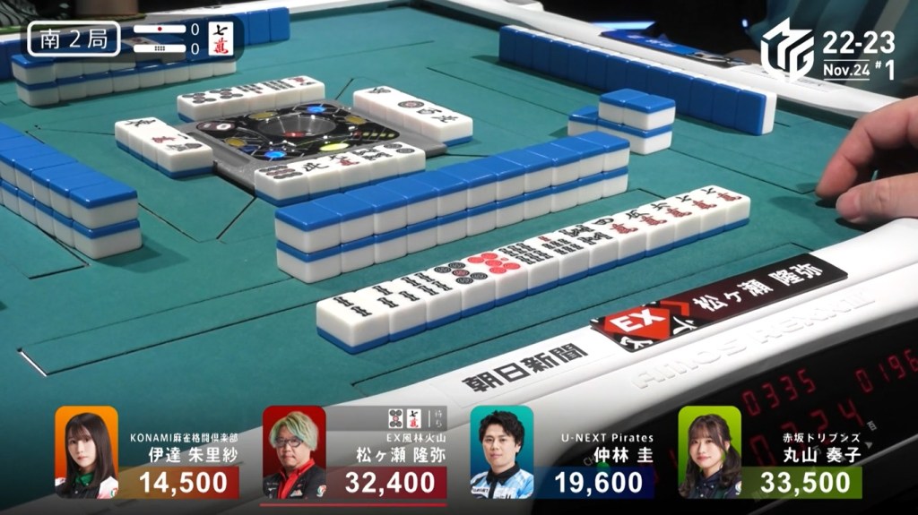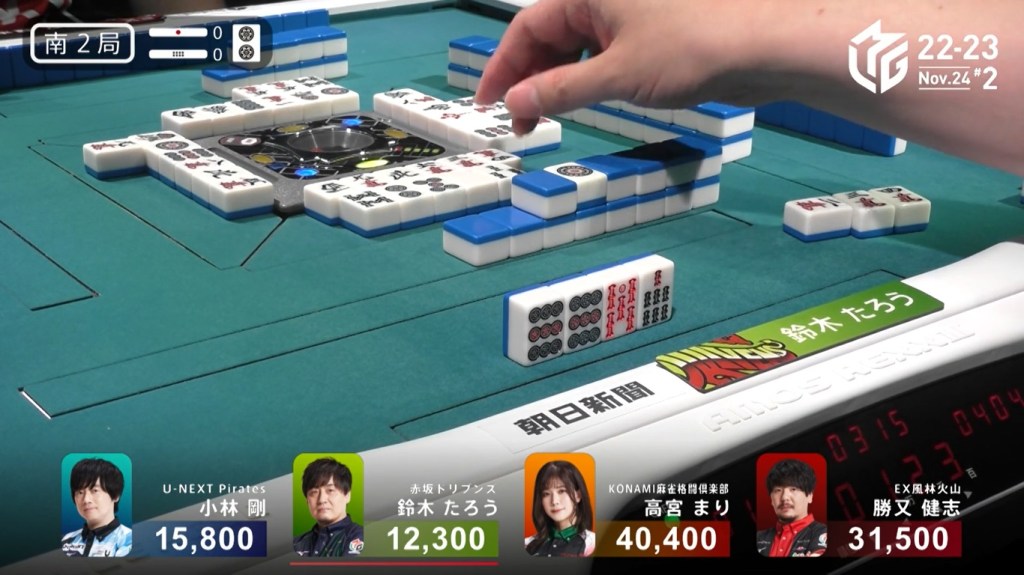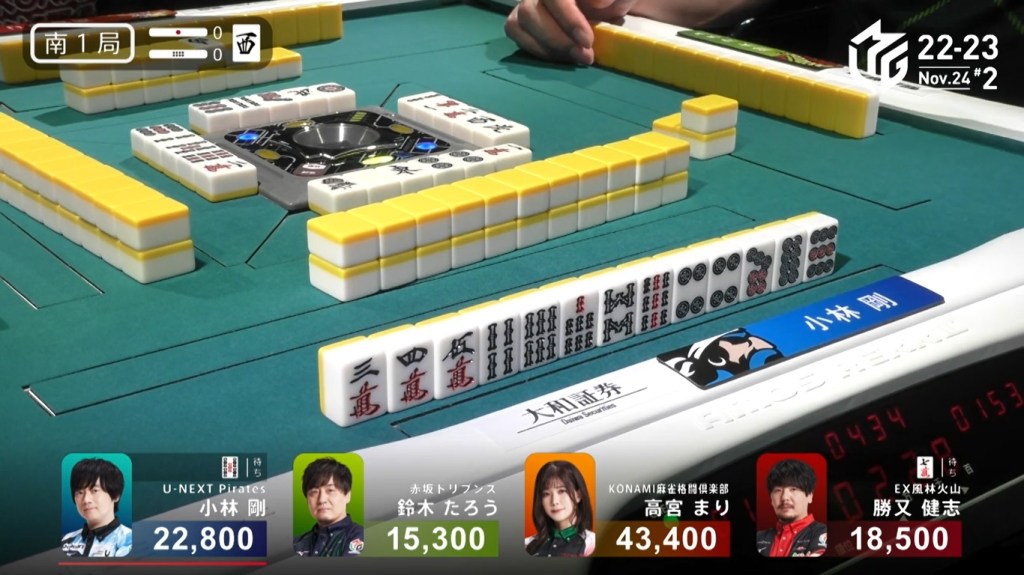 However, both Pirates and Konami fans were disappointed when Katsumata drew the 4m less than a turn later to win the hand. Katsumata wins with Tanyao/Aka 1 for 1,000+200 all plus Takamiya’s riichi stick.
