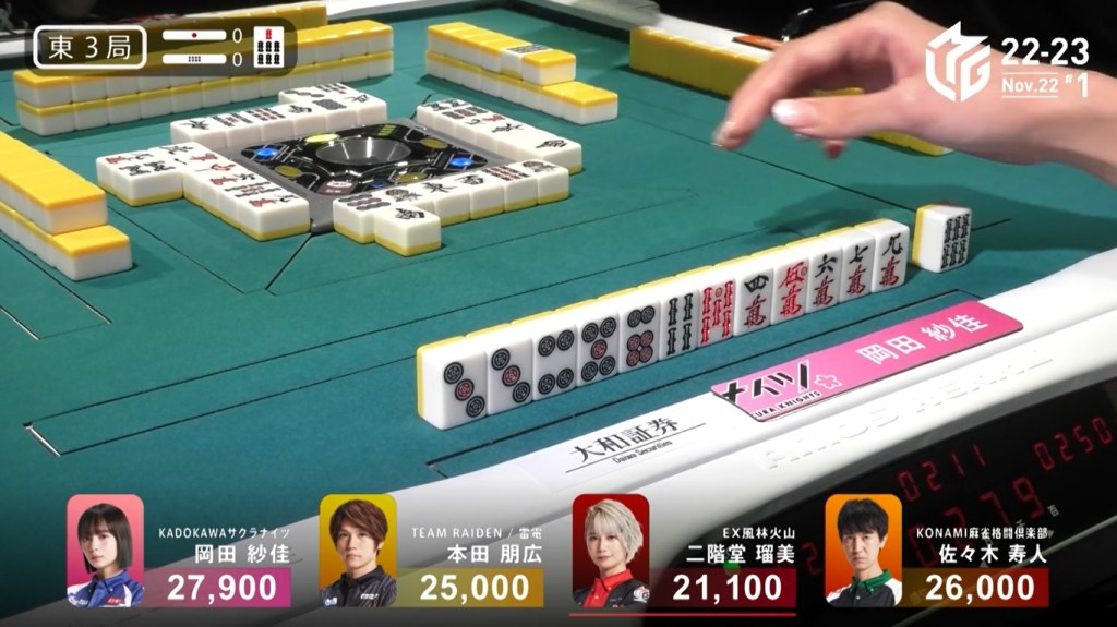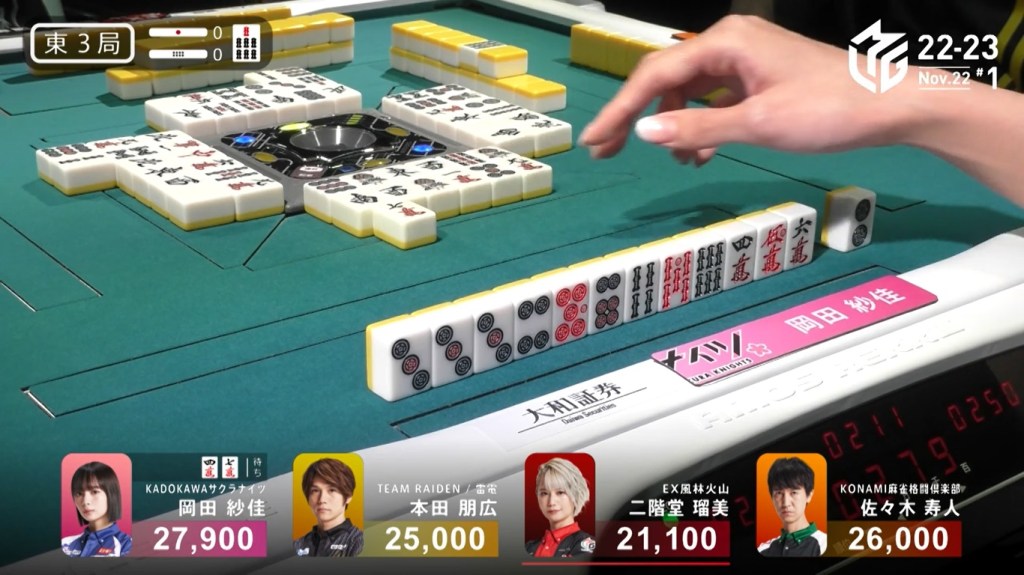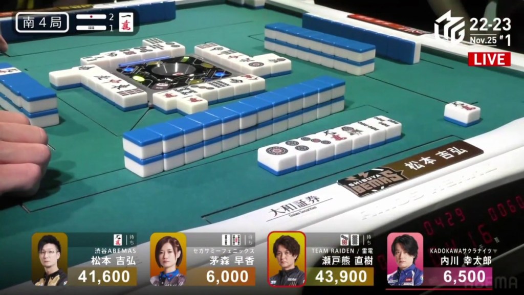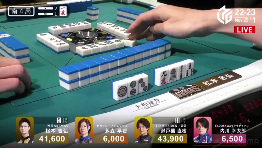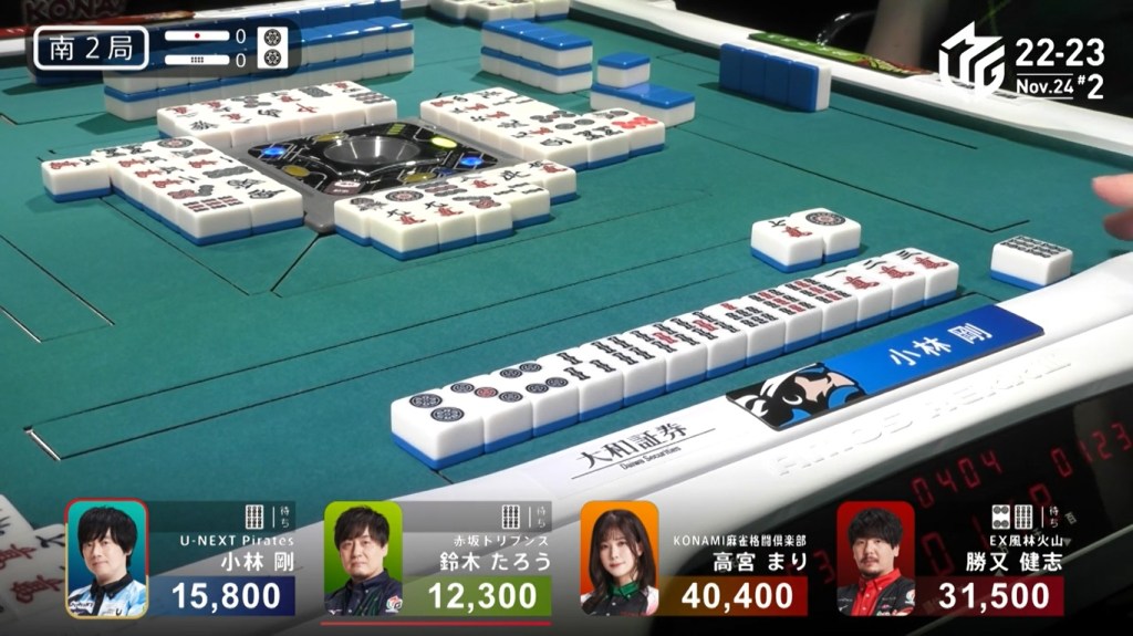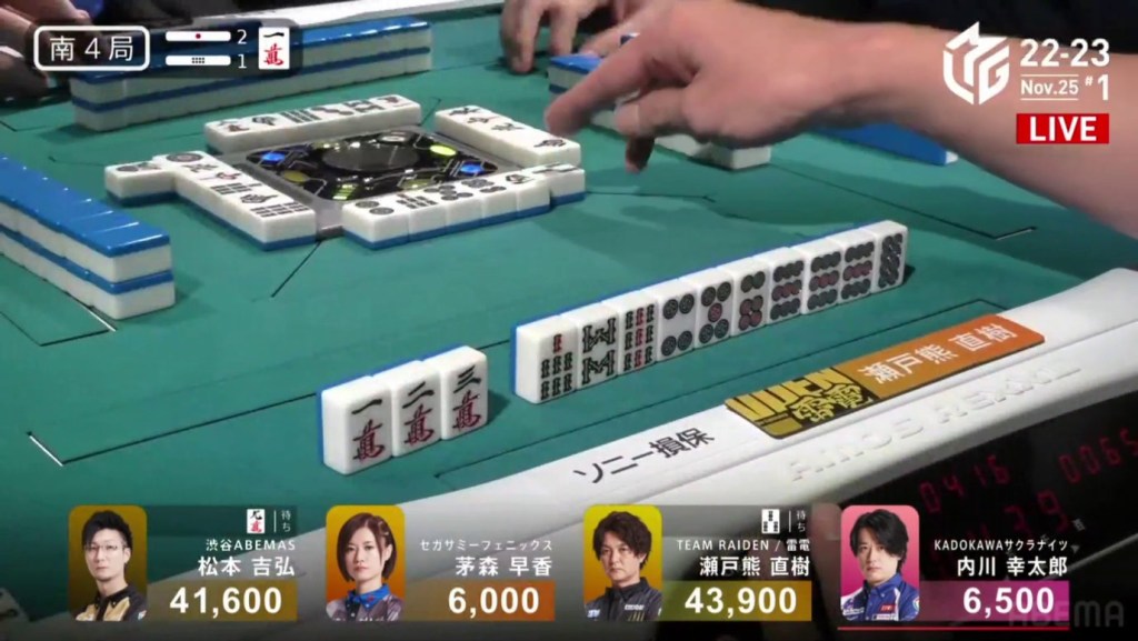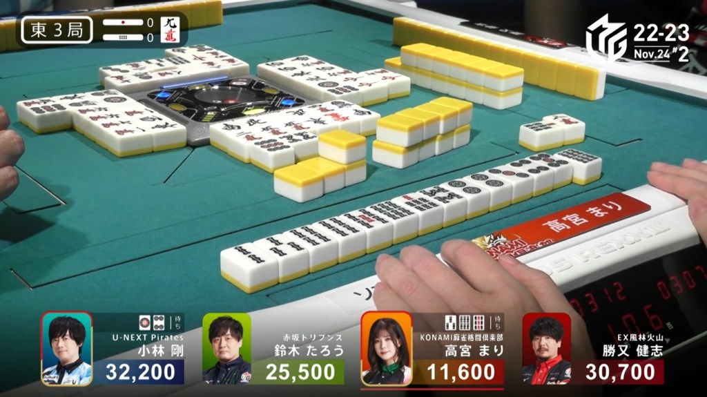 Also of note is that because Uchikawa was the dealer, he lost 500 more points than Kayamori, causing the two of them to finish the game with 5,400, tying for 3rd/4th place.