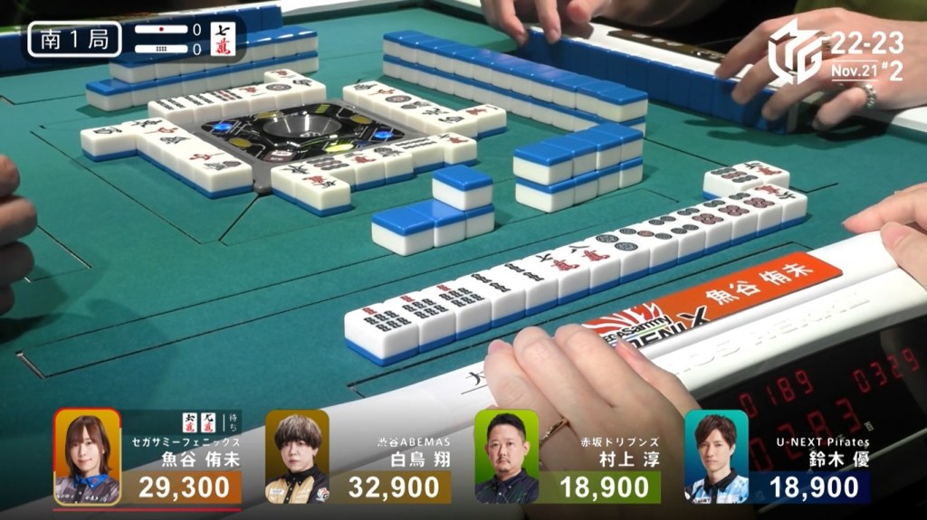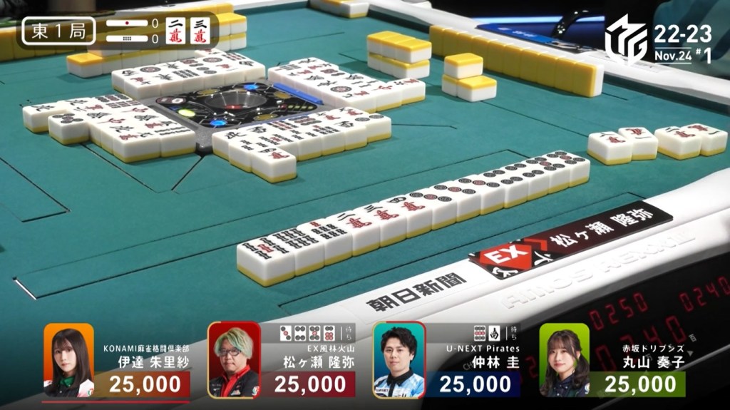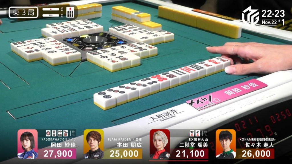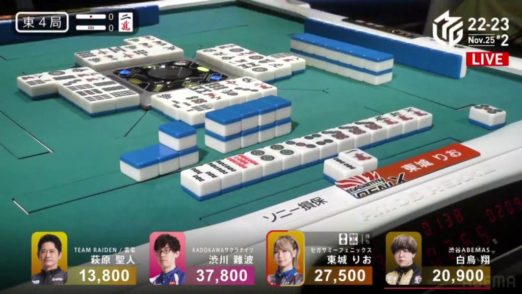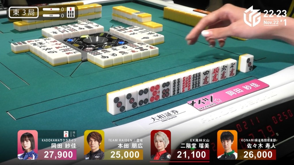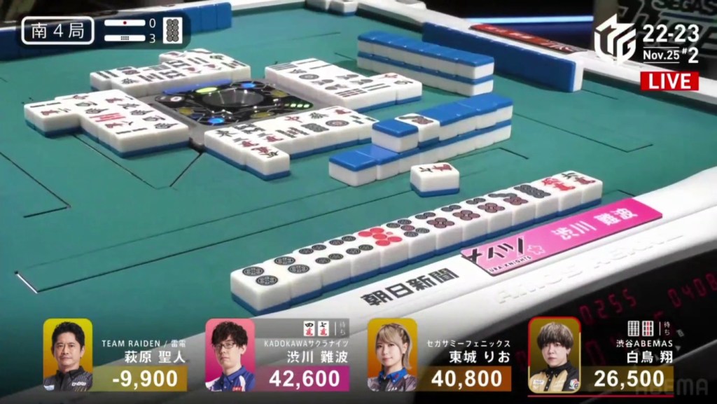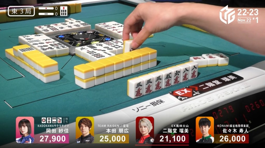 Also of note is that because Uchikawa was the dealer, he lost 500 more points than Kayamori, causing the two of them to finish the game with 5,400, tying for 3rd/4th place.