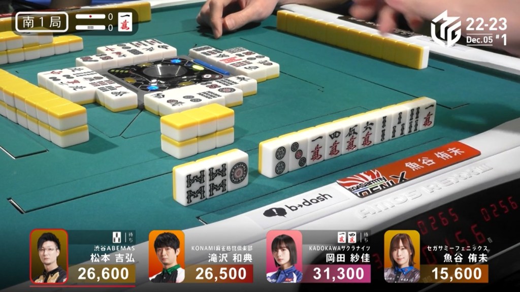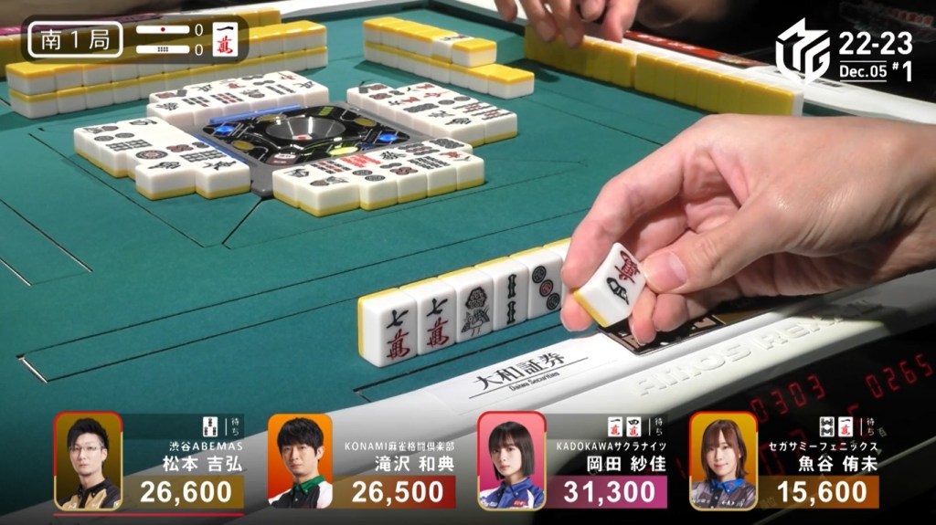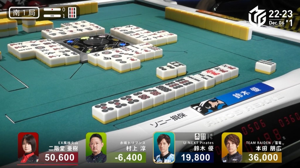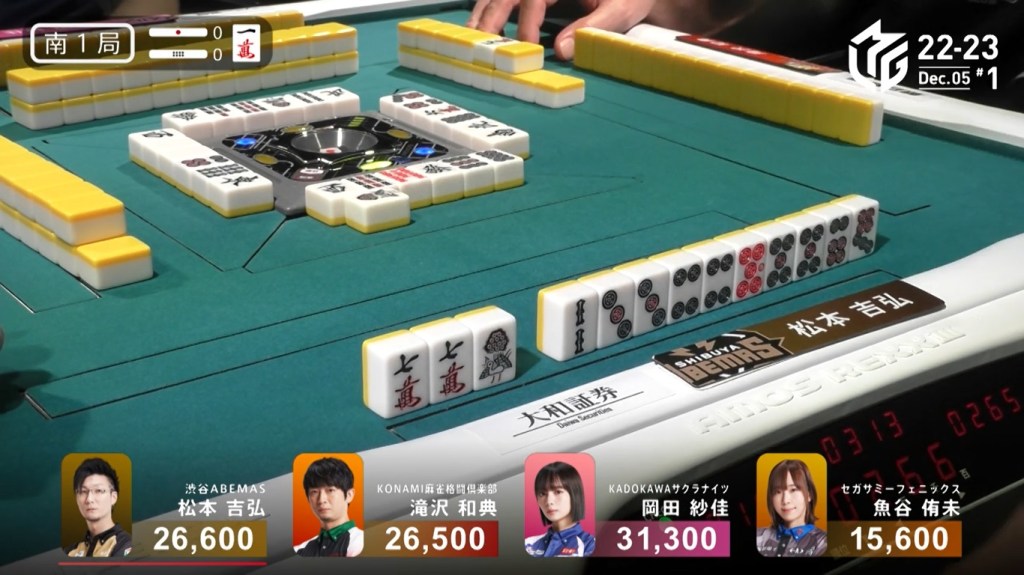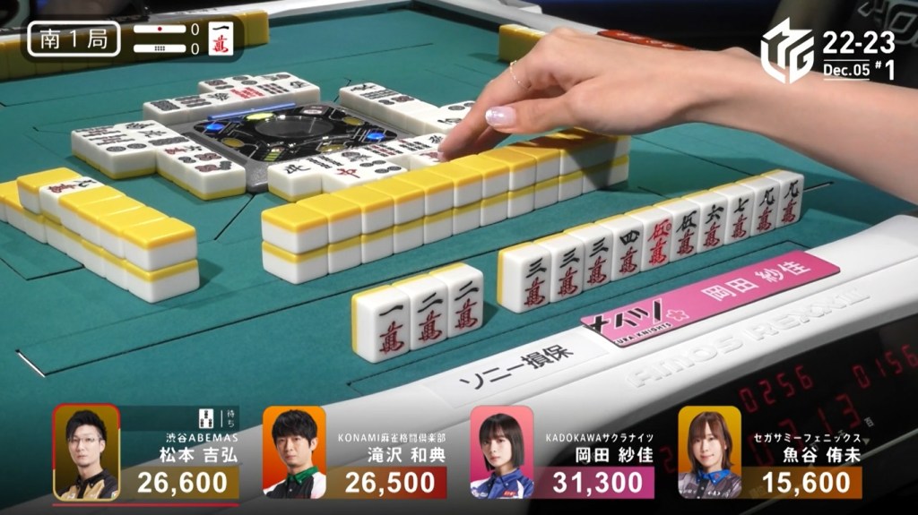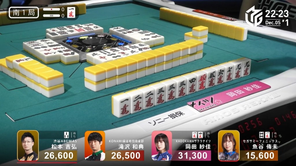 In E1-0, Sonoda starts the game as the dealer and wanting to give the team a 1st to cheer about after a week without one. He starts out the hand 3-shanten with a red 5s for value. Creating a ryanmen and filling a kanchan, Sonoda gets to iishanten on turn 5. In the middle of the second row, Sonoda gets to tenpai and calls riichi on a 47m ryanmen. With five left in the wall, Sonoda has a very good chance of winning the hand. At the end of the second row, there were still five left. In the middle of the third row, it was brought down to 4, then down to 3. With one more draw for each player, his wining tiles were reduced to 2. On Sonoda’s last draw, the second-last tile in the wall, Sonoda found the 4m to win the hand. Sonoda wins with Riichi/Tsumo/Pinfu/Aka 1/Ura 1 for 4,000 all, taking the early lead.