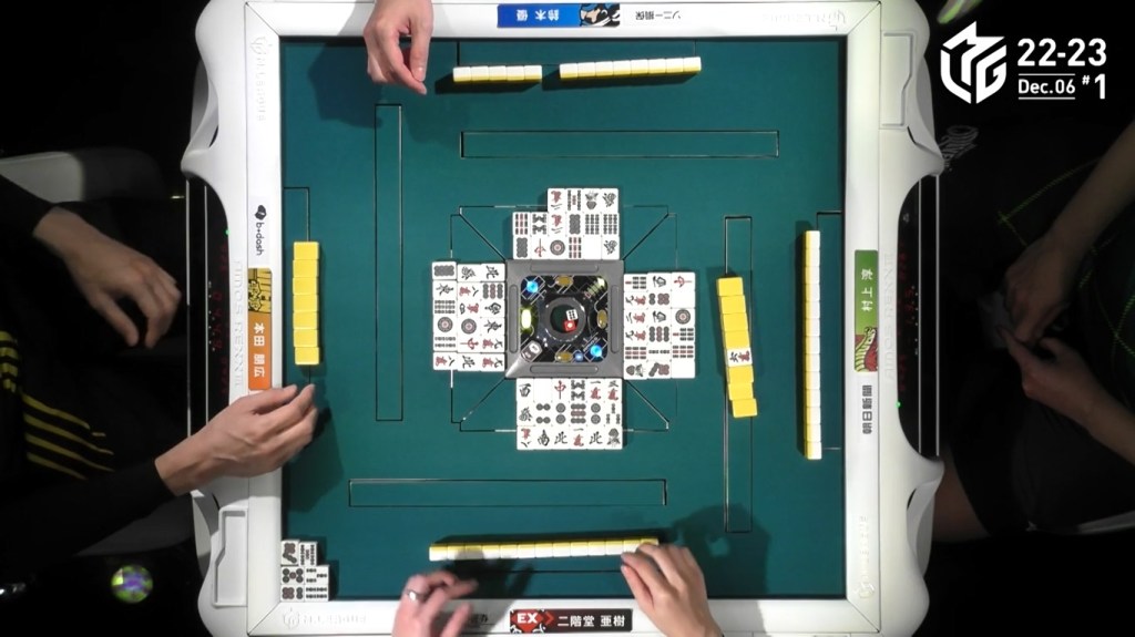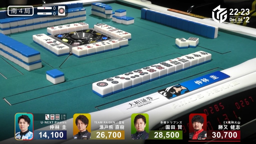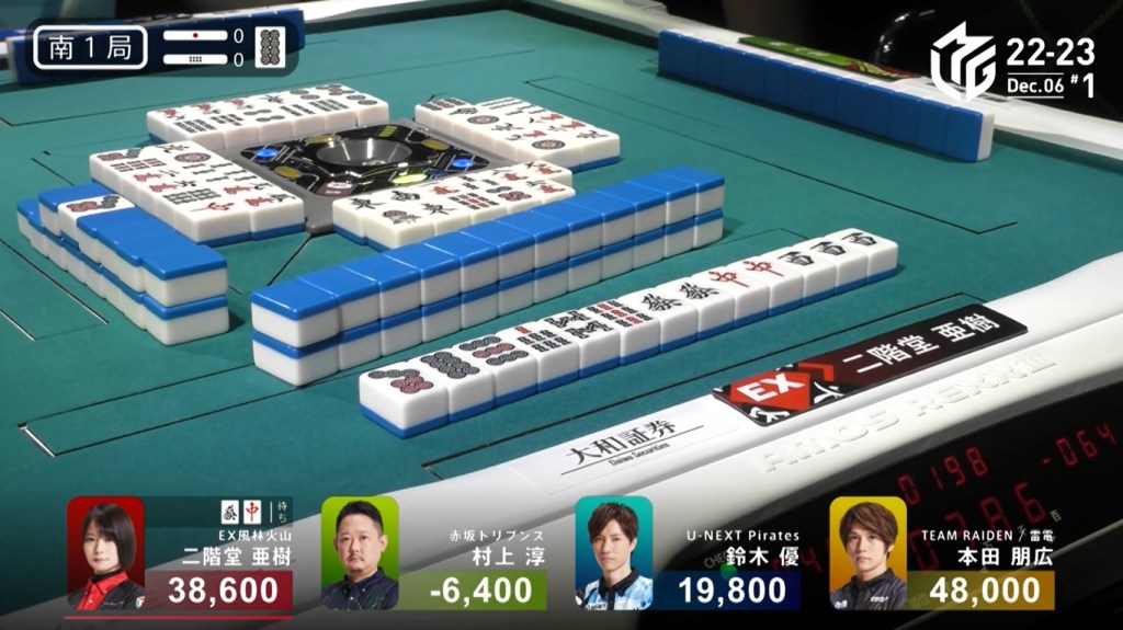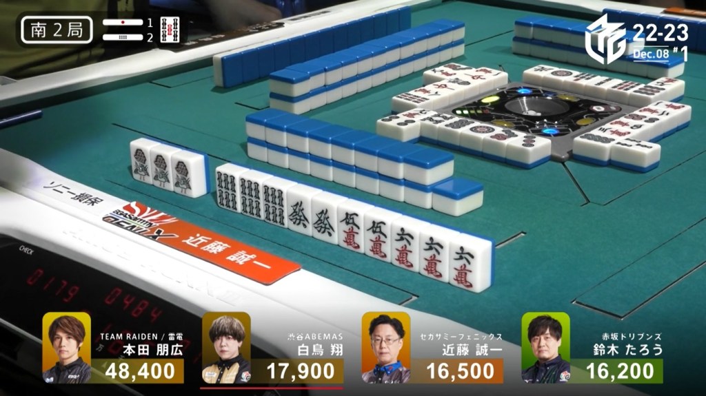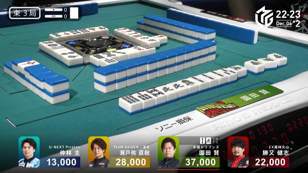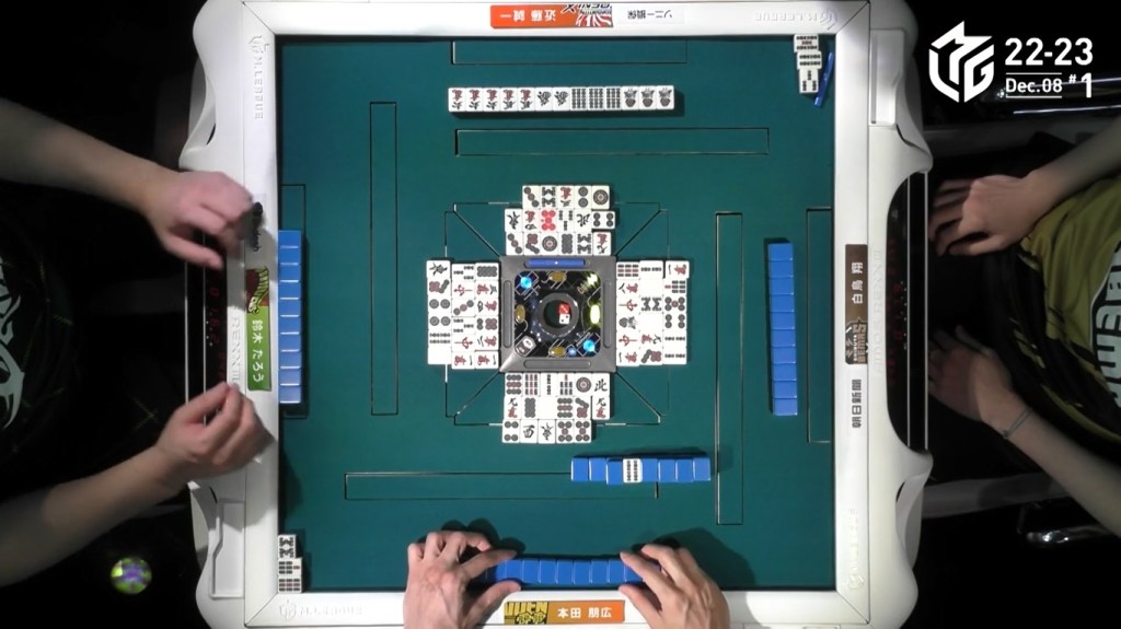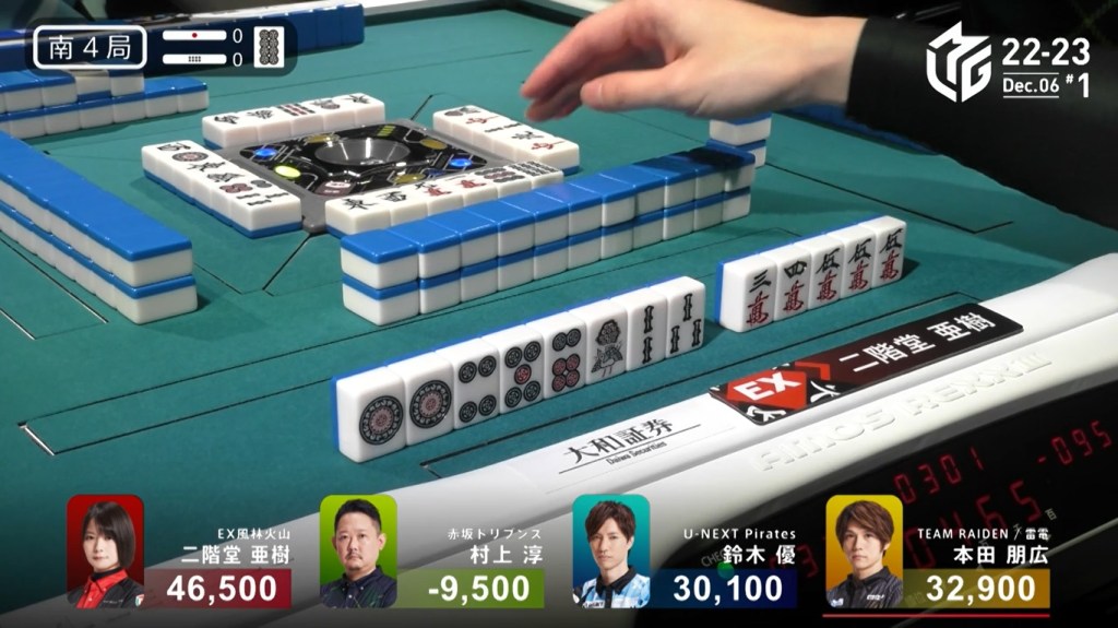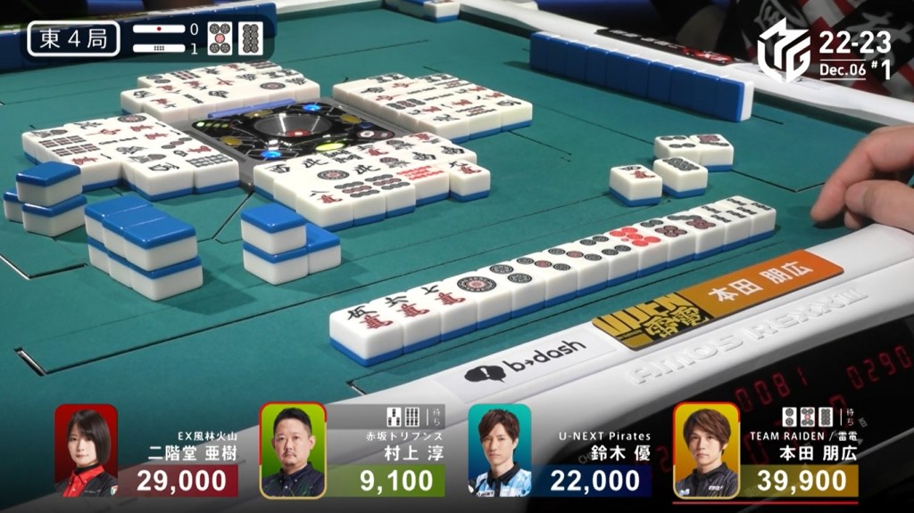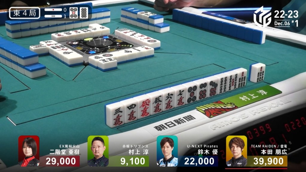 After a few turns of misses, Murakami draws the 4m in the middle of the third row and deals into Honda. Honda wins the hand with Riichi/Pinfu/Dora 1/Aka 1 for 12,000 plus Murakami’s riichi stick.