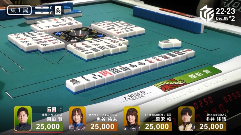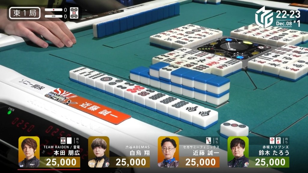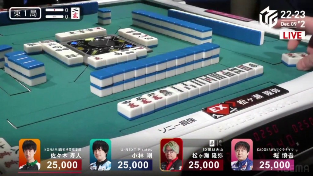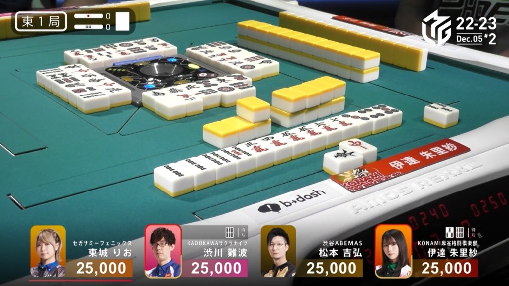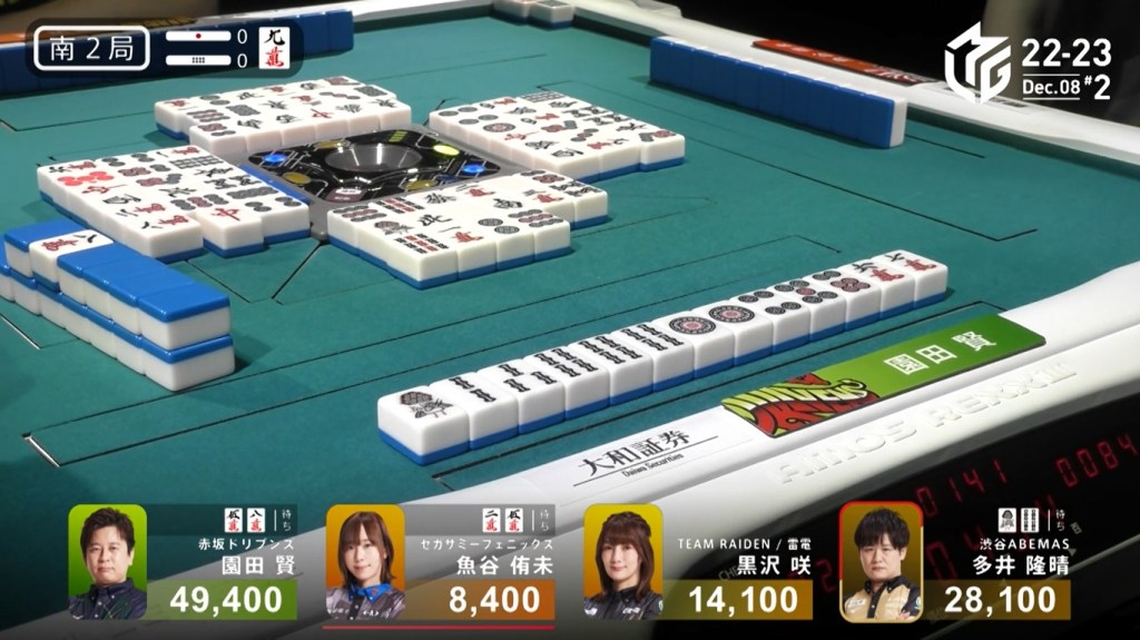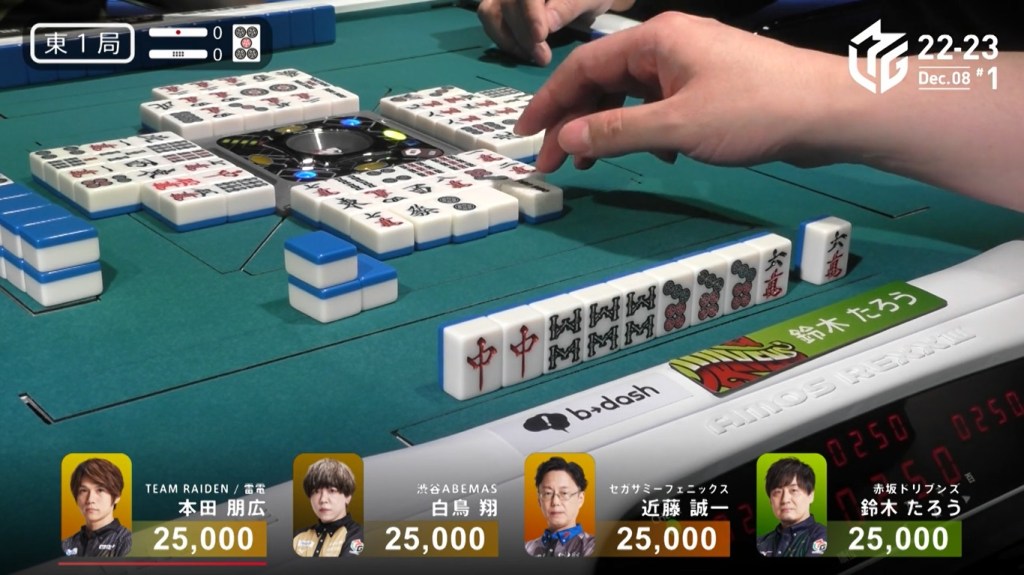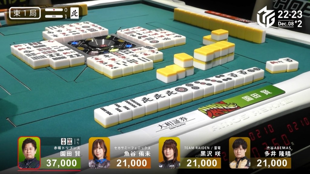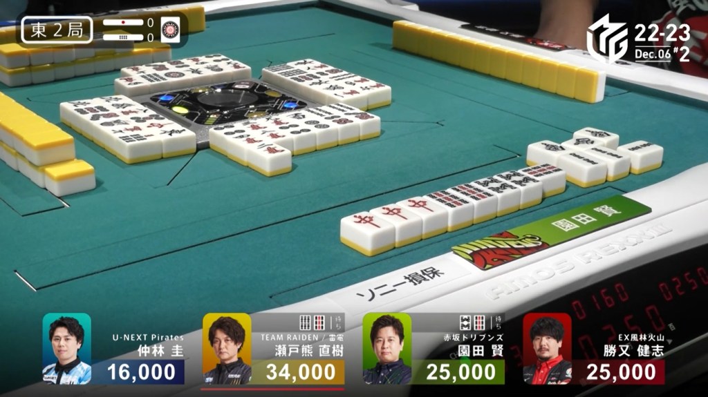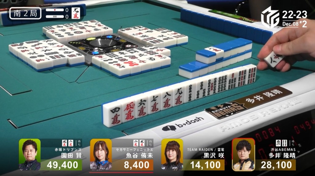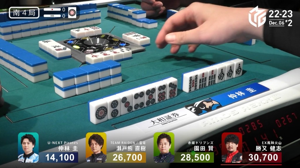 After a few turns of misses, Murakami draws the 4m in the middle of the third row and deals into Honda. Honda wins the hand with Riichi/Pinfu/Dora 1/Aka 1 for 12,000 plus Murakami’s riichi stick.