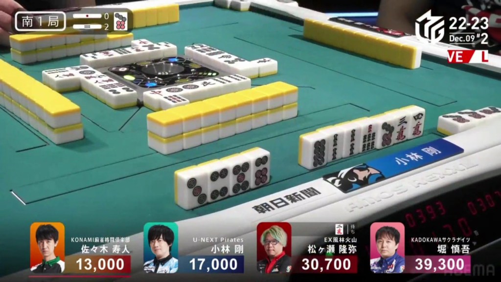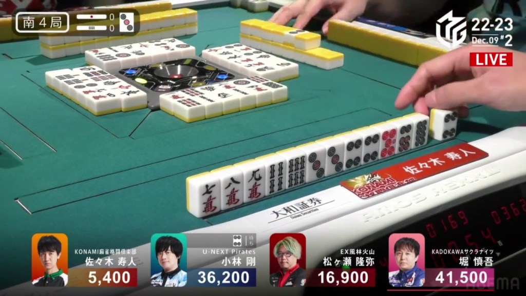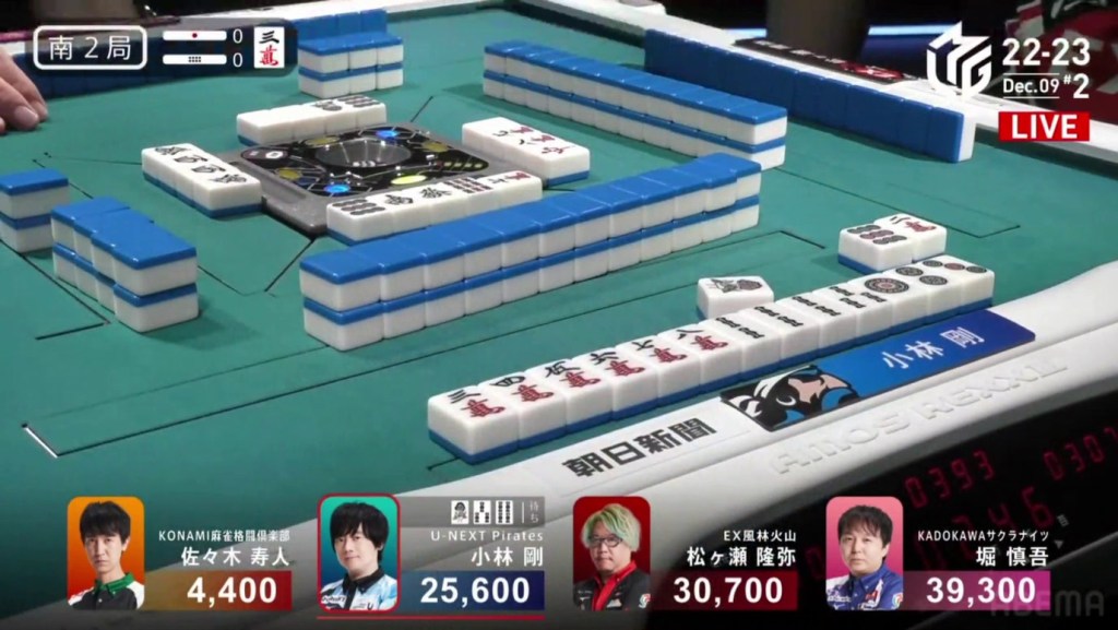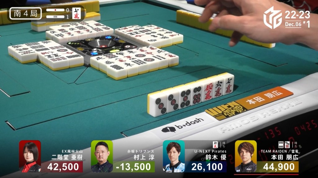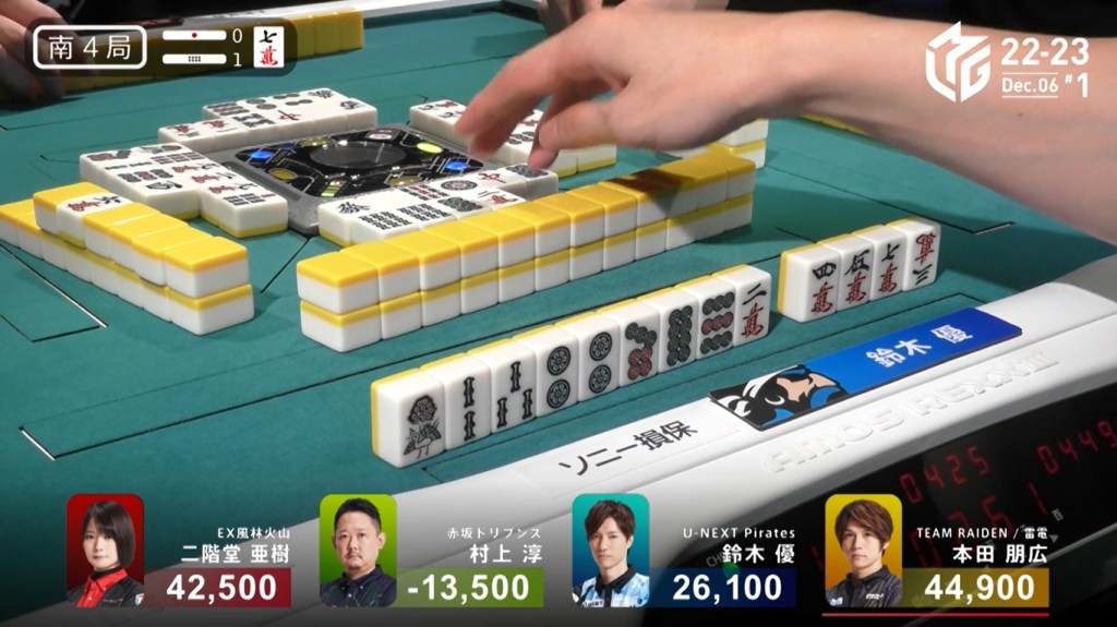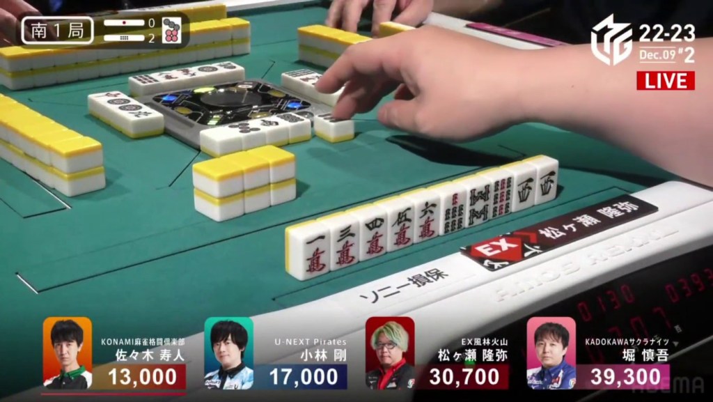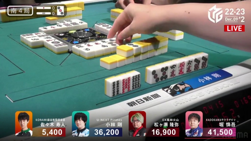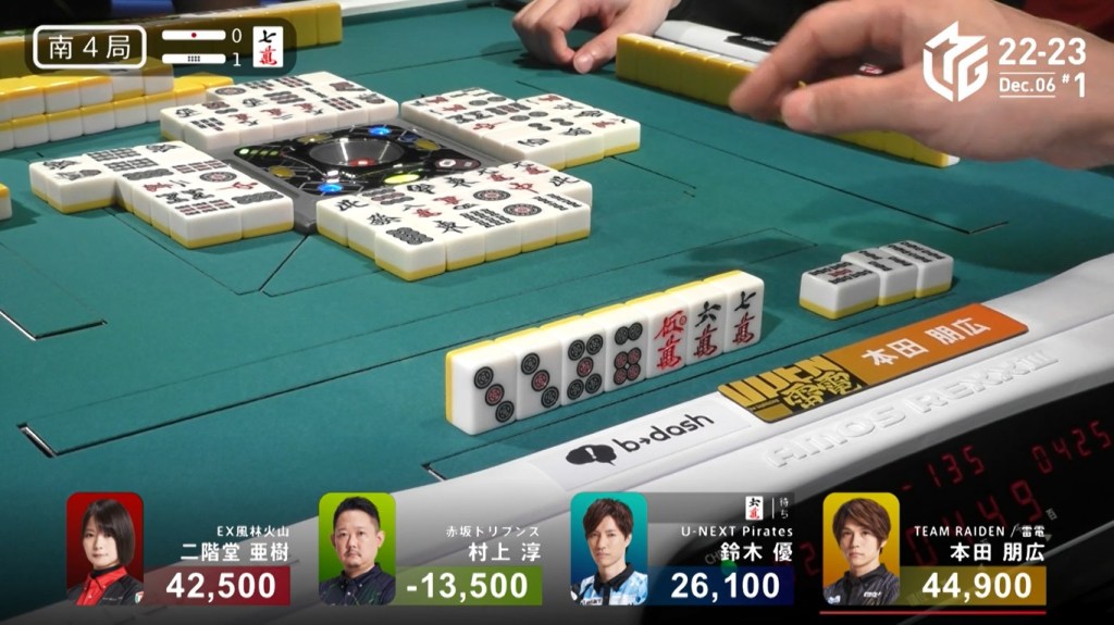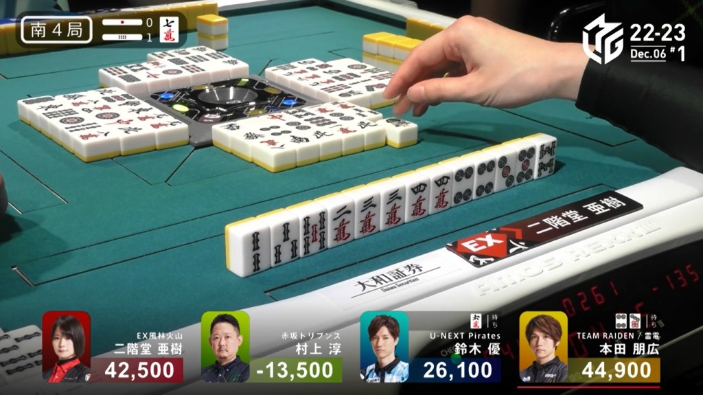 Two draws later, Kobayashi draws the 7p to win the hand and complete the comeback. Kobayashi wins with Tanyao/Aka 2 for 1,000/2,000 to move ahead of Hori by 700 and mark the team’s first back-to-back 1sts this season.