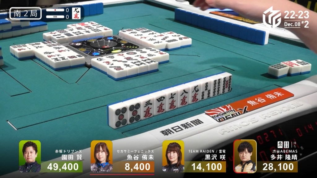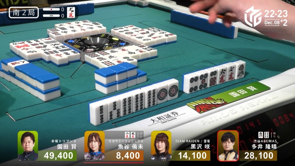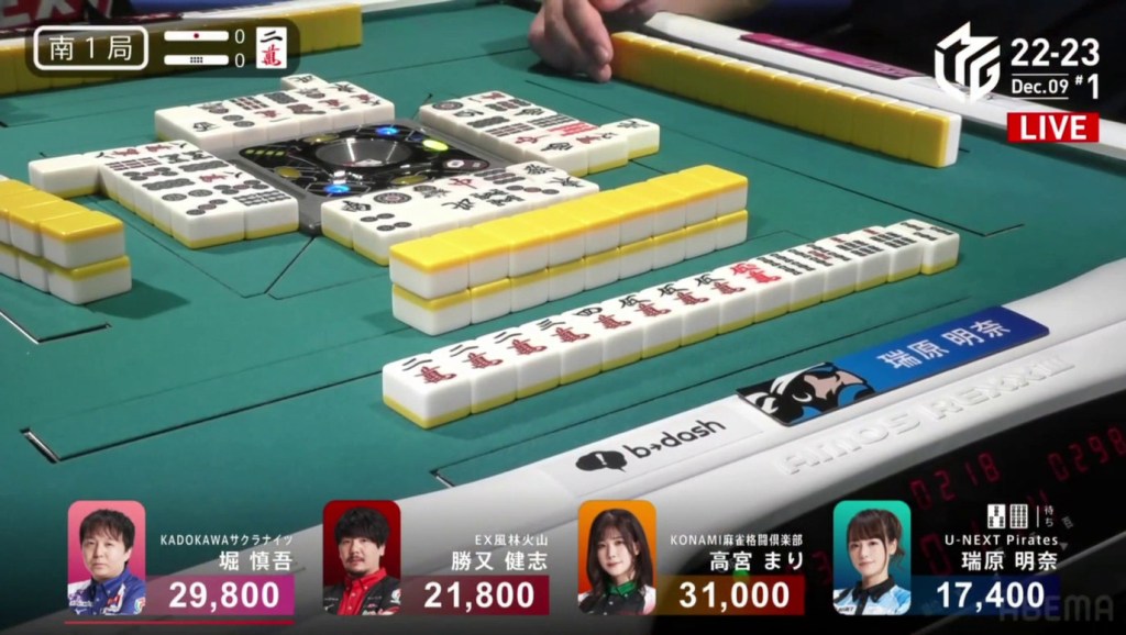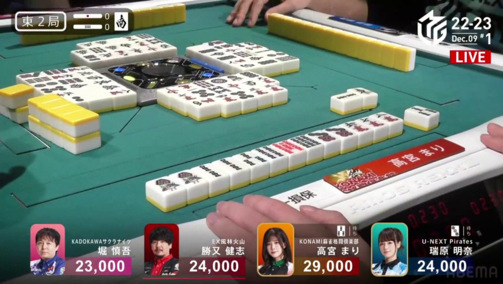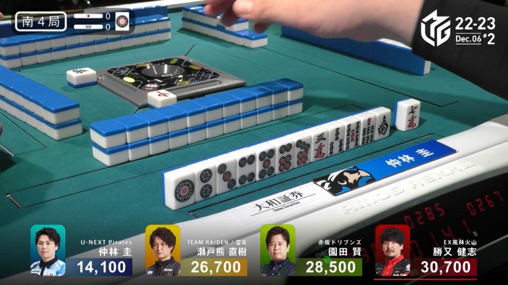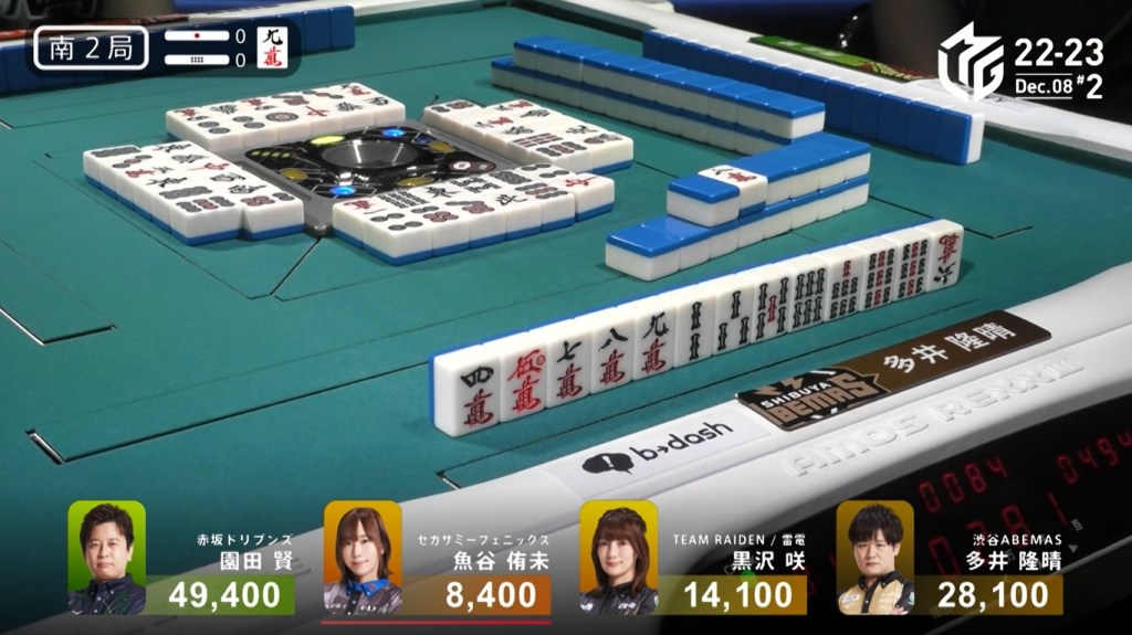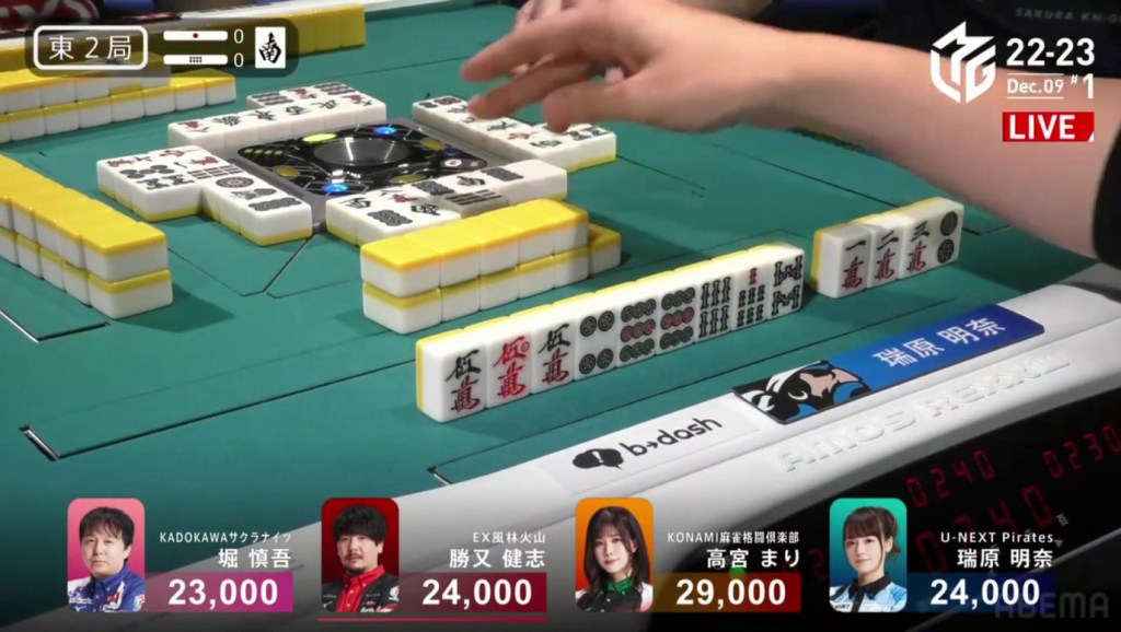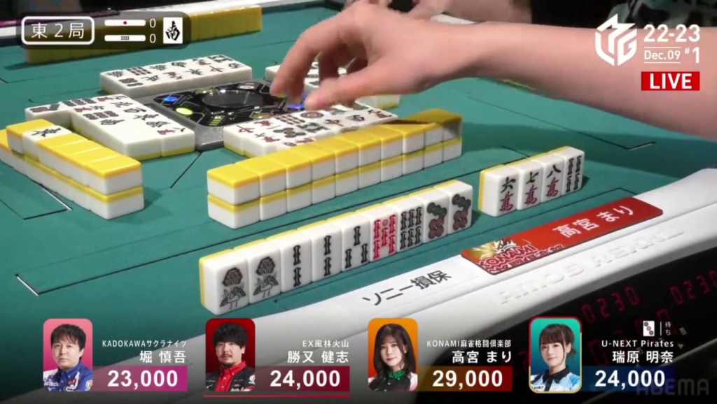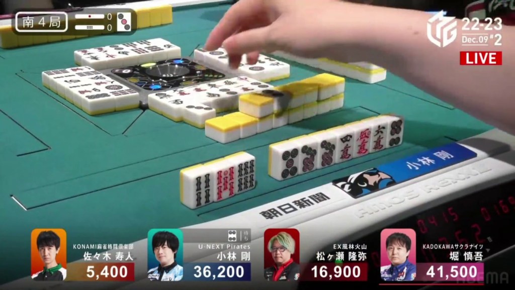 Two draws later, Kobayashi draws the 7p to win the hand and complete the comeback. Kobayashi wins with Tanyao/Aka 2 for 1,000/2,000 to move ahead of Hori by 700 and mark the team’s first back-to-back 1sts this season.