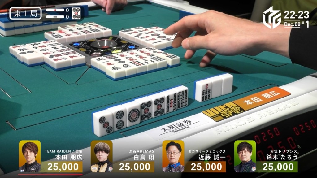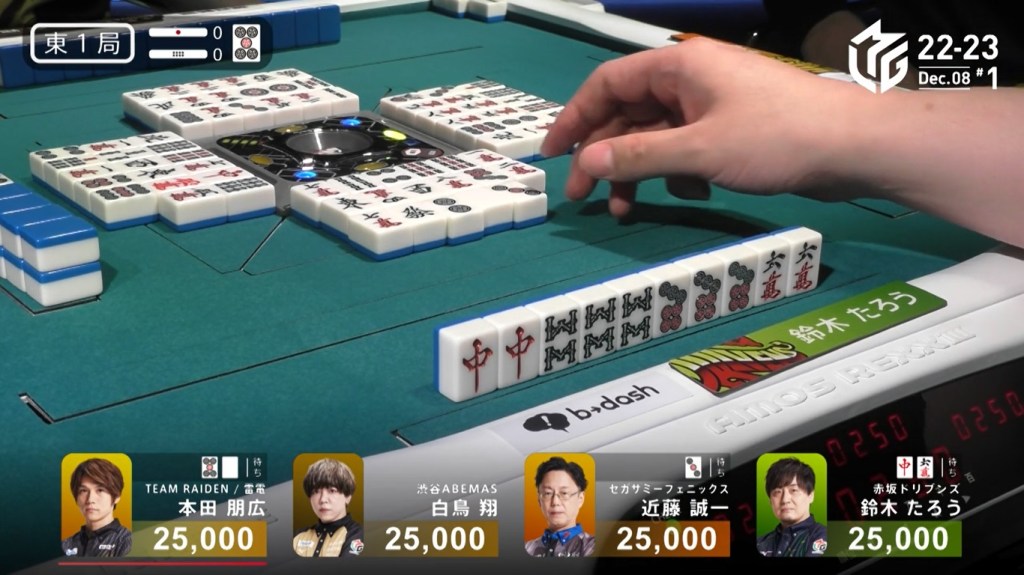 When we look around the table, we see a pair of green dragons stuck in Taro’s hand and a red 5m in Honda’s, meaning that there was only one tile left in the wall to give Kondo the win. However, one tile is all he needs. With every draw, we wanted to see Kondo win the yakuman. In the middle of the third row, the last 5m was drawn… by Taro. Yelling, Hiyoshi said that the 5m was shifted away from Kondo by Shiratori’s chii. With nobody else pushing, the hand naturally went to a draw with Kondo the only one tenpai.