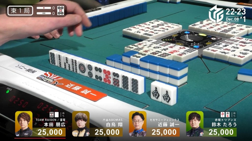 On Kondo’s last draw, he gets to tenpai as well and waits on a 3p penchan.