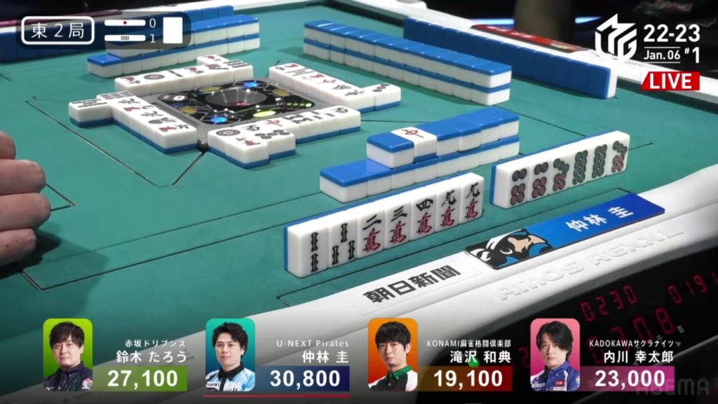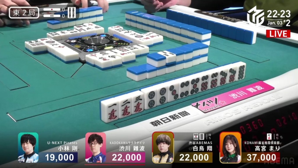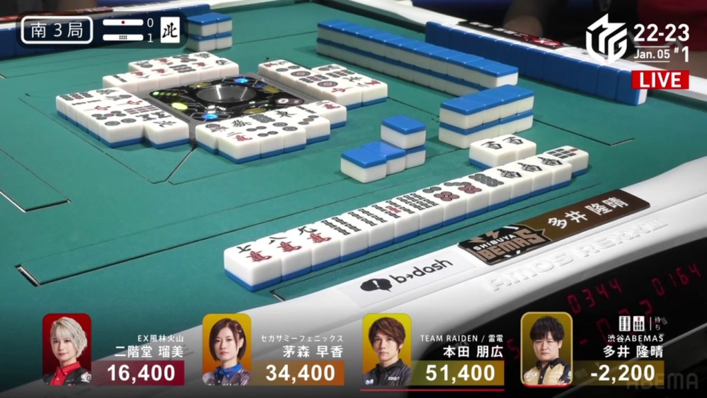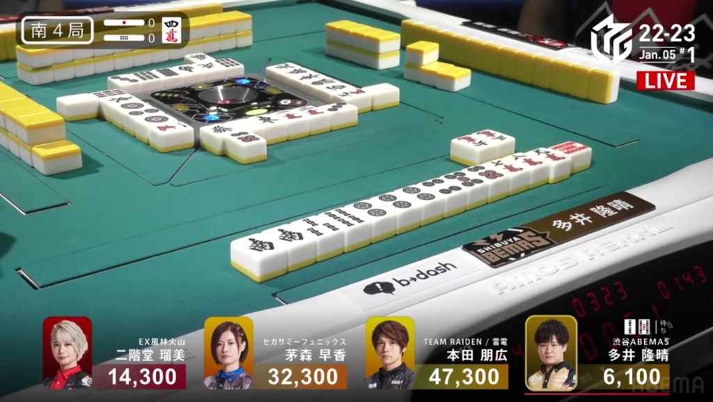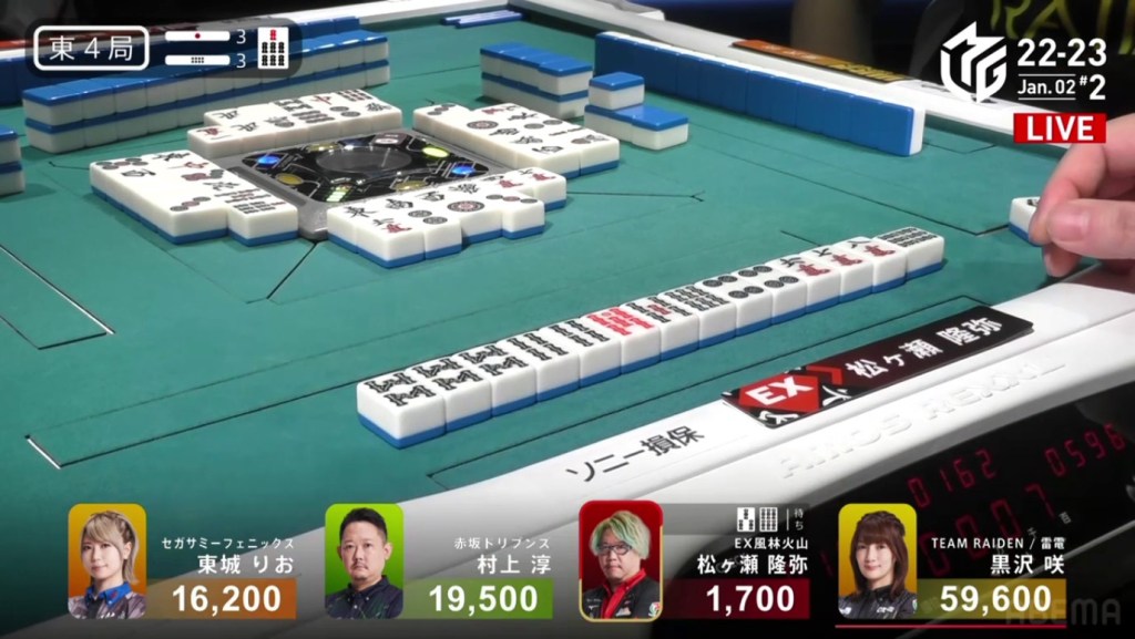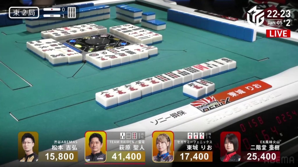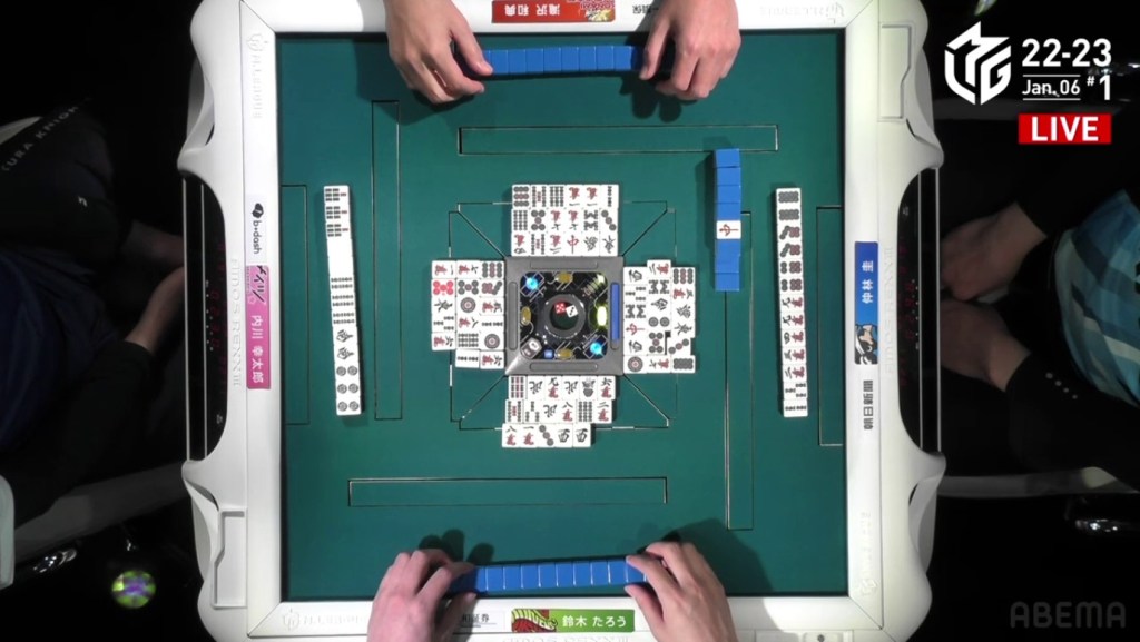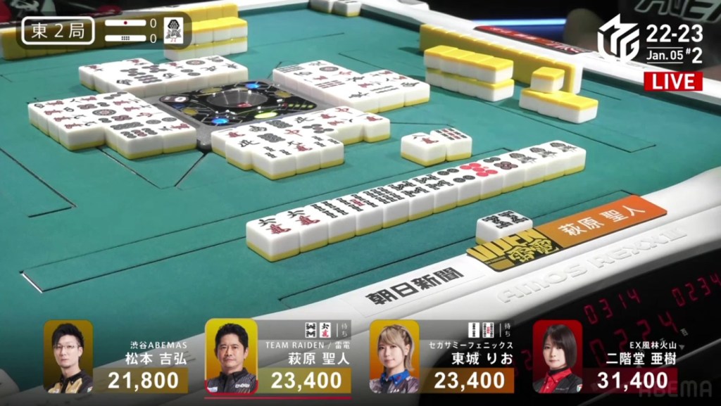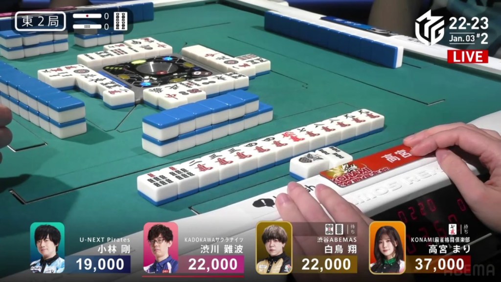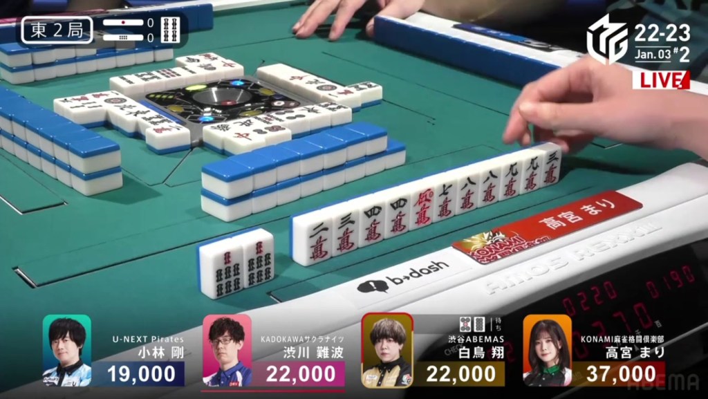 For Hagiwara, a 3 han hand or a 2 han tsumo is enough for top spot. For Aki and Tojo, any win is good (albeit for different reason). For Matsumoto, a big hand would be nice, even though it probably wouldn’t change his placement.