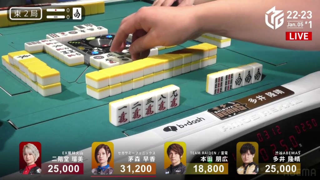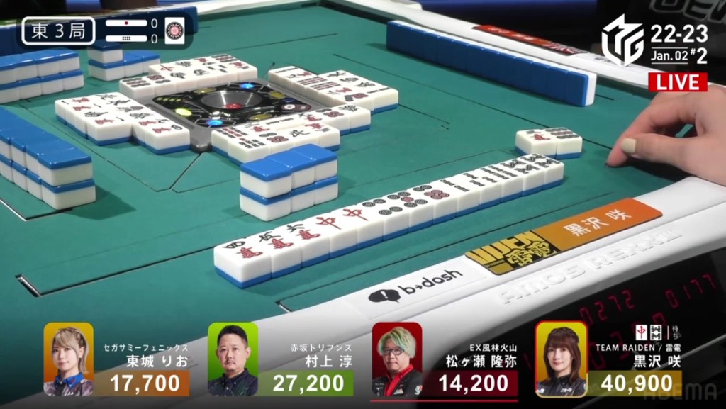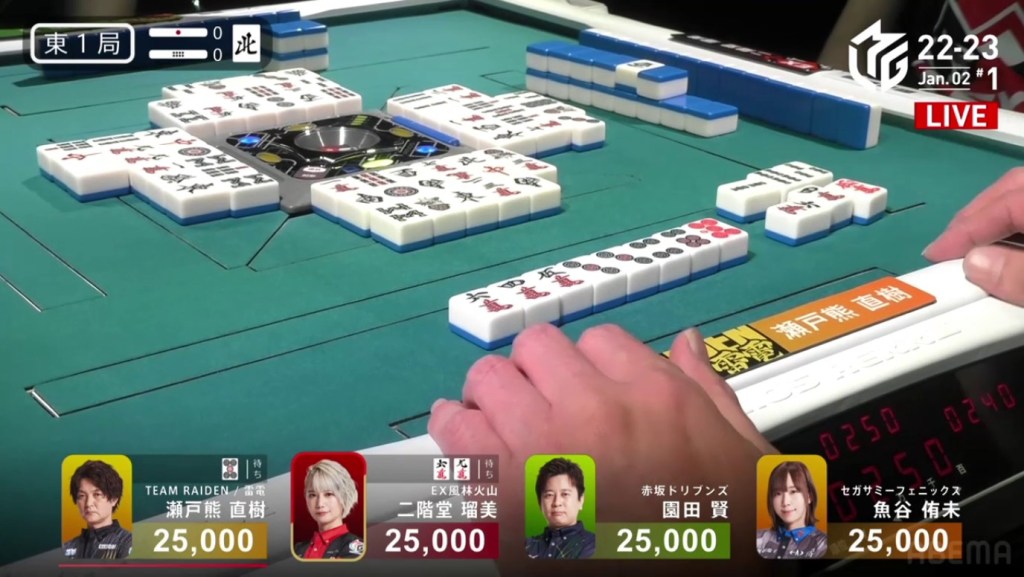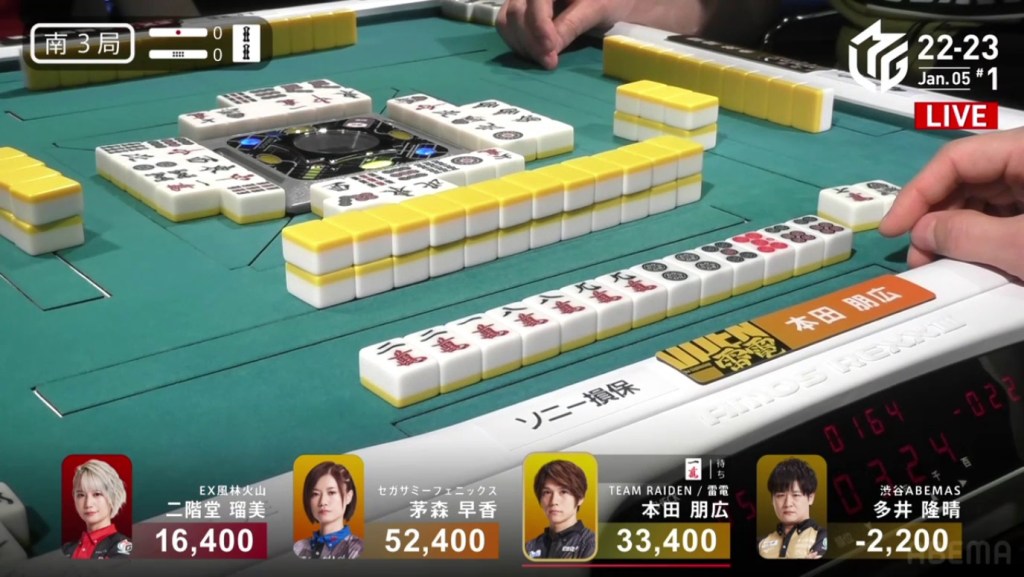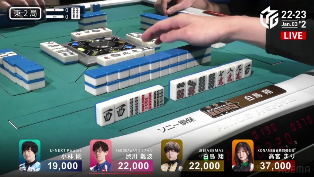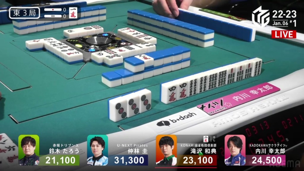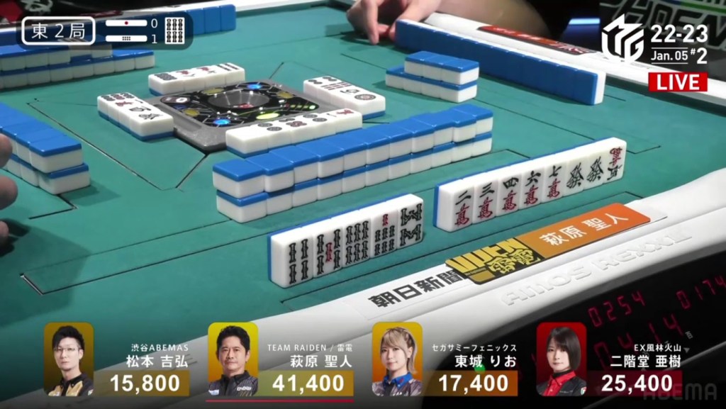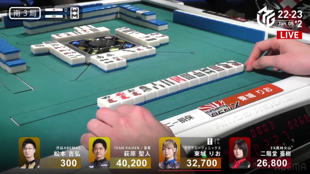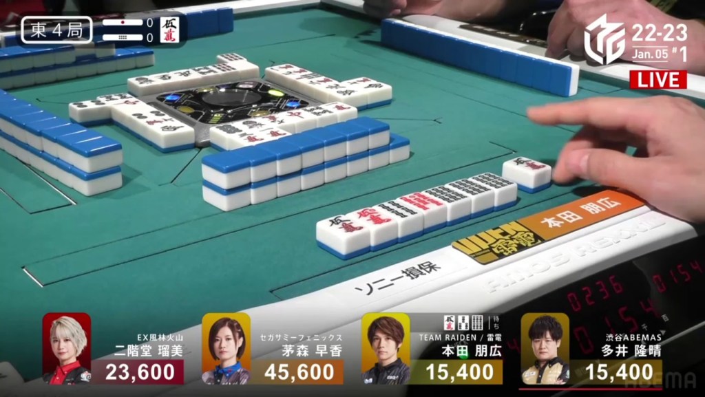 For Hagiwara, a 3 han hand or a 2 han tsumo is enough for top spot. For Aki and Tojo, any win is good (albeit for different reason). For Matsumoto, a big hand would be nice, even though it probably wouldn’t change his placement.