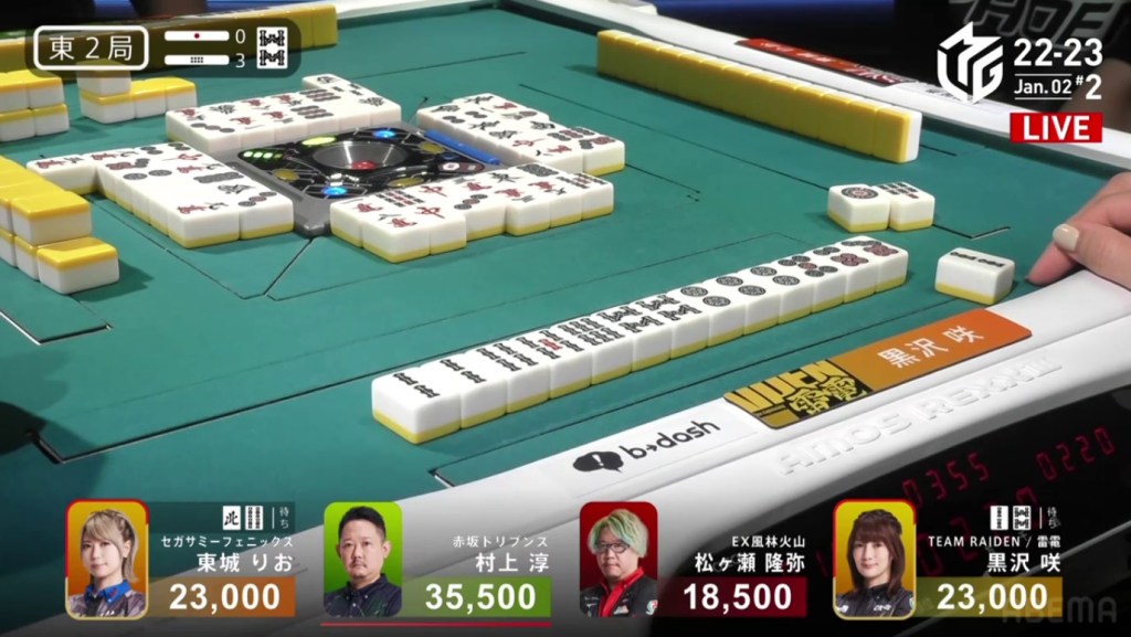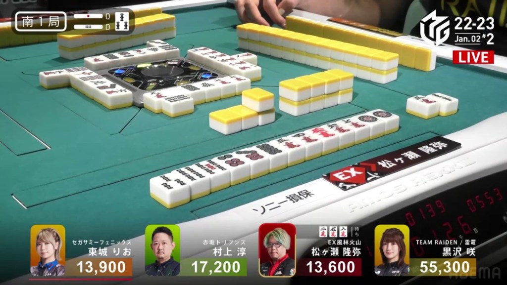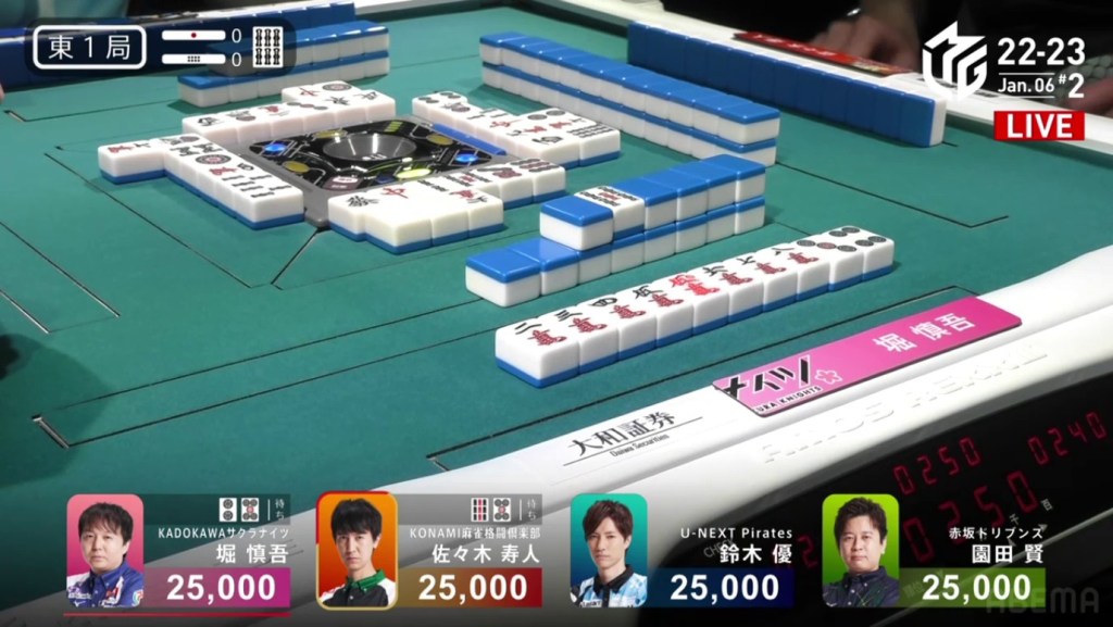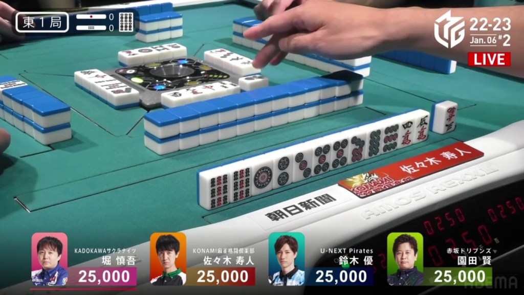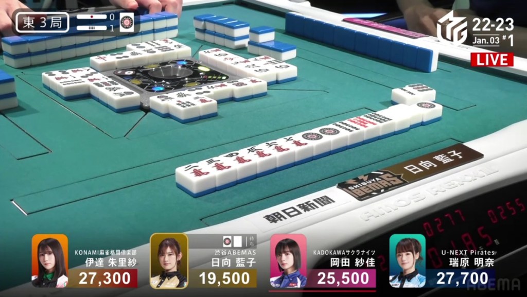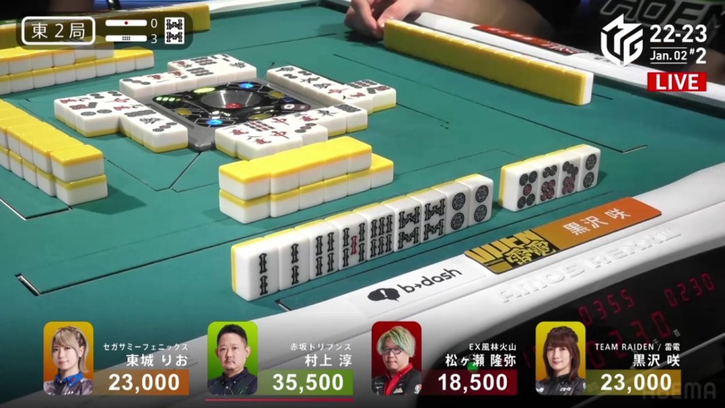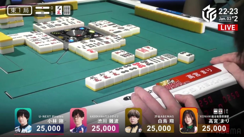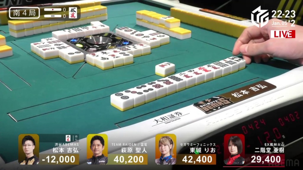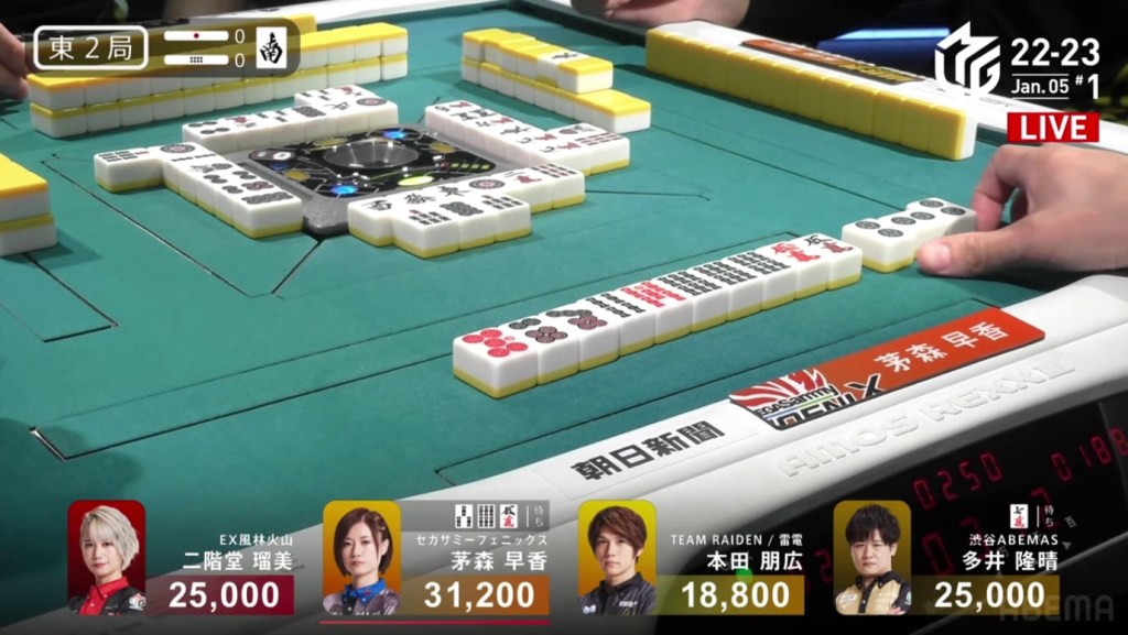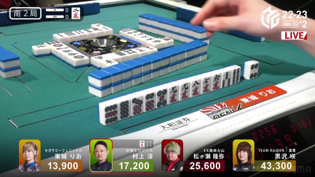 For Hagiwara, a 3 han hand or a 2 han tsumo is enough for top spot. For Aki and Tojo, any win is good (albeit for different reason). For Matsumoto, a big hand would be nice, even though it probably wouldn’t change his placement.
