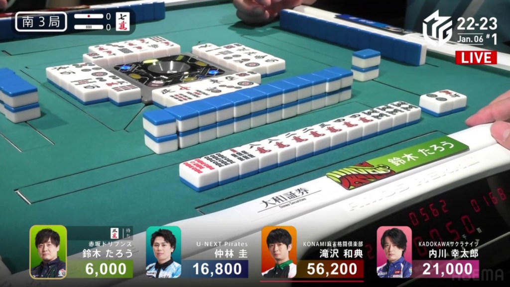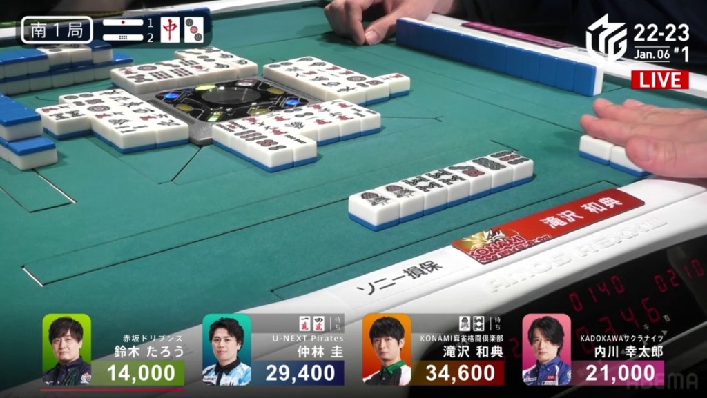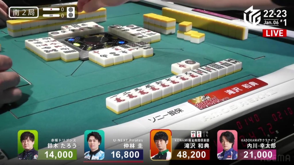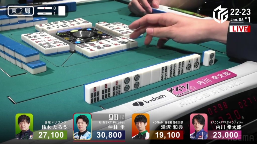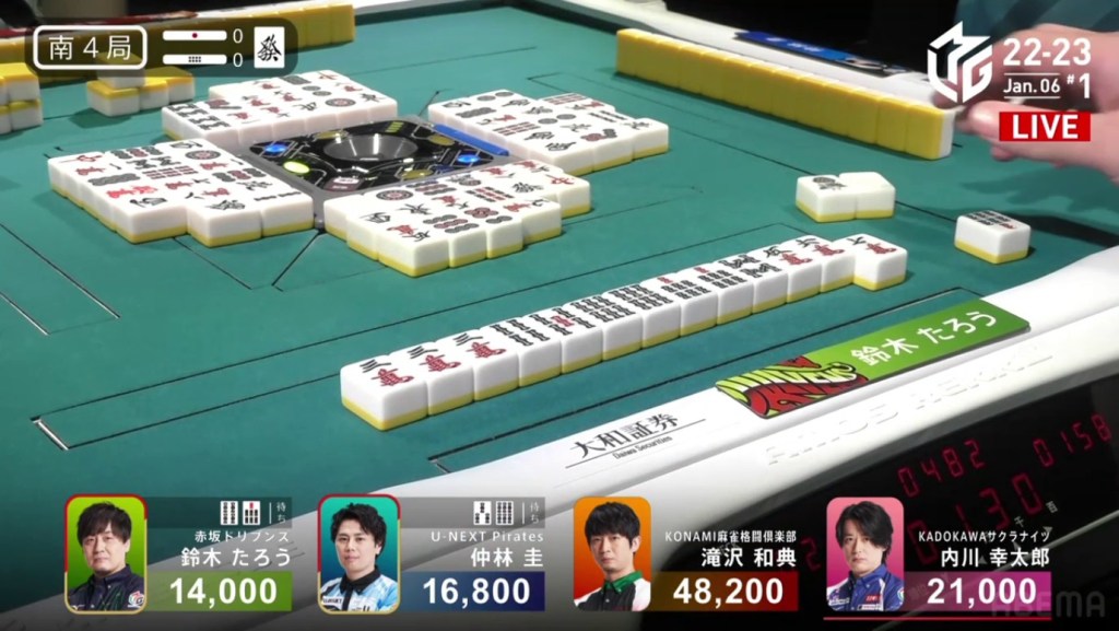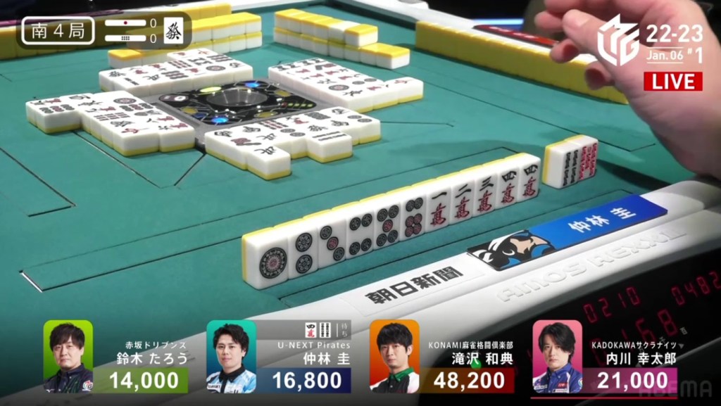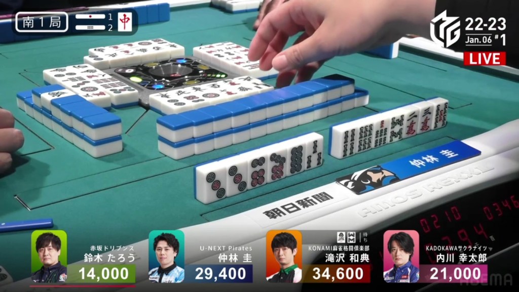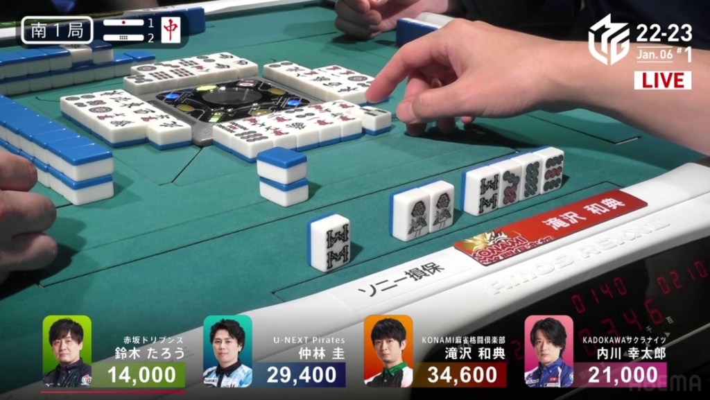 At this point, Taro is iishanten with tanyao. On the ippatsu turn, Taro gets to tenpai. Because of the riichi stick, a riichi is no longer required to move into 3rd. With this in mind, Taro chooses to stay dama, holding someone will throw the 4s which is safe against Nakabayashi. After one turn of dama, Taro chooses to call riichi and wait on the 47s nobetan. If Taro can draw his tile on the ippatsu turn, Taro will move into 2nd. Sure enough, on Taro’s ippatsu turn, Taro finds the 7s and wins the hand. Taro wins with Riichi/Ippatsu/Tsumo/Tanyao for 2,000/4,000, finishing the game in 2nd place.