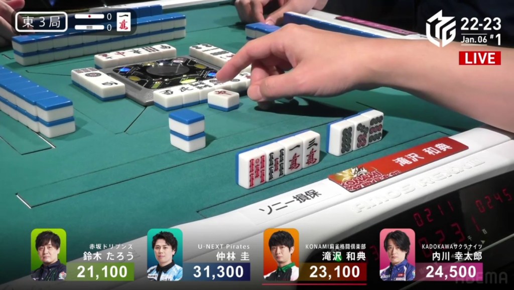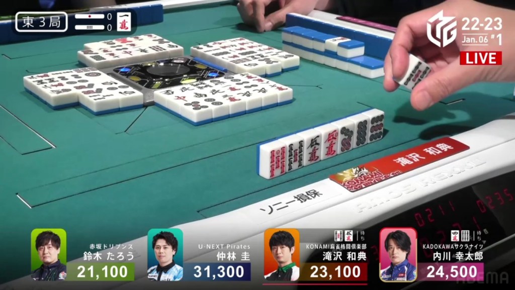 Uchikawa isn’t the only threat on the table, though. Just a turn earlier, Takizawa drew to a 2m kanchan tenpai.