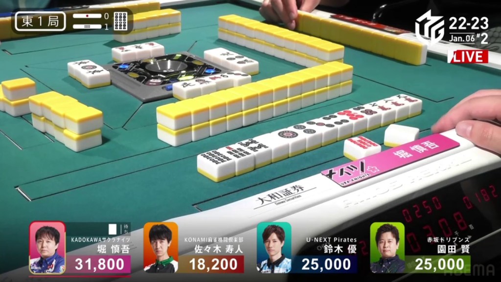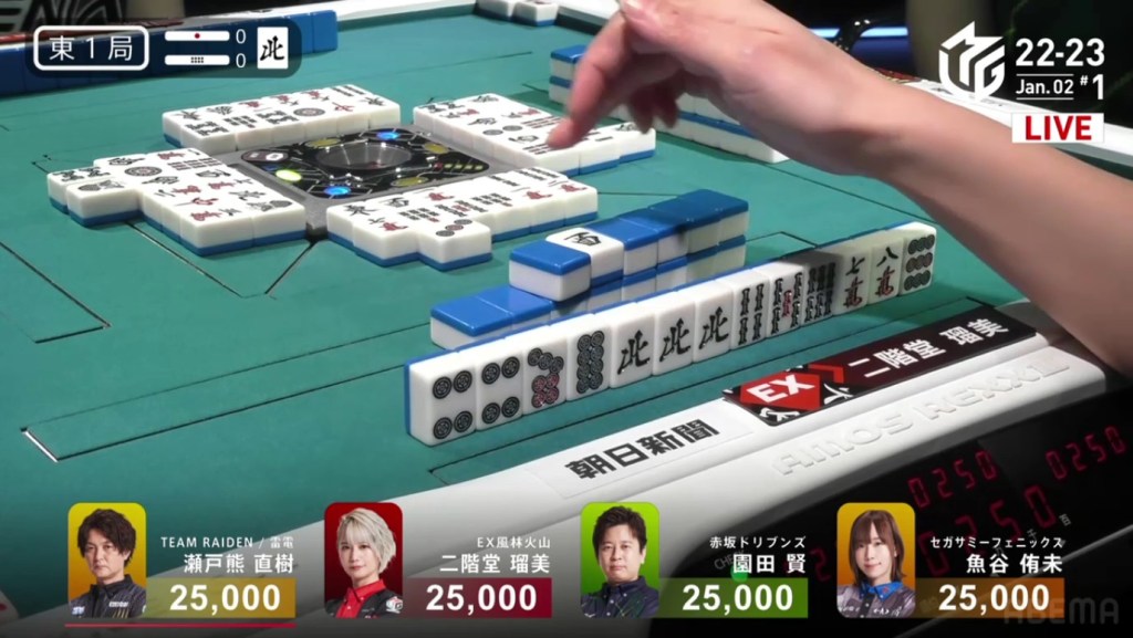 In E1-0, players came back for the first game of 2023. Setokuma starts out as the first dealer and starts out 3-shanten. Shifting his hand to tanyao, Setokuma gets himself to 2-shanten. After some waiting, Setokuma got tired and made a call in the middle of the second row. While Setokuma’s hand stalled, Rumi’s expensive hand advanced. Holding an ankou of north doras, Rumi gets to tenpai at the start of the third row and calls riichi on a 69m ryanmen.