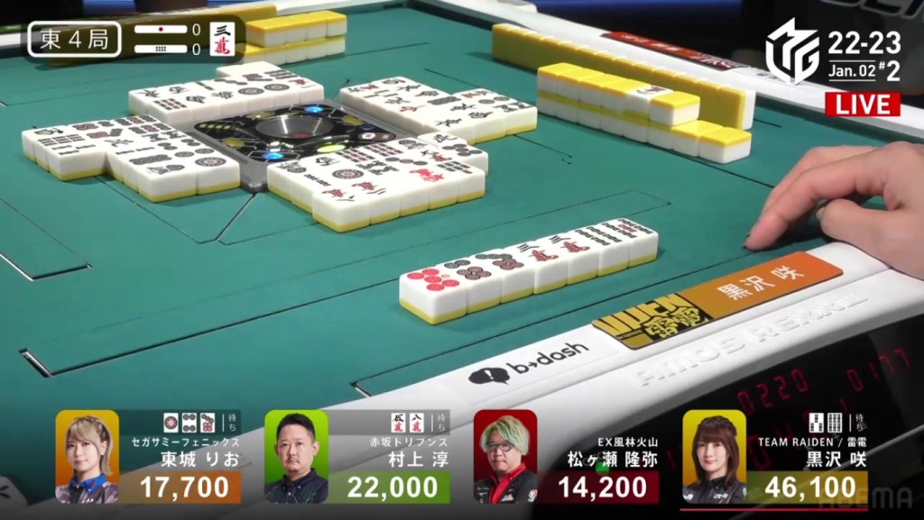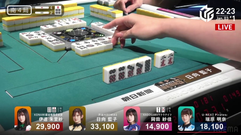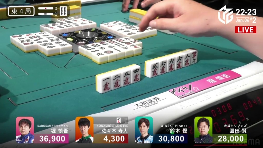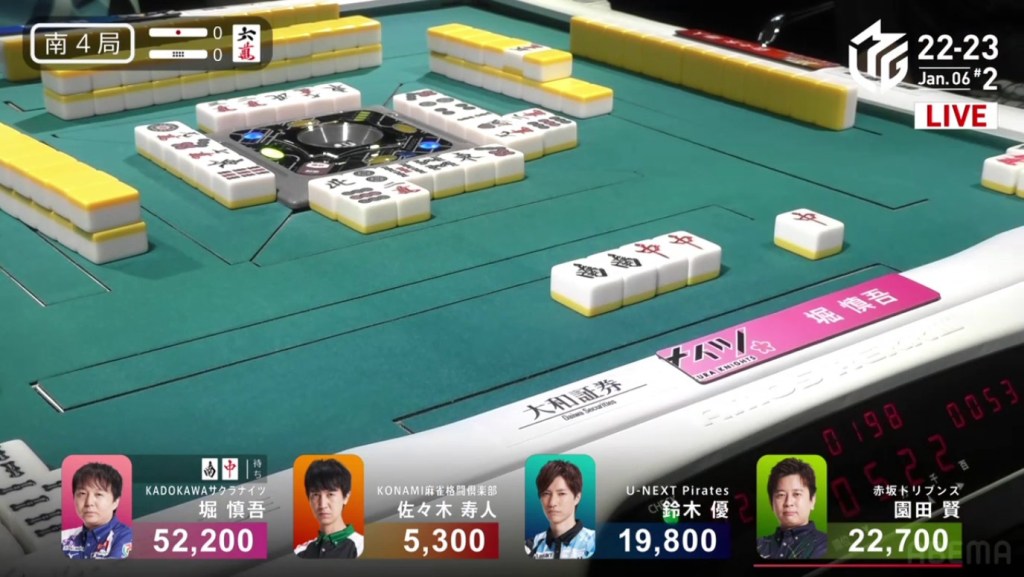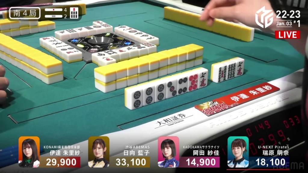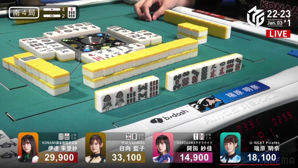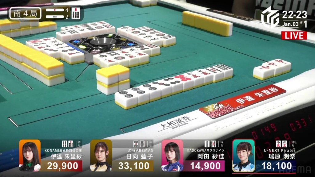 In S4-2, Hinata is in 1st place with 33,100, Date is 2nd with 29,900, Mizuhara is 3rd with 18,100 and Okada is 4th with 14,900. With 4,600 in bonus sticks up for grabs and scores being decently close, everyone has something to gain and something to lose this hand.