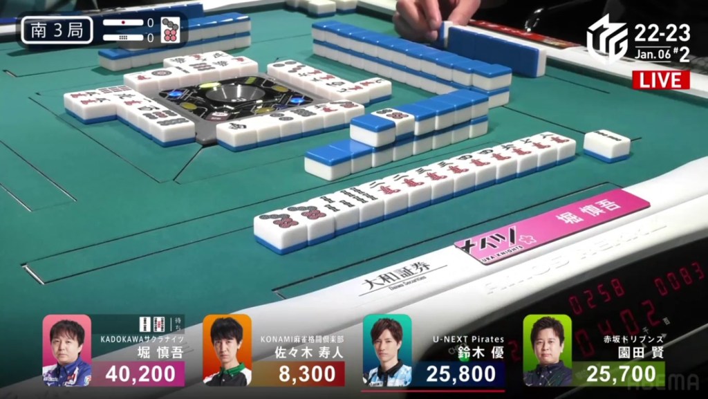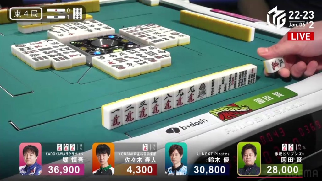 Hori wins the hand with Houtei/Honitsu/Red Dragon for 8,000+300 plus Sonoda’s riichi stick, putting Hori above 45,000.