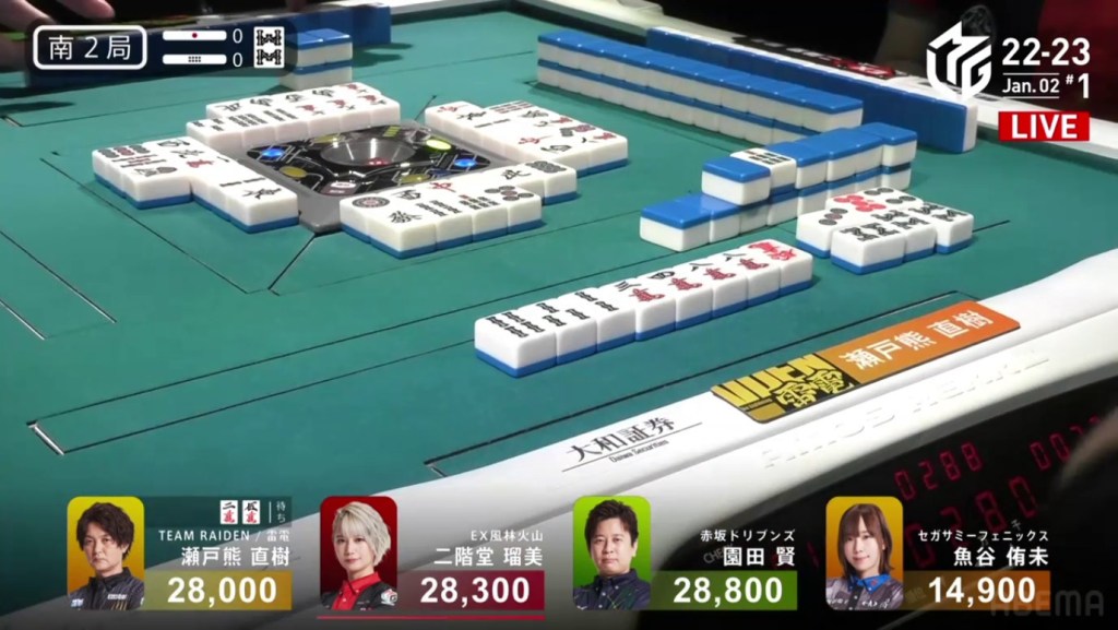 Uchikawa, who holds no safe tiles against Nakabayashi, is lucky to draw a safe tile on the ippatsu turn. Though Nakabayashi throws the 2p and south during hist next two turns, Uchikawa neither calls pon on them nor breaks his own hand. Later in the second row, Uchikawa draws a 7s to create a second ankou and putting him iishanten for a possible suuankou. At the start of the third row, Uchikawa draws a 2p to create a third ankou. Uchikawa discards his last tile and waits tenpai on a south/white dragon shanpon. If Uchikawa draws the last tile himself, he would win a suuankou, the same hand that was won during the last M-League public viewing. Though two white dragons are stuck in the hands of other players and a south has already been discarded, it means that there is one south left in the wall. All Uchikawa needs is that one south.