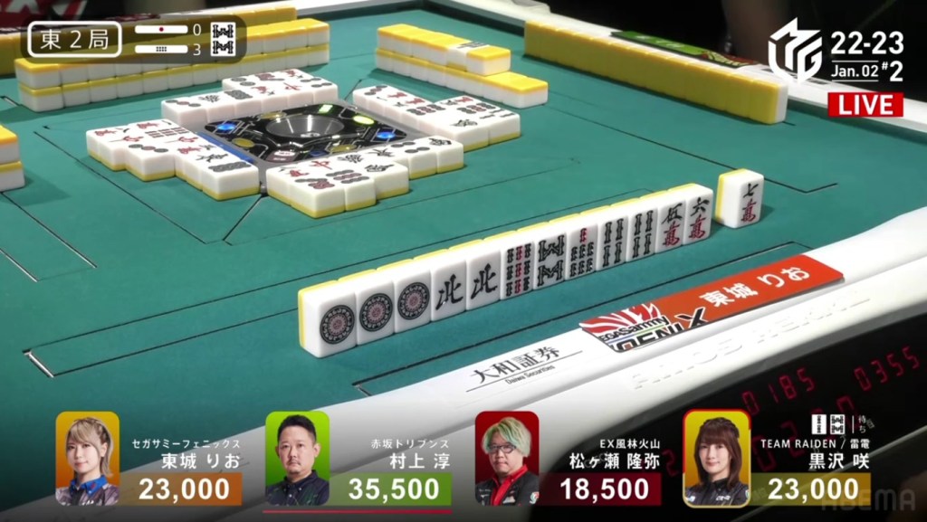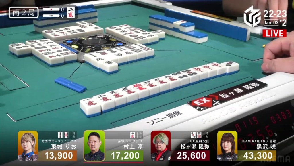 In S2-0, Matsugase is now in 2nd place and within 17,700 of 1st place. He starts out the hand 3-shanten with a pair of red dragons a red 5m and a 2m dora. To his left is 3rd place dealer Murakami and to Murakami’s left is 4th place Tojo. Both Murakami and Tojo were 3-shanten with their haipais as well. Through the first row, both Murakami and Tojo had their hands advance quickly, getting to iishanten by turn 5. At the start of the second row, Murakami gets to tenpai and calls riichi on a 2m kanchan.