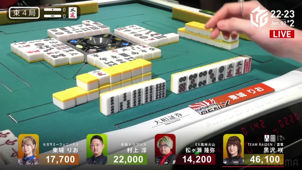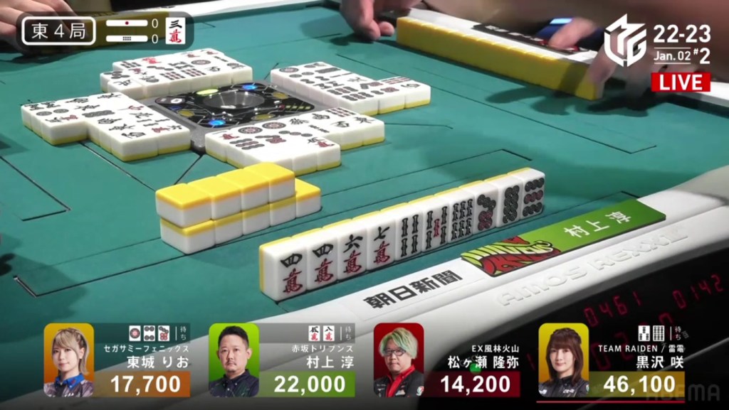 Immediately after, Murakami calls chii to get to a yakuless tenpai on a 58m ryanmen. On Murakami’s next draw, he finds the 5m but can’t call tsumo without a yaku. Since Kurosawa appears to be the largest threat, he discards the safe 5m against her.