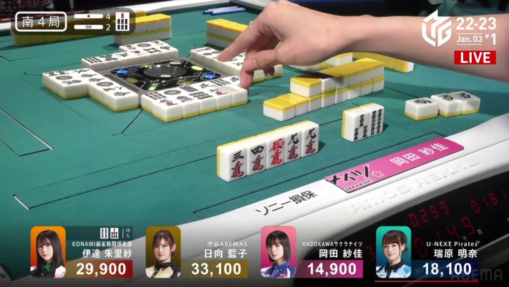 As Okada got to tenpai, she discarded the white dragon. With the white dragon, Hinata called pon to get to tenpai on an 58p ryanmen. Since she is in 1st place, any win will secure her 1st.
