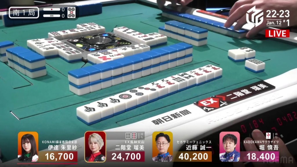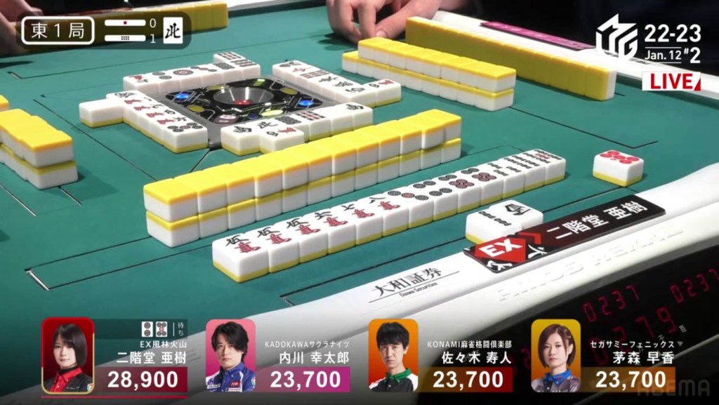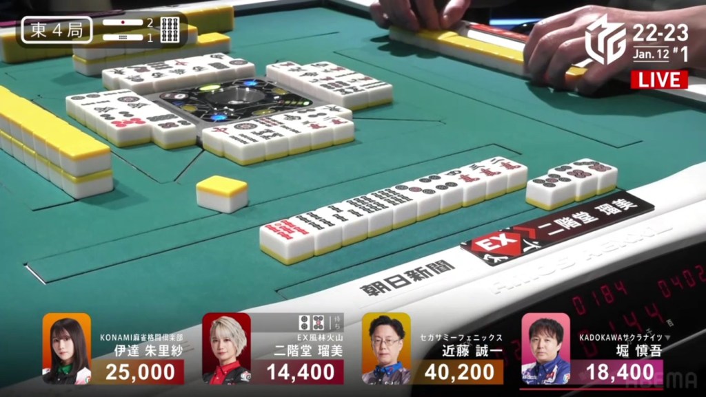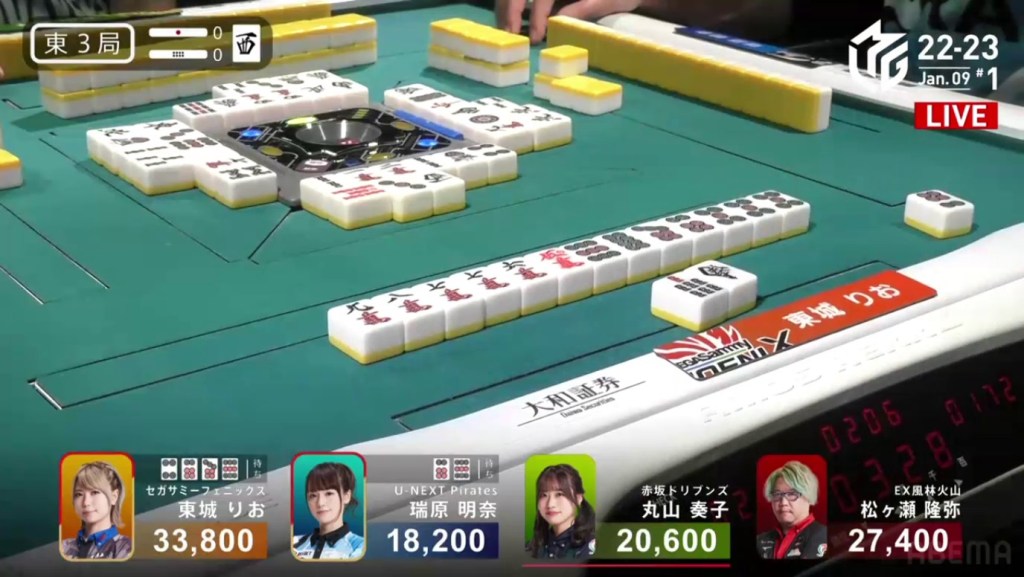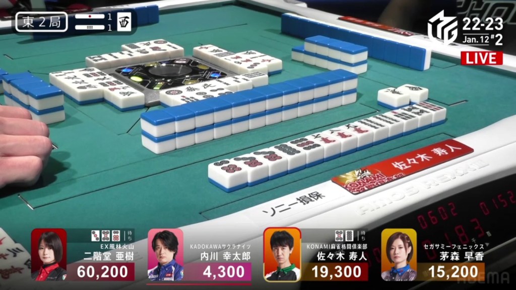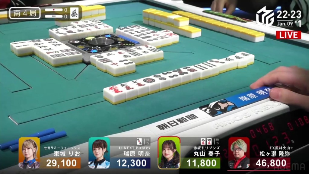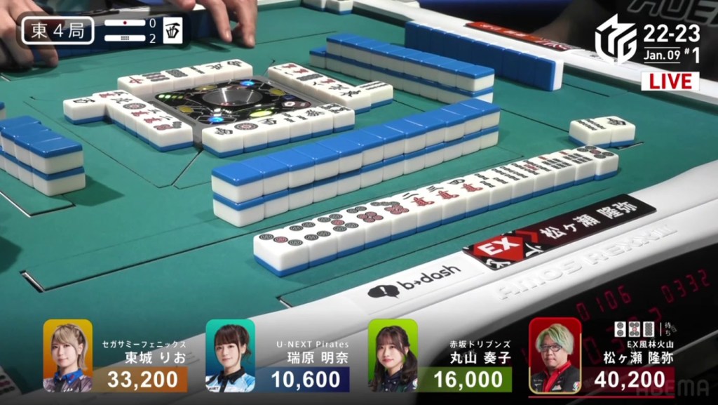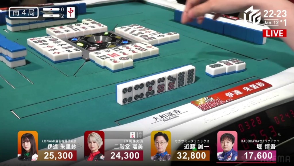With the stage set, it was a battle between the 4-sided furiten hand and the non-furiten ryanmen hand. Within Mizuhara’s ippatsu turn, Tojo draws her winning 6p. Tojo wins the hand with Riichi/Tsumo/Aka 1 for 1,000/2,000 plus Mizuhara’s riichi stick.
