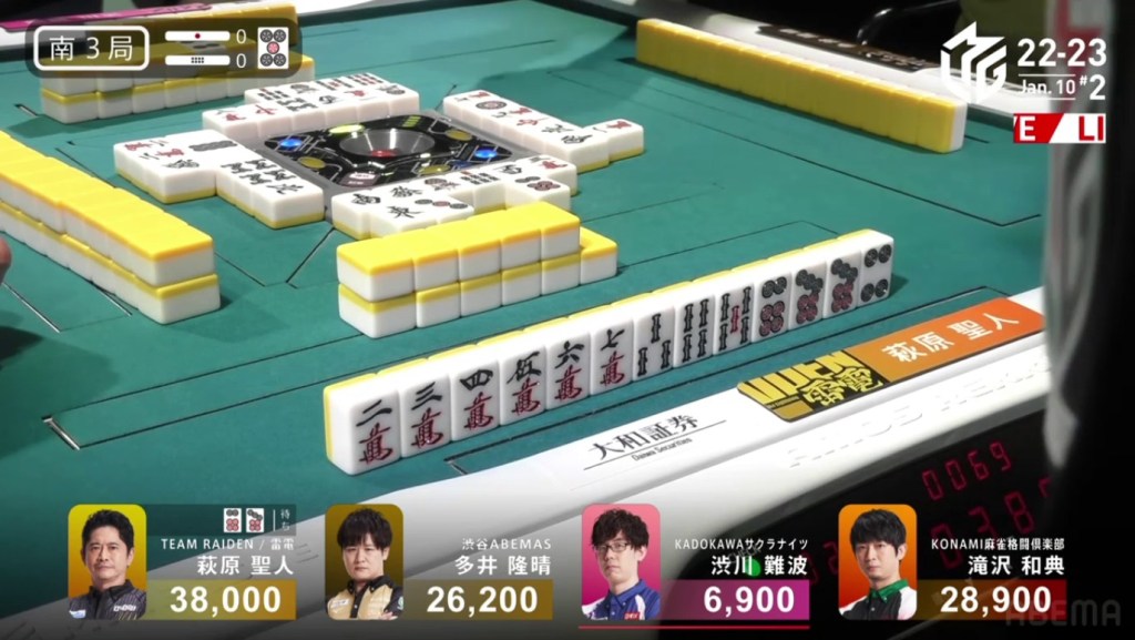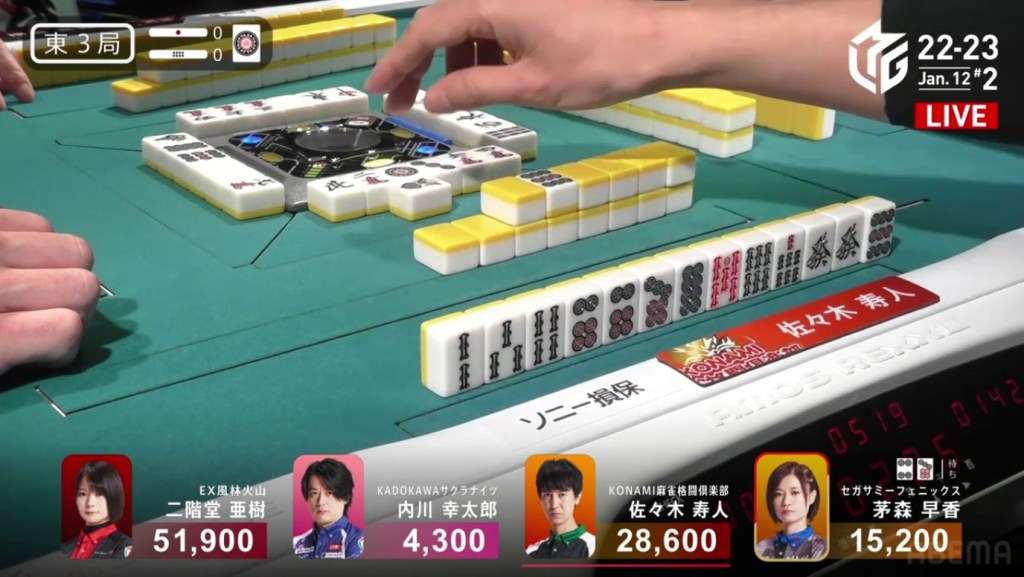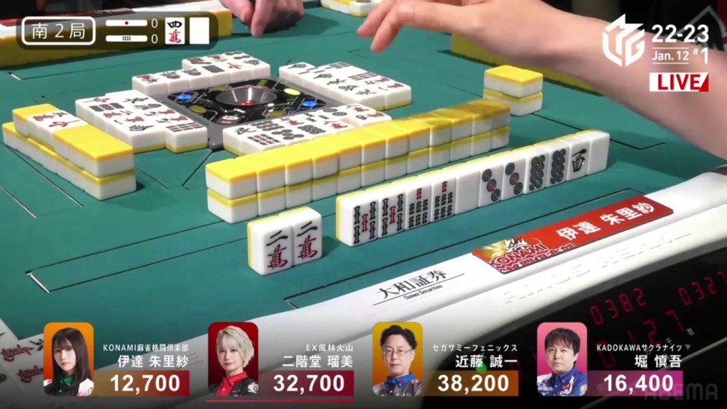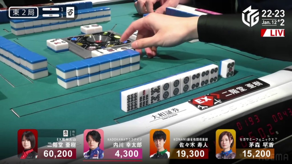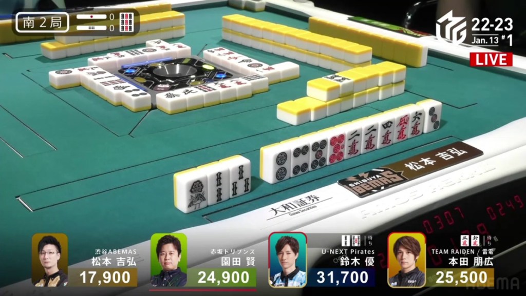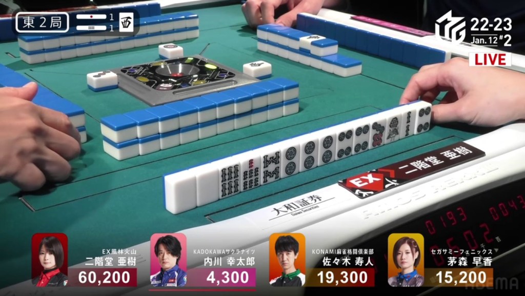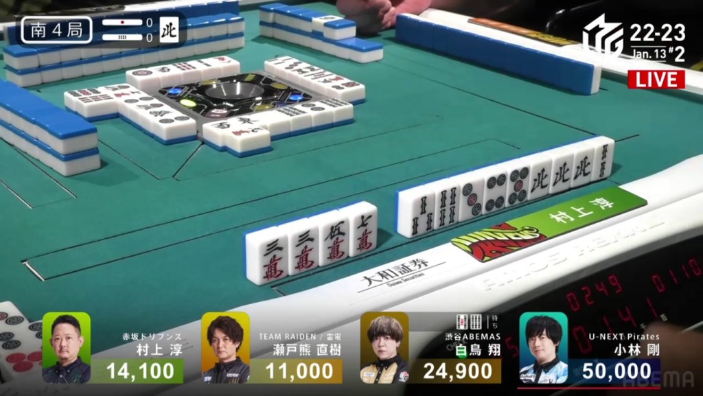 The two of them aren’t the only ones with placement at stake. Shiratori is sitting in 2nd place and holding his dealership. With a call near the end of the second row, Shiratori gets to tenpai and waits on a 36s ryanmen. On Shiratori’s next draw, he gets Murakami’s winning 2m. With it being dangerous, Shiratori chooses to fold his hand.
