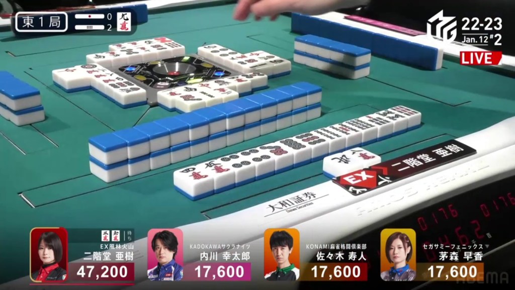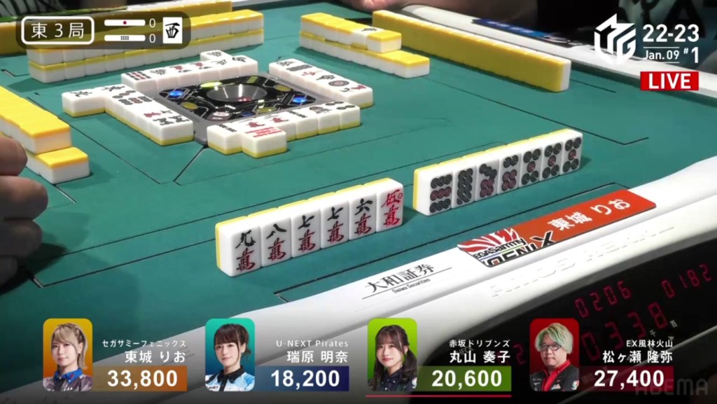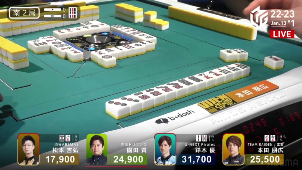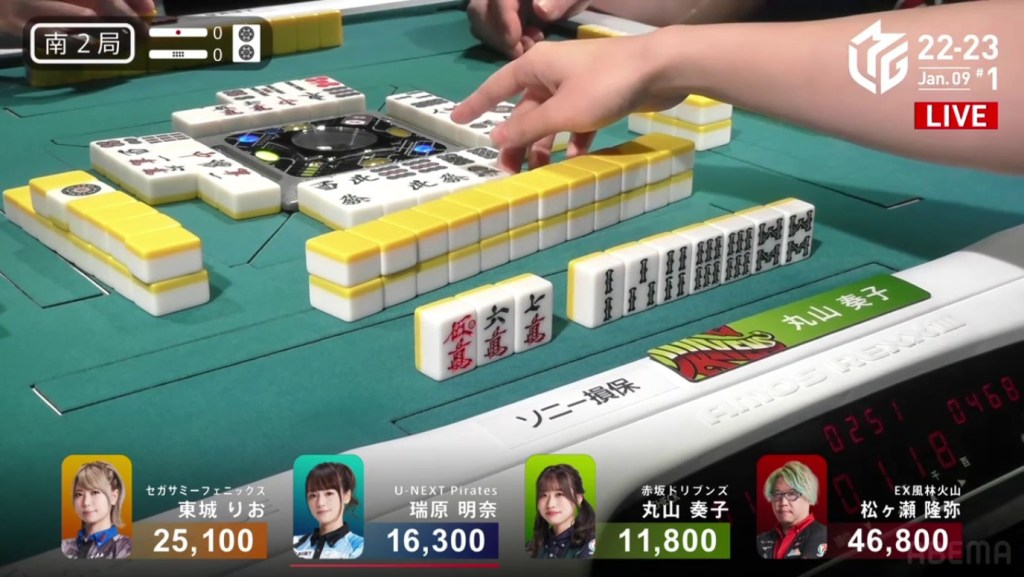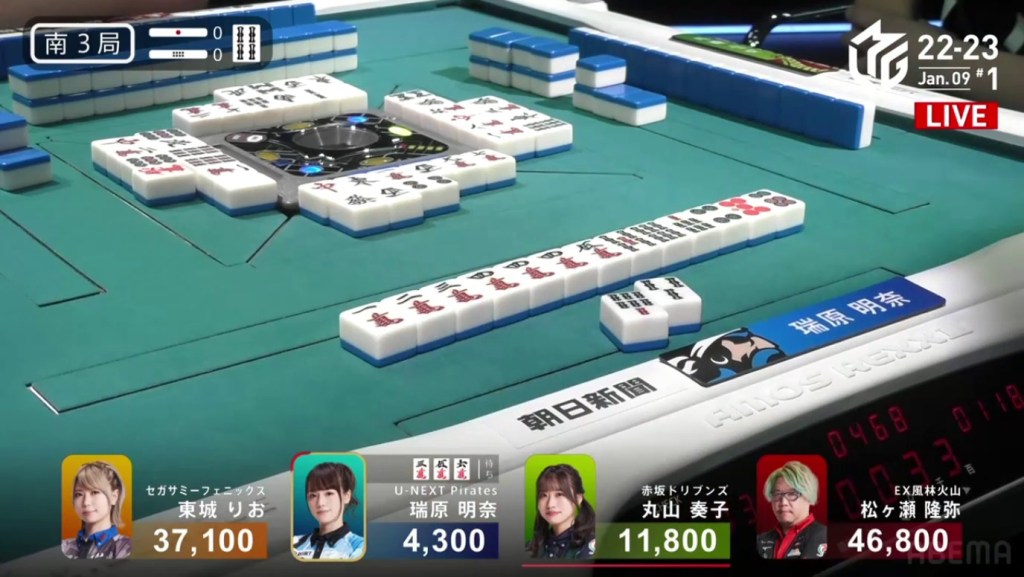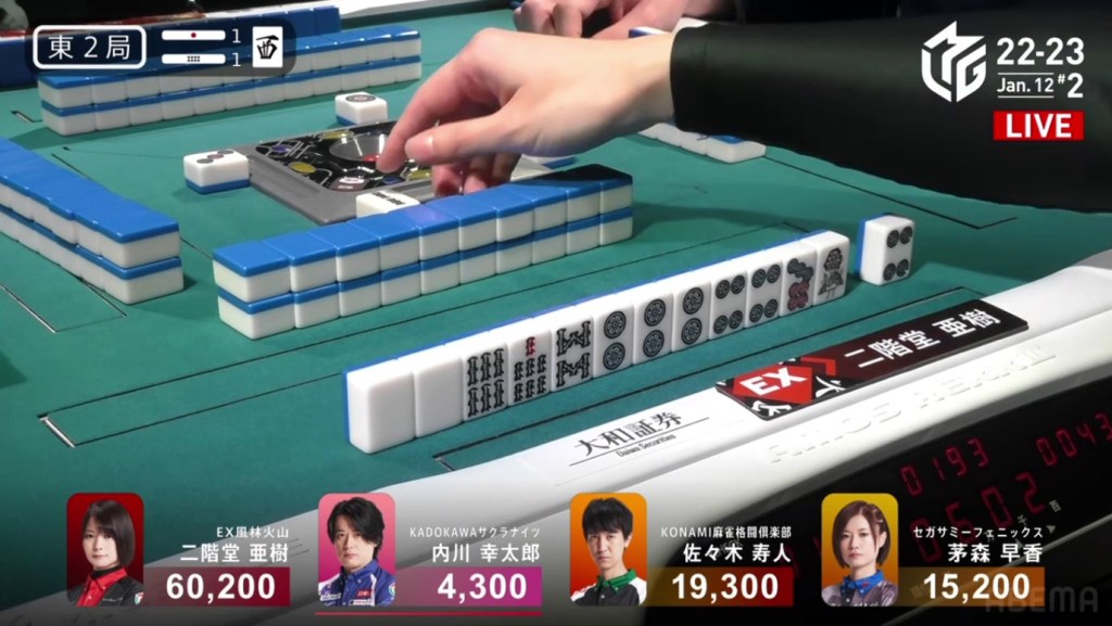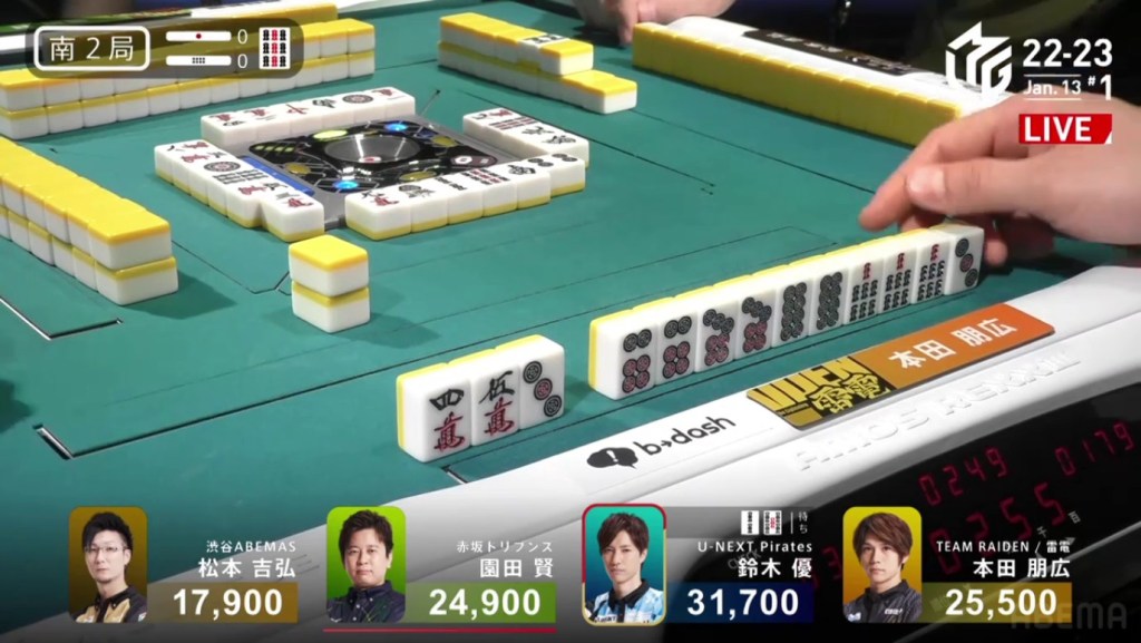The two of them aren’t the only ones with placement at stake. Shiratori is sitting in 2nd place and holding his dealership. With a call near the end of the second row, Shiratori gets to tenpai and waits on a 36s ryanmen. On Shiratori’s next draw, he gets Murakami’s winning 2m. With it being dangerous, Shiratori chooses to fold his hand.
