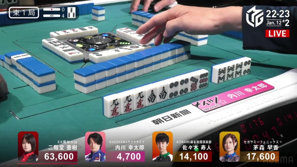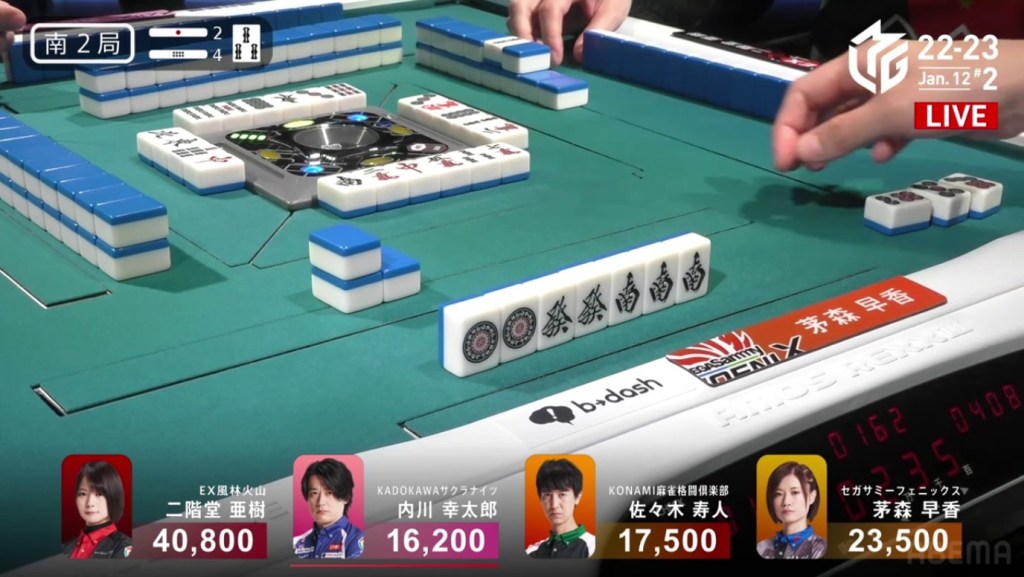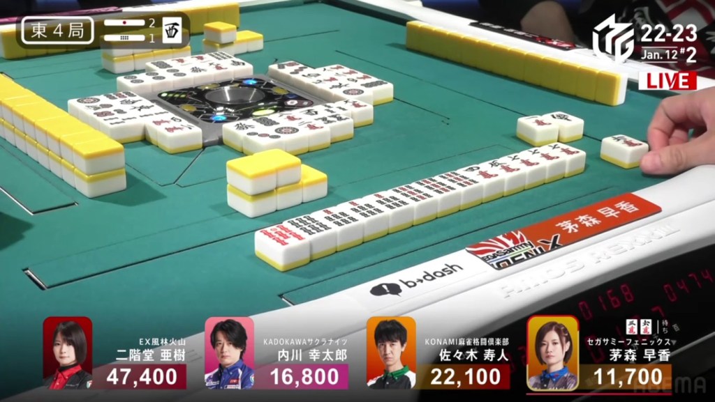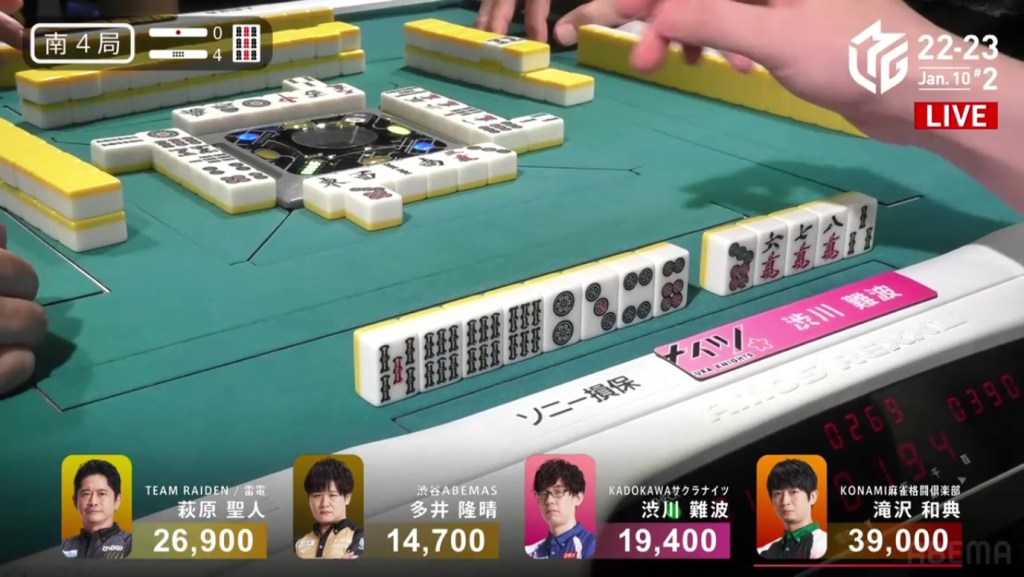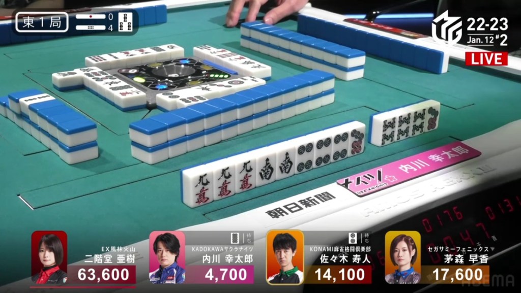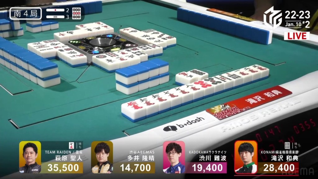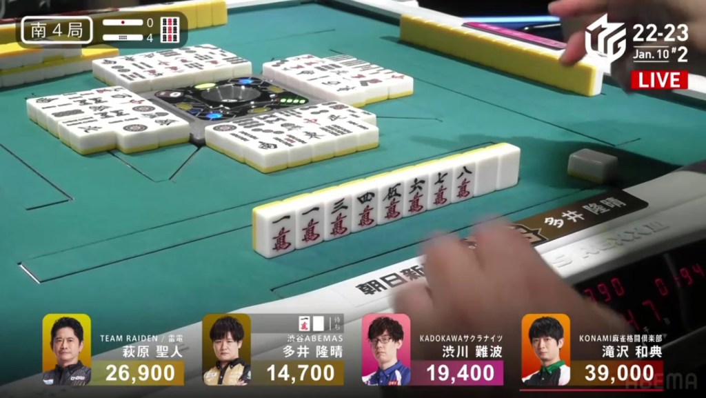 In S4-4, Ooi is in 4th place and 4,700. Due to the four honba, Ooi’s is pursuit for 3rd is made easier. In order to move out of 4th place, he would need a 3/30 general ron, a 2/40 tsumo or a 1/40 direct hit off 3rd place Shibukawa.