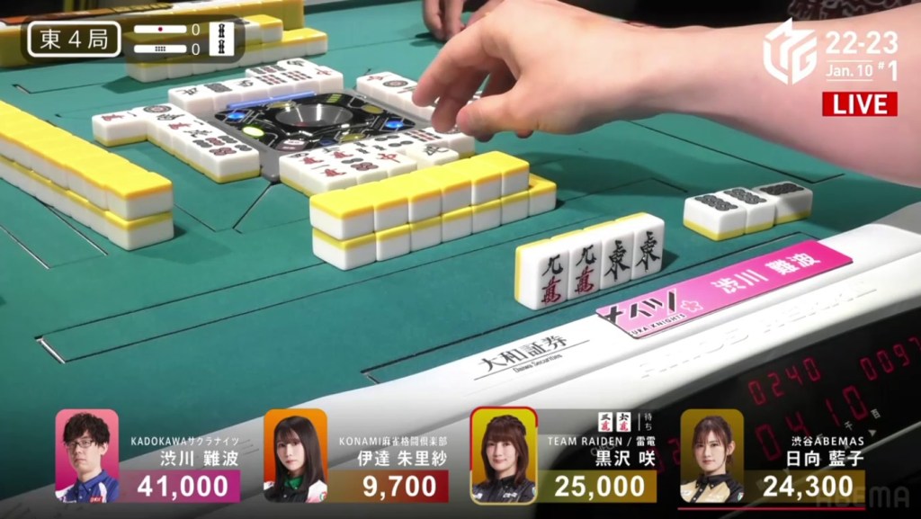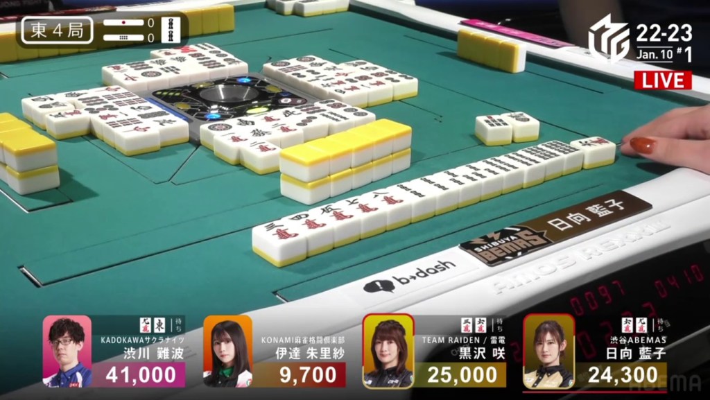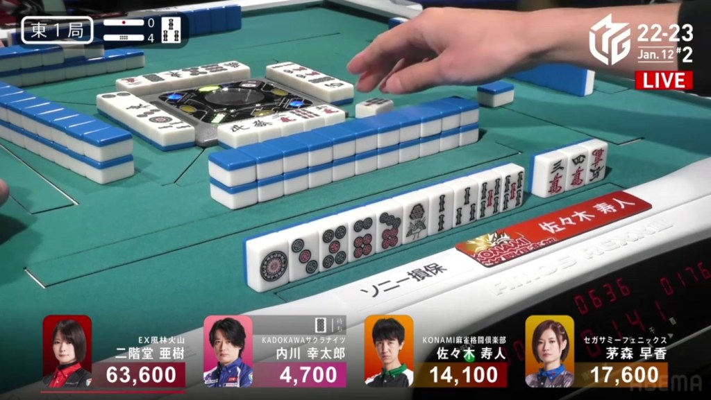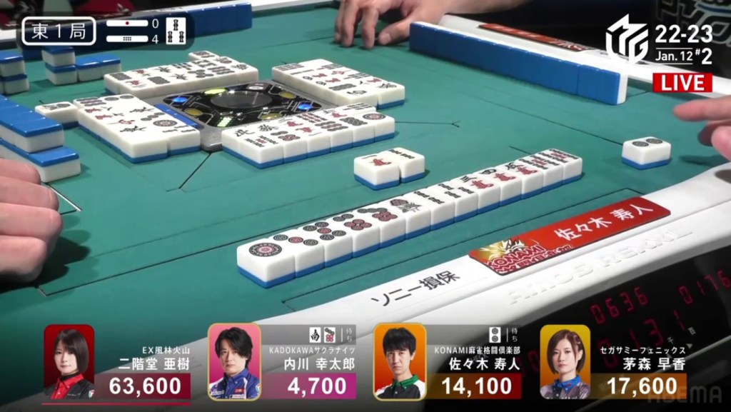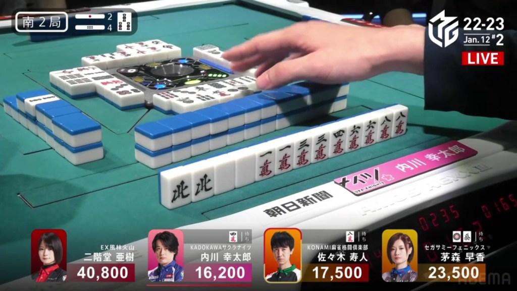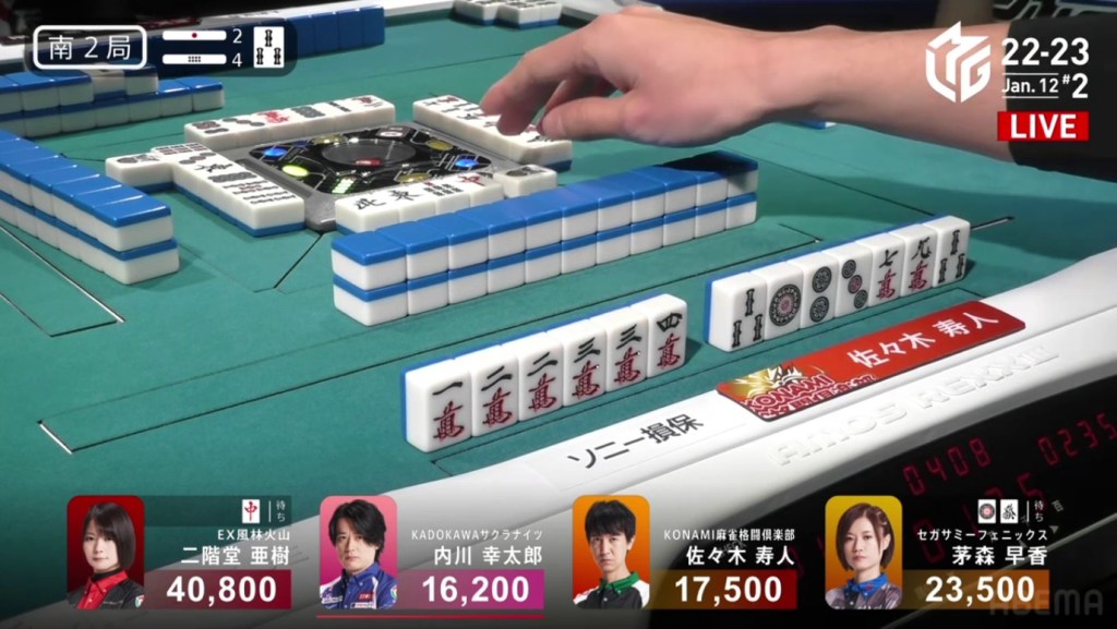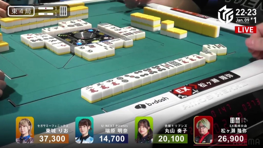 In S4-4, Ooi is in 4th place and 4,700. Due to the four honba, Ooi’s is pursuit for 3rd is made easier. In order to move out of 4th place, he would need a 3/30 general ron, a 2/40 tsumo or a 1/40 direct hit off 3rd place Shibukawa.