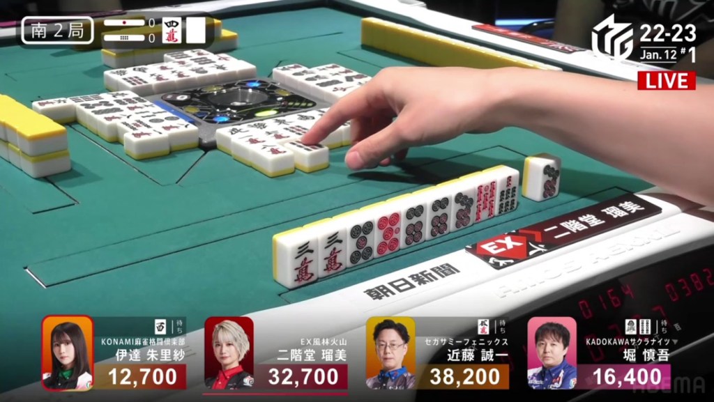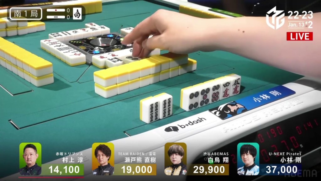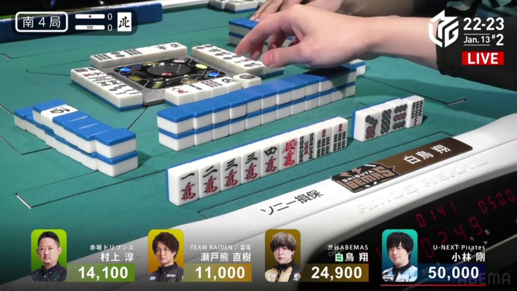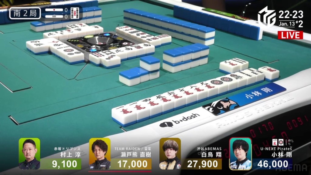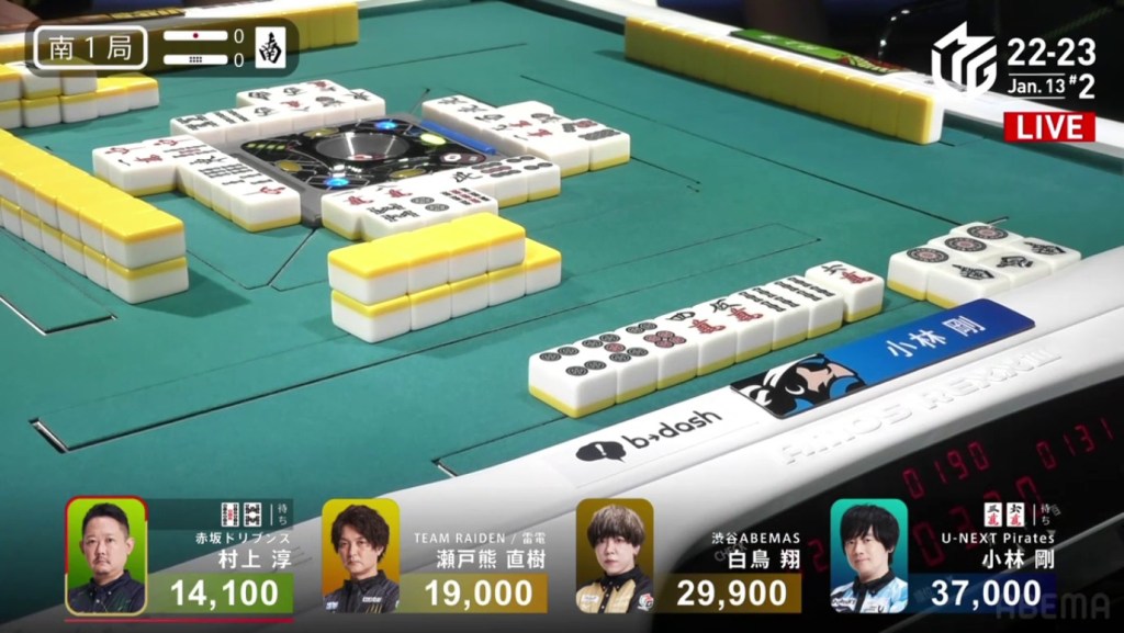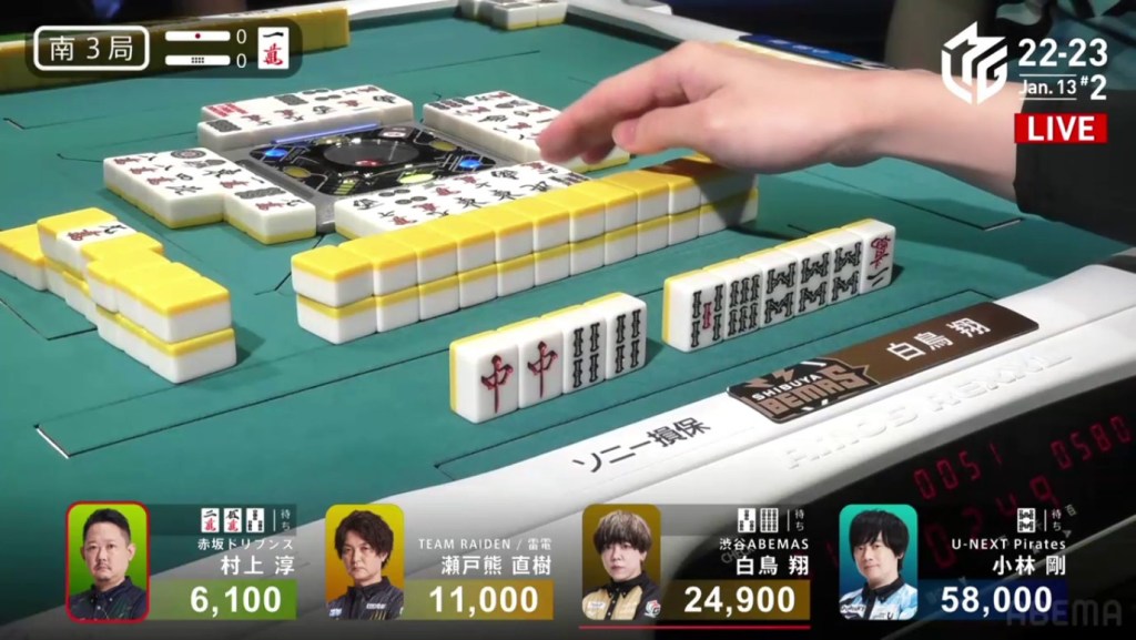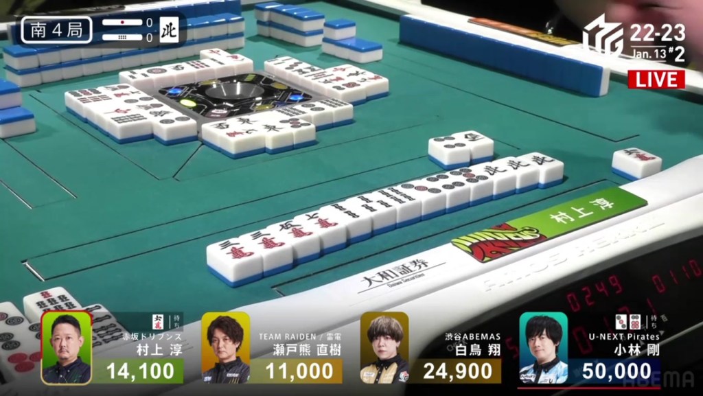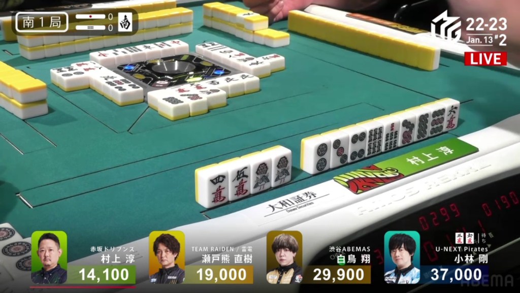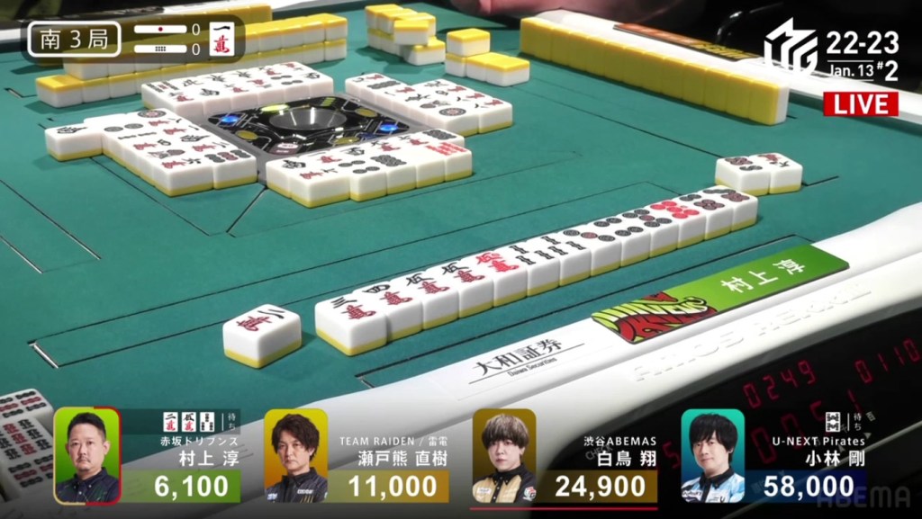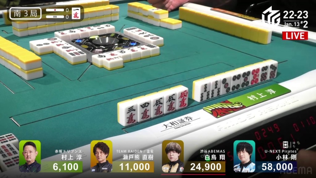 It was a battle between 1st and 4th place, fighting for their teams. Two turns after Murakami’s riichi, Kobayashi draws the 6m and wins the hand. Kobayashi wins with South/Dora 3 for 2,000/4,000 plus Murakami’s riichi stick.