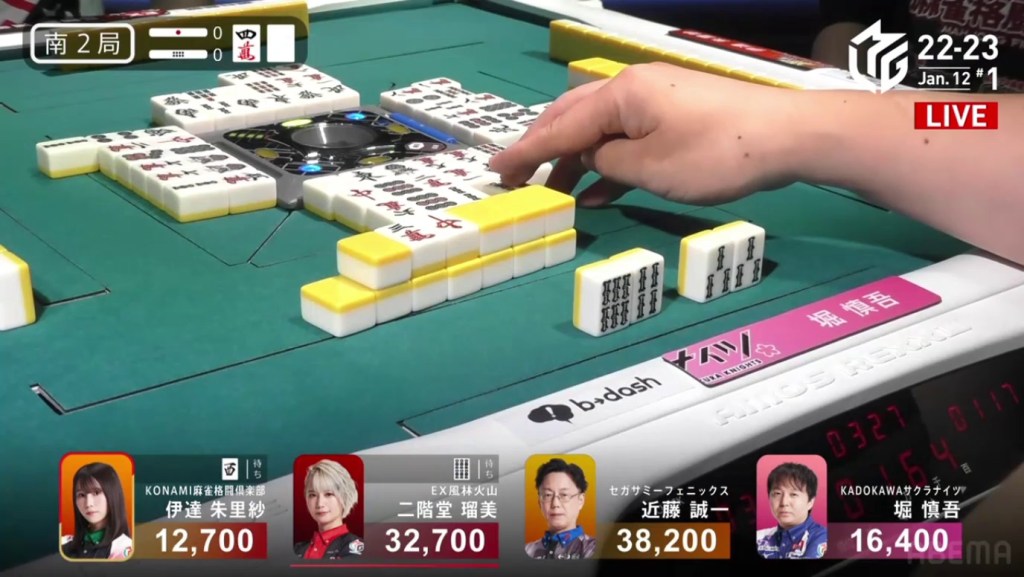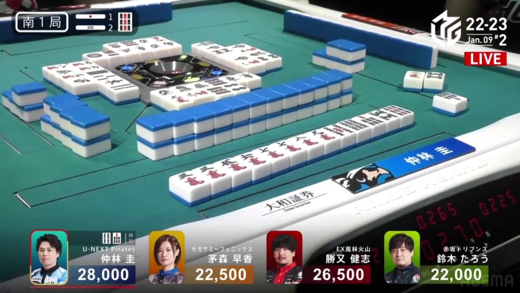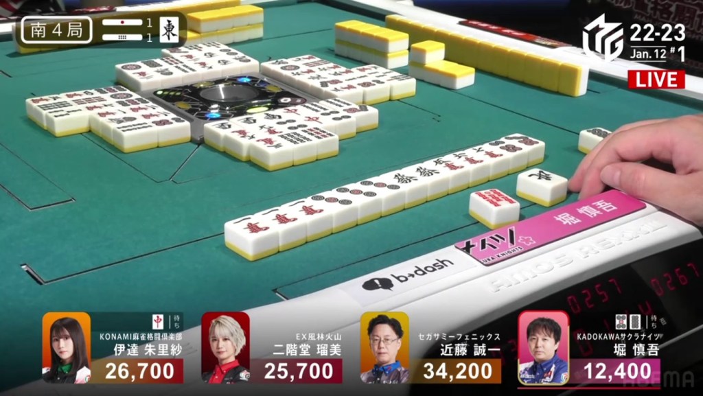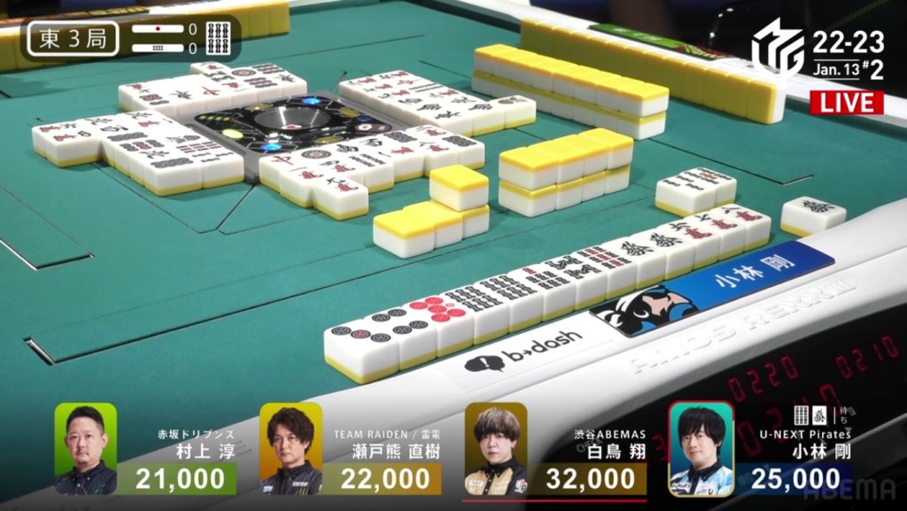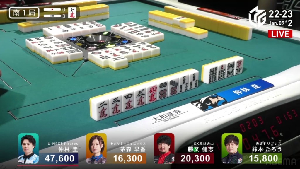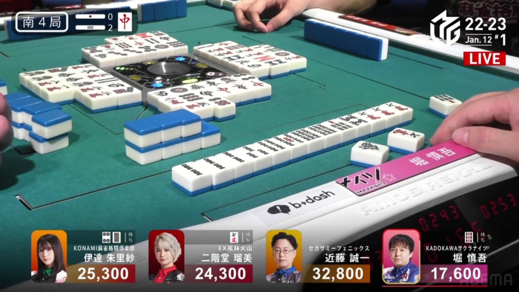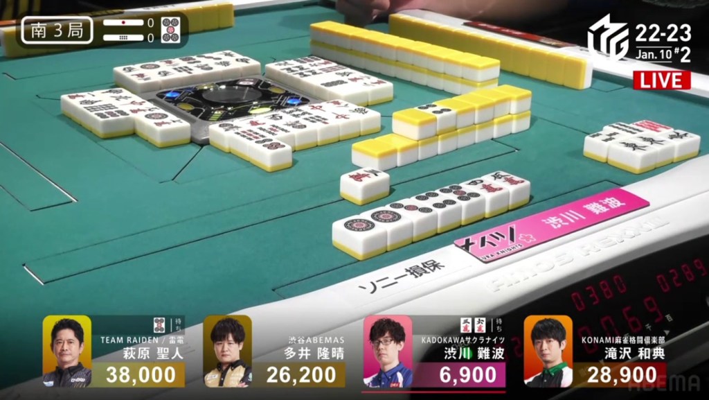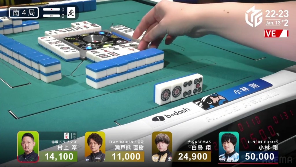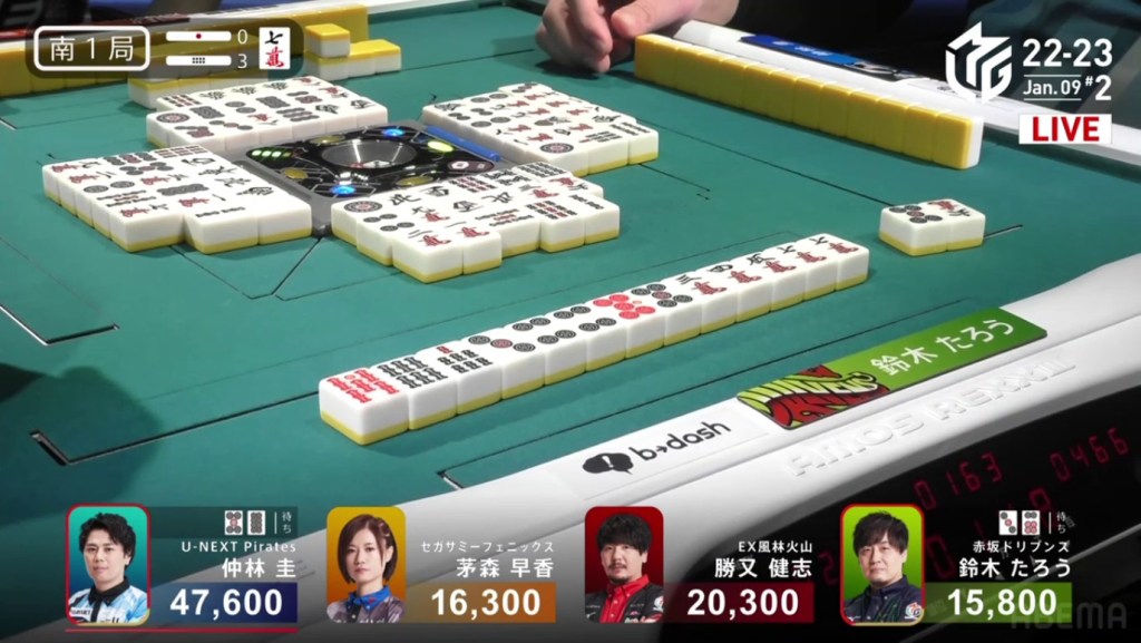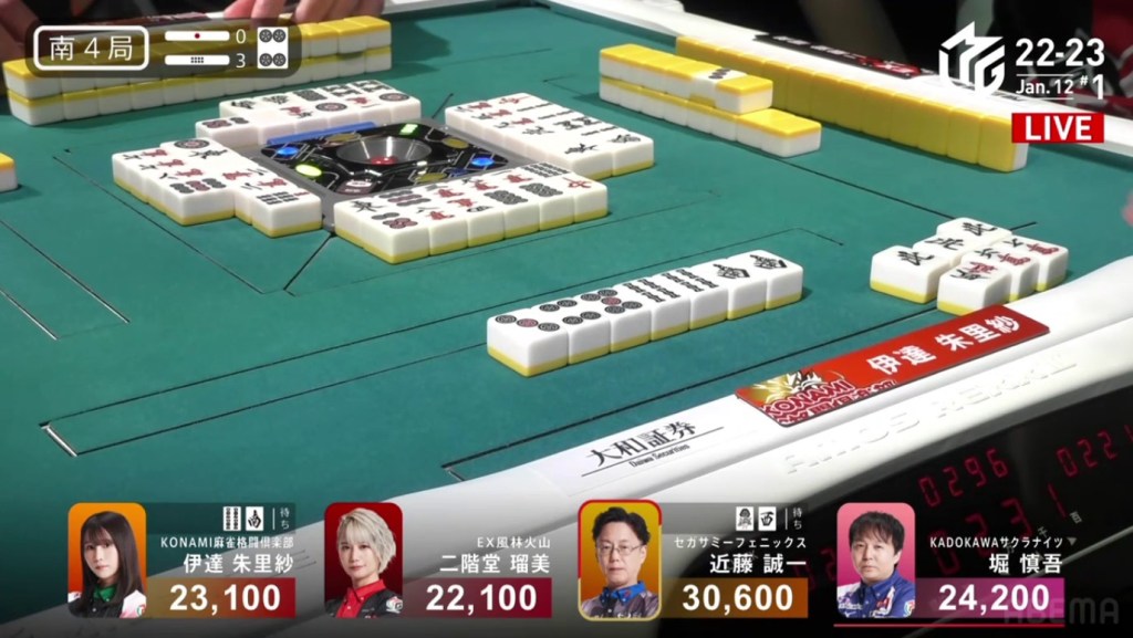 It was a battle between 1st and 4th place, fighting for their teams. Two turns after Murakami’s riichi, Kobayashi draws the 6m and wins the hand. Kobayashi wins with South/Dora 3 for 2,000/4,000 plus Murakami’s riichi stick.