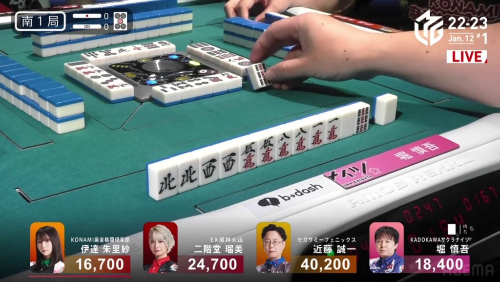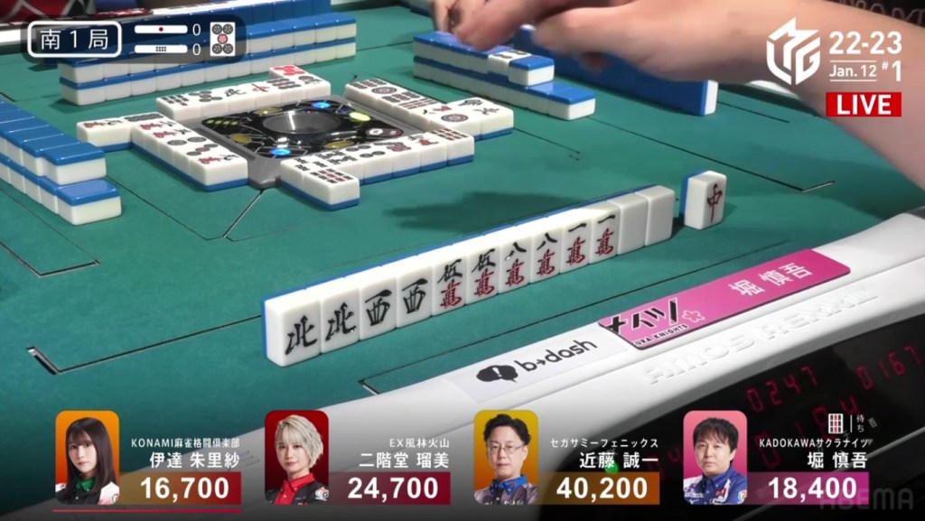 Soon after, Kondo draws a pair of wests to get to tenpai on a 5m tanki.