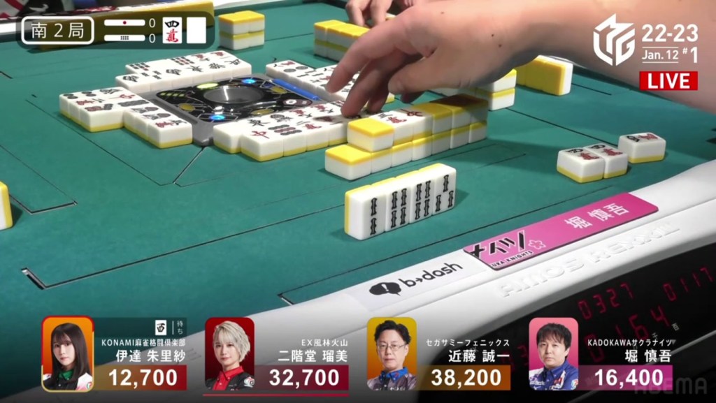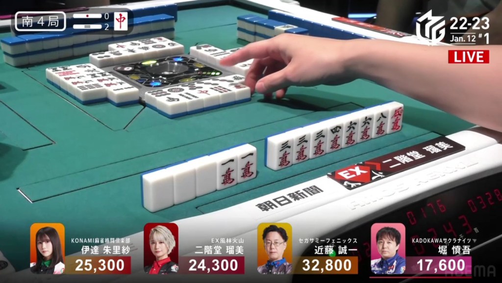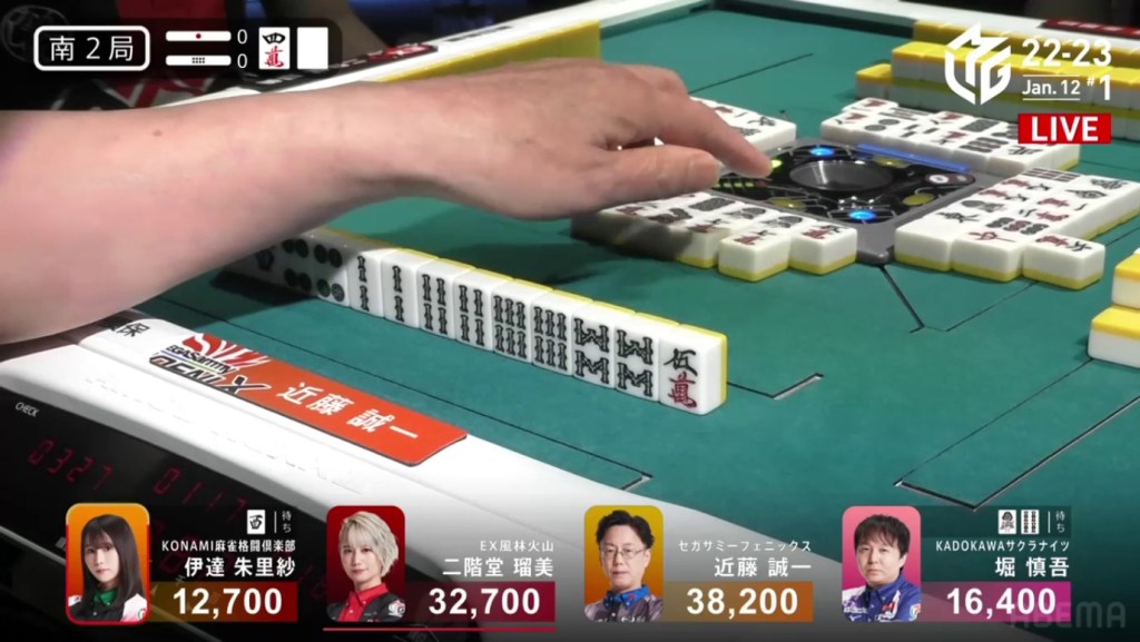 On Murakami draw at the start of the second row, he gets to tenpai and calls riichi waiting on a 6m kanchan. With a tsumo and one uradora, Murakami will move into 2nd.