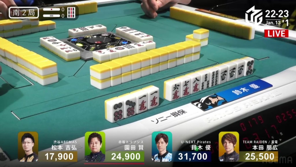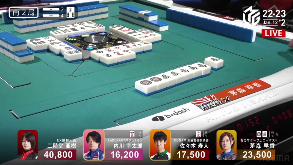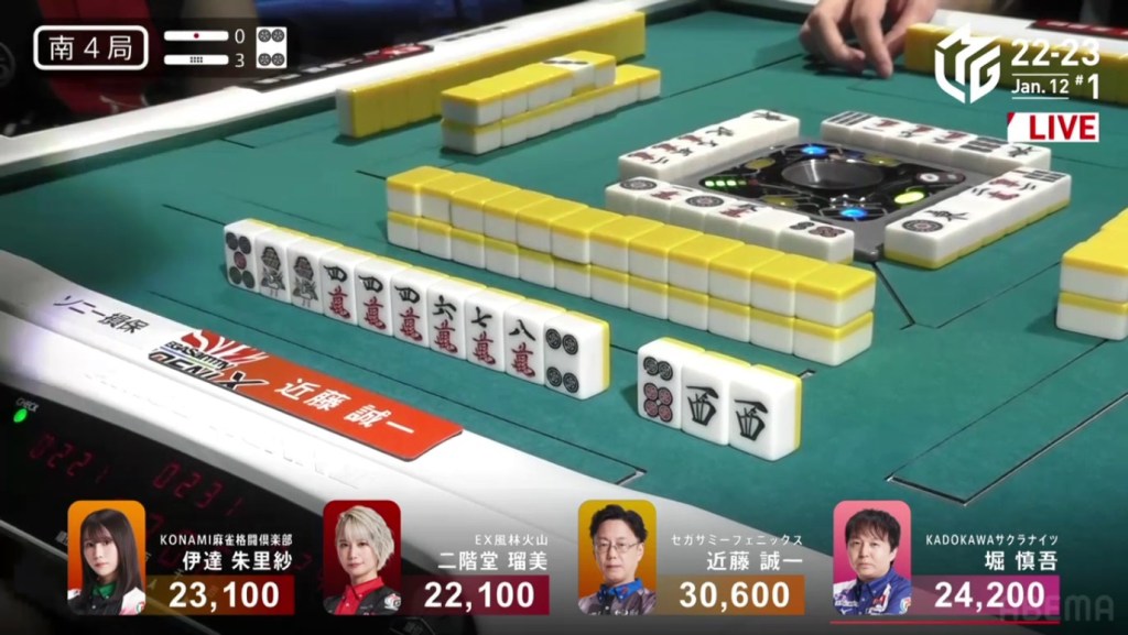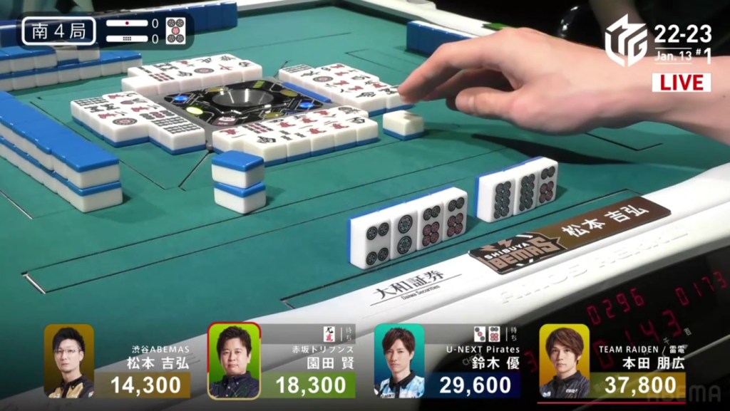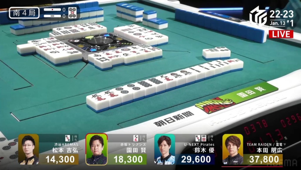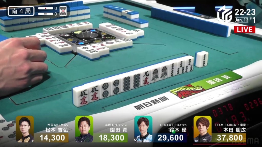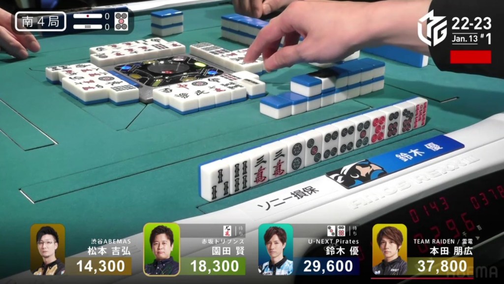In S4-0, Sonoda is in 3rd, 4,000 ahead of 4th place Matsumoto and 10,700 behind 2nd place Yu. Sonoda would need a haneman tsumo or general ron or a direct hit of 6,400 (3/50 or 4/25) or more to move into 2nd.
