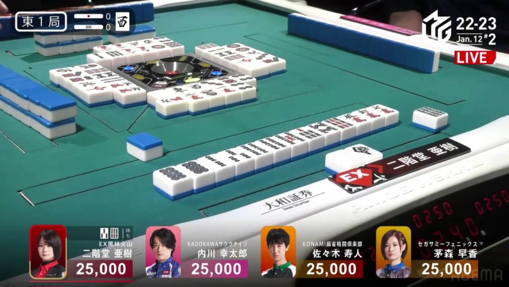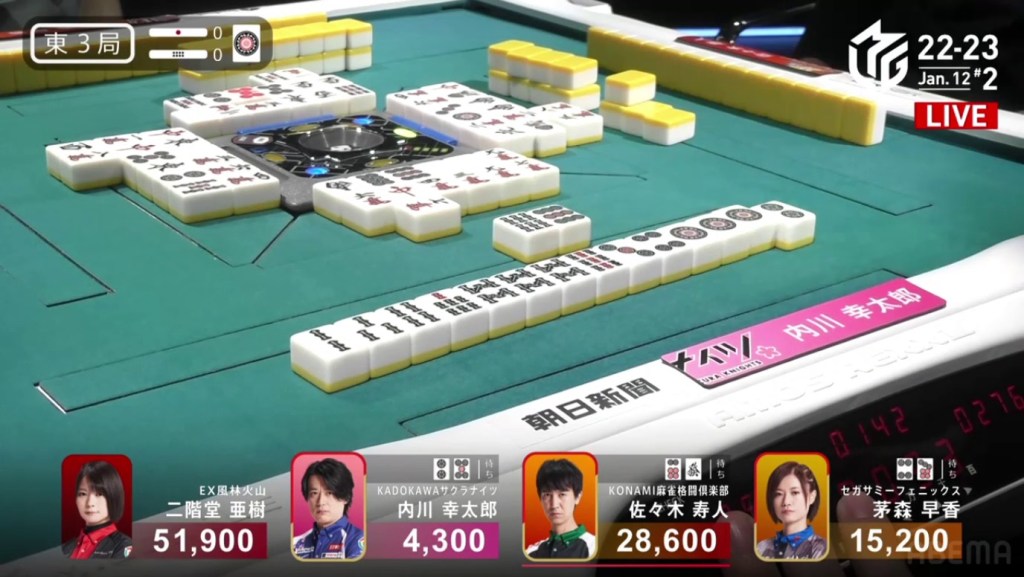 In E3-0, Uchikawa is in 4th place and sitting 10,900 behind 3rd place Kayamori, who is 13,400 behind 2nd place Hisato. At the start, Hisato is 2-shanten with a red 5s, an isolated 1p and a pair of green dragons, Kayamori is 3-shanten with a red 5m and Uchikawa is 3-shanten with a pair of white dragons and a dora 1p. On turn 2, Hisato is already iishanten. On turn 3, Hisato gets to tenpai and sits with a yakuless 5m kanchan. At the same time, Kayamori fills in a kanchan and gets to iishanten. On turn 4, Kayamori fills in another kanchan and calls riichi on a 47p ryanmen.
