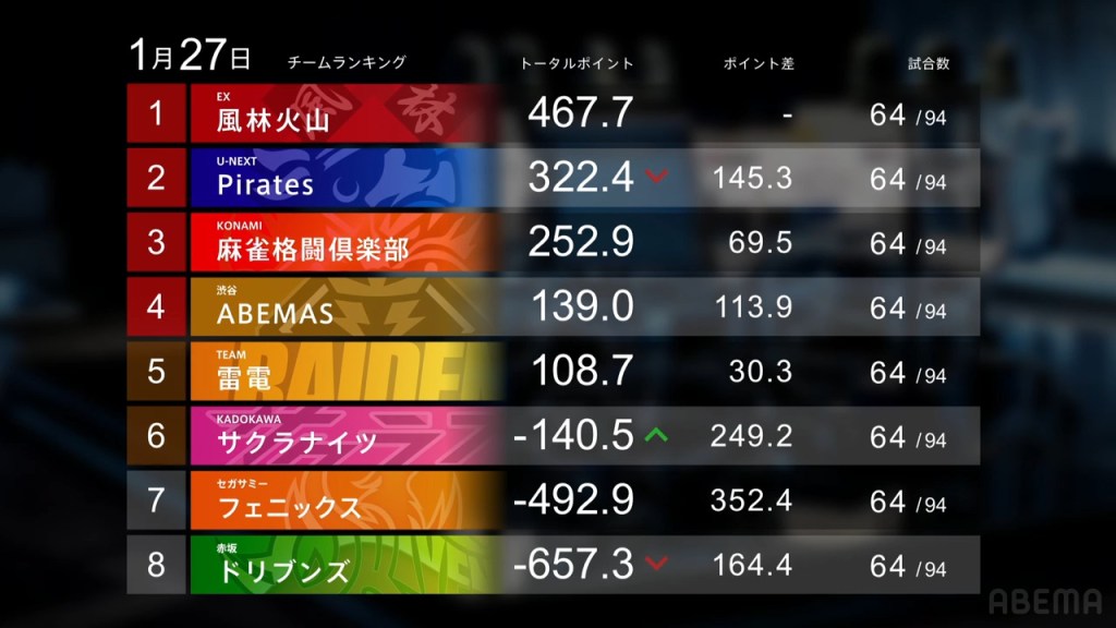And finally, placing last in the performanince rankings, we have the U-Next Pirates. After their 5-game winning streak last week, the team went on another streak this week. Unfortunately, it was a 4-game 3rd place streak with a net loss of -94.1. The team didn’t really deal into any big hands, but they didn’t win any big hands either. The number of wins and losses were about the same, they were hit with a bunch of tsumos and were stuck around the middle of the pack. As a result of these losses, they ended up dropping quite a bit, moving down to 3rd place.