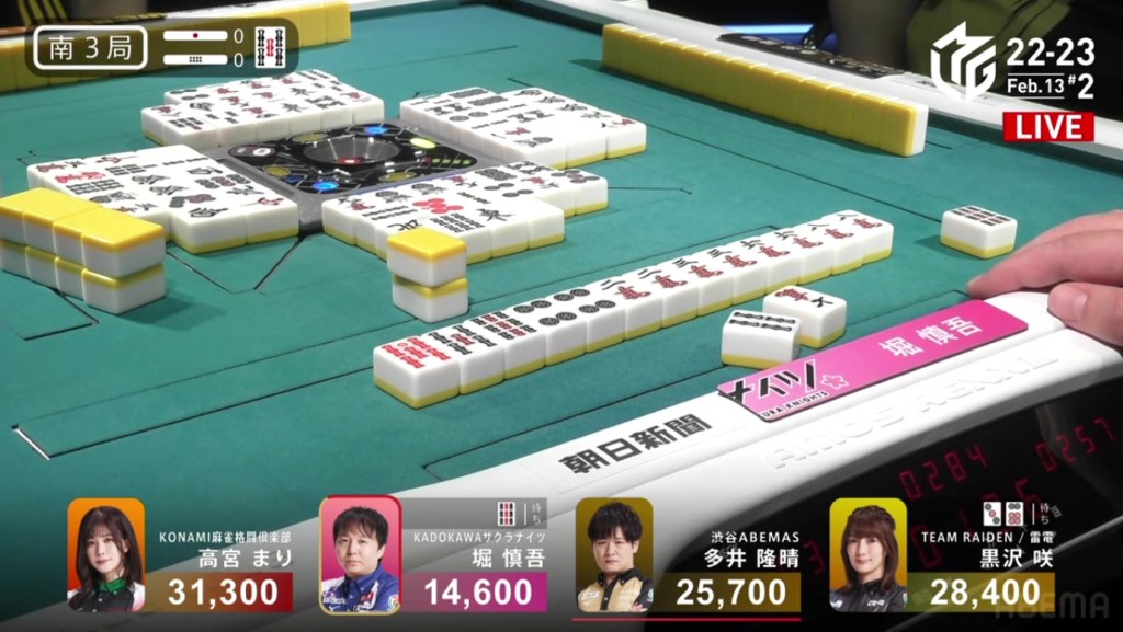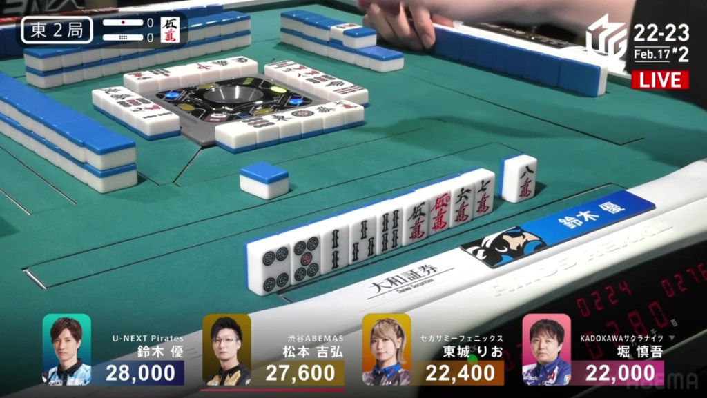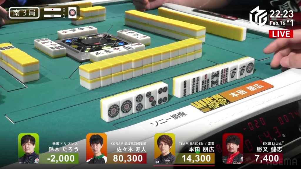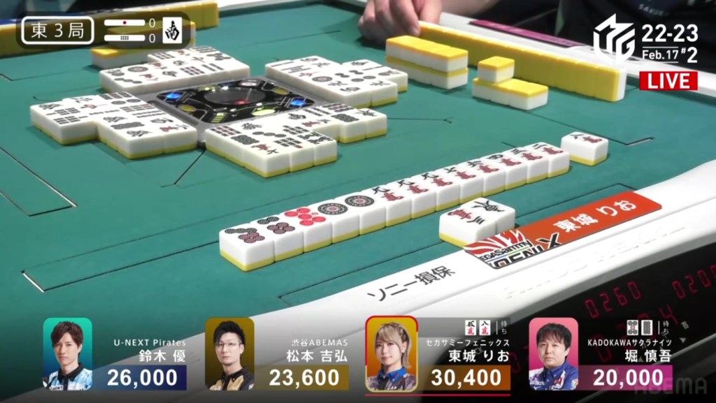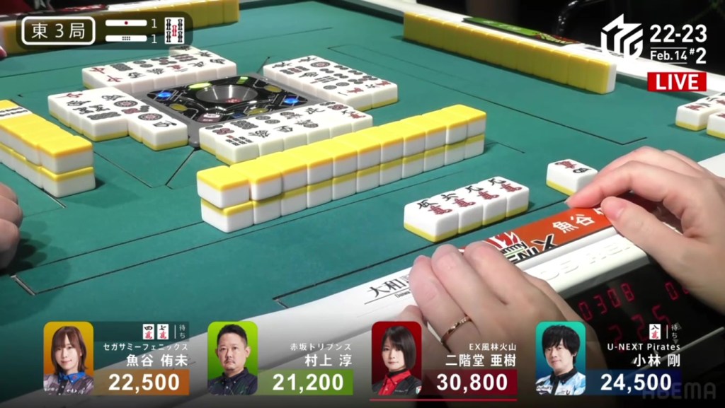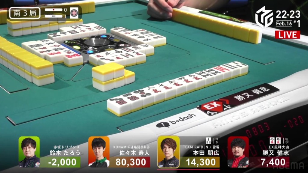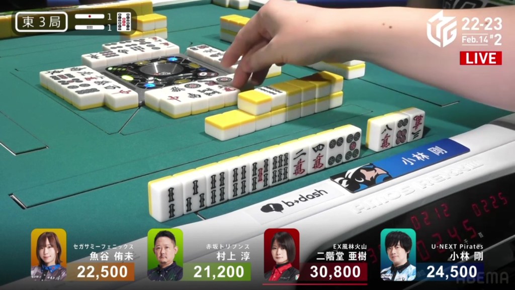Also a fun fact, Aki’s hand consisted of a 3s, 7s, 3m and 7m. These two numbered groups in two suits is known as the local yaku Ryandoukou, also known as Double Date.