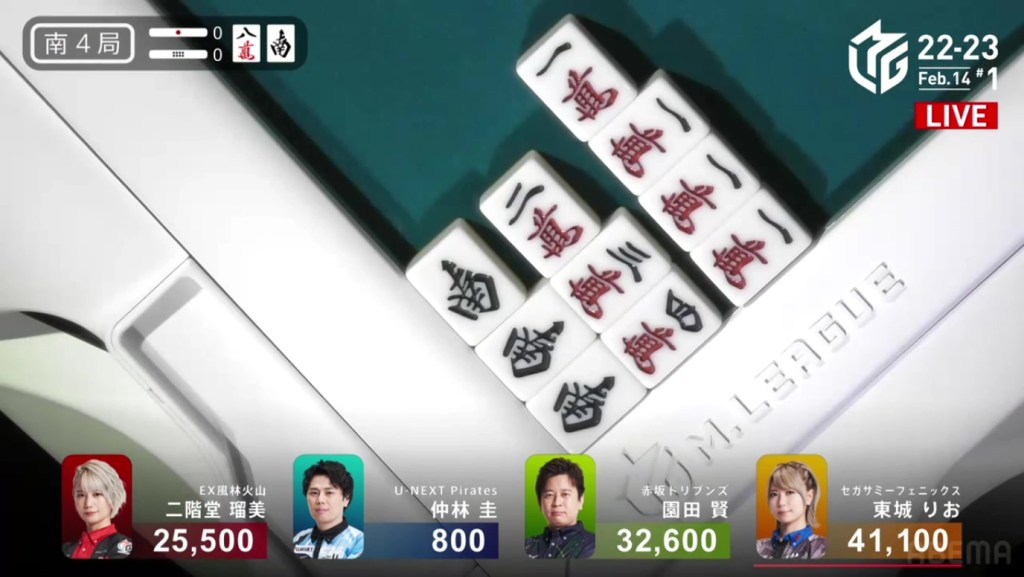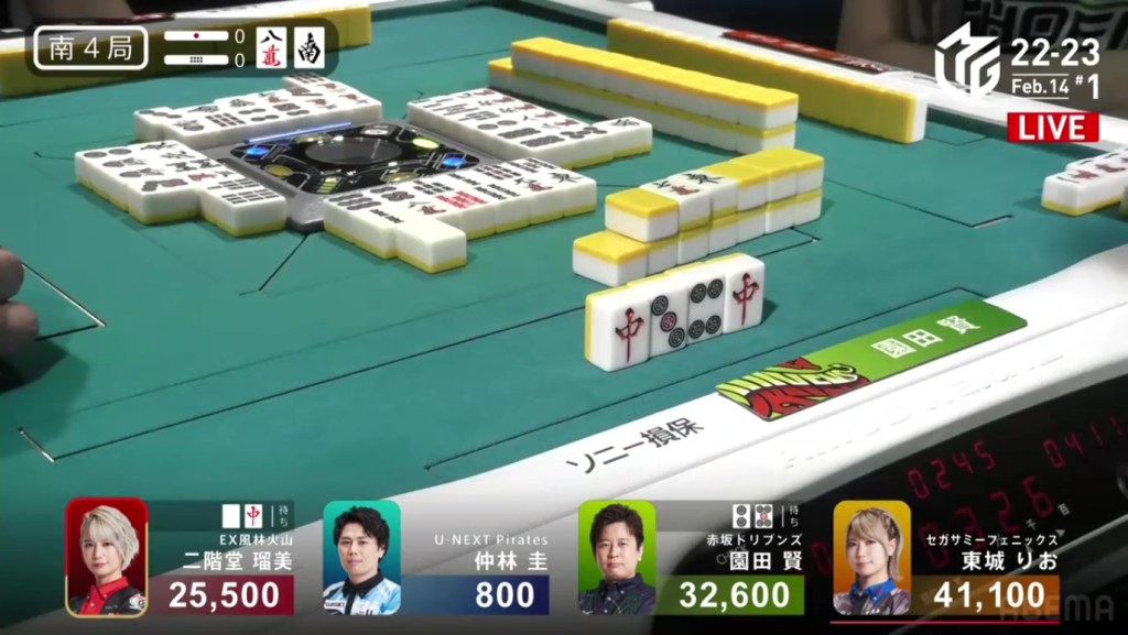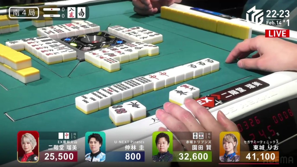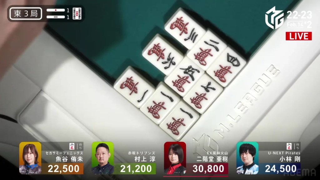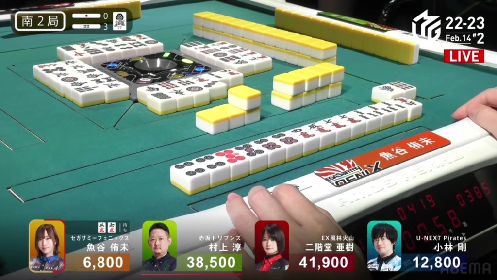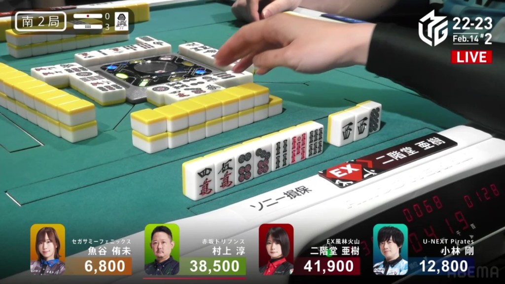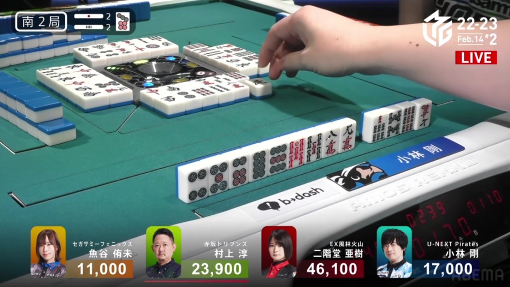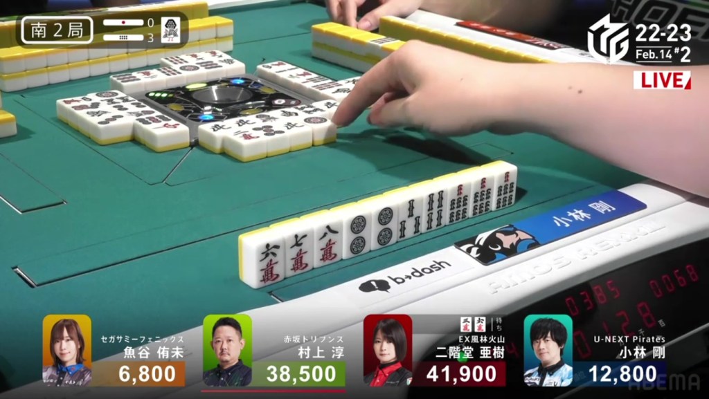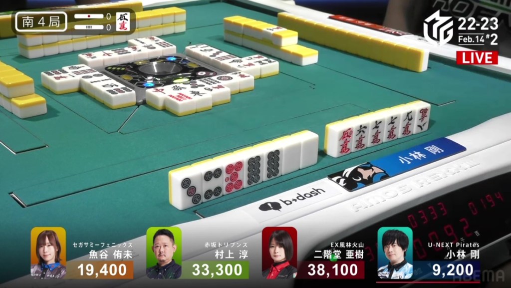 As Drivens fans and Murakami fans saw that one draw, cheers were yelled and tears were shed. As Kobayashi placed it into his discard pile, Murakami’s voice echoed, “Ron!” as he revealed his hand. Tanyao/Dora 2. 3,900 plus Kobayashi’s riichi stick. With the 4,900 gain, Murakami moves in front of Aki by 100 points and wins the game, his first win since February 8, 2022. Even when sitting in the south seat, even when someone else won a yakuman, even when he was last near the end of the game, Murakami pushed through and finally won his first game of the season.