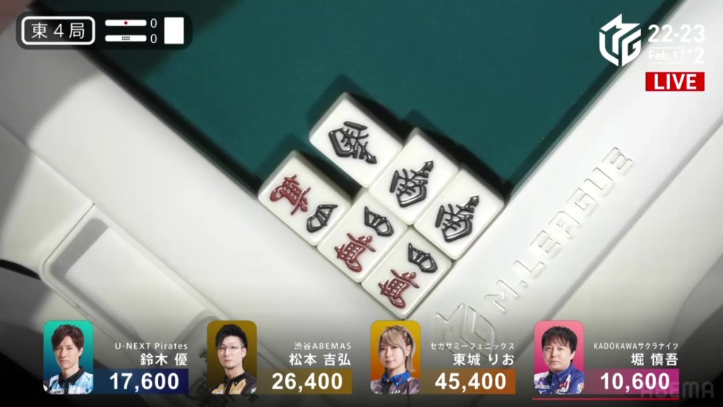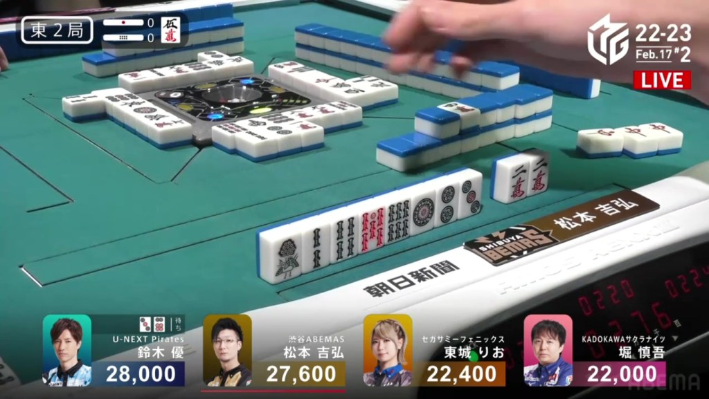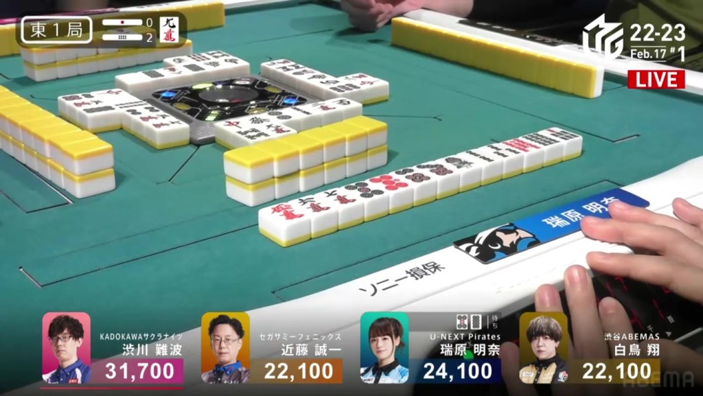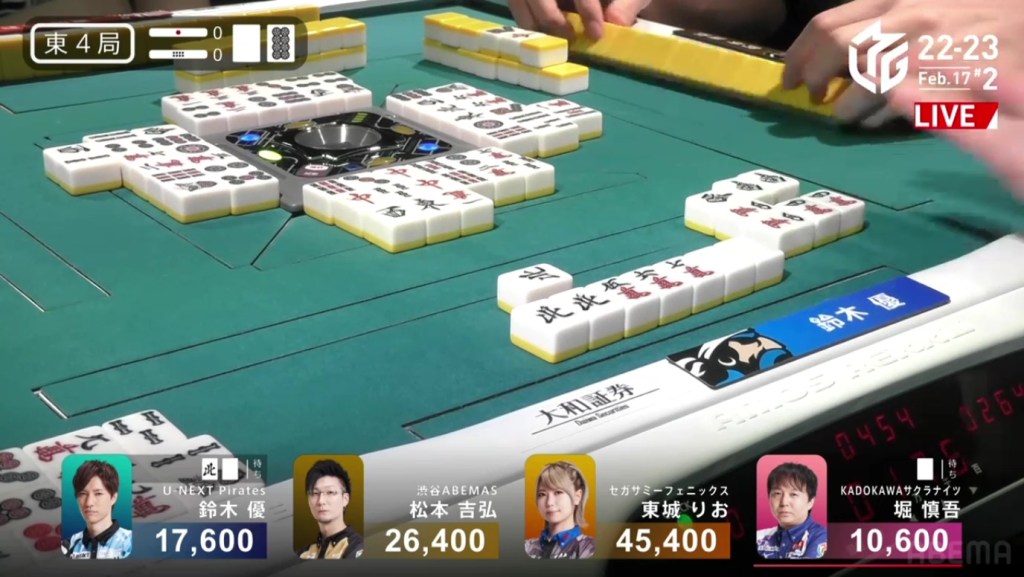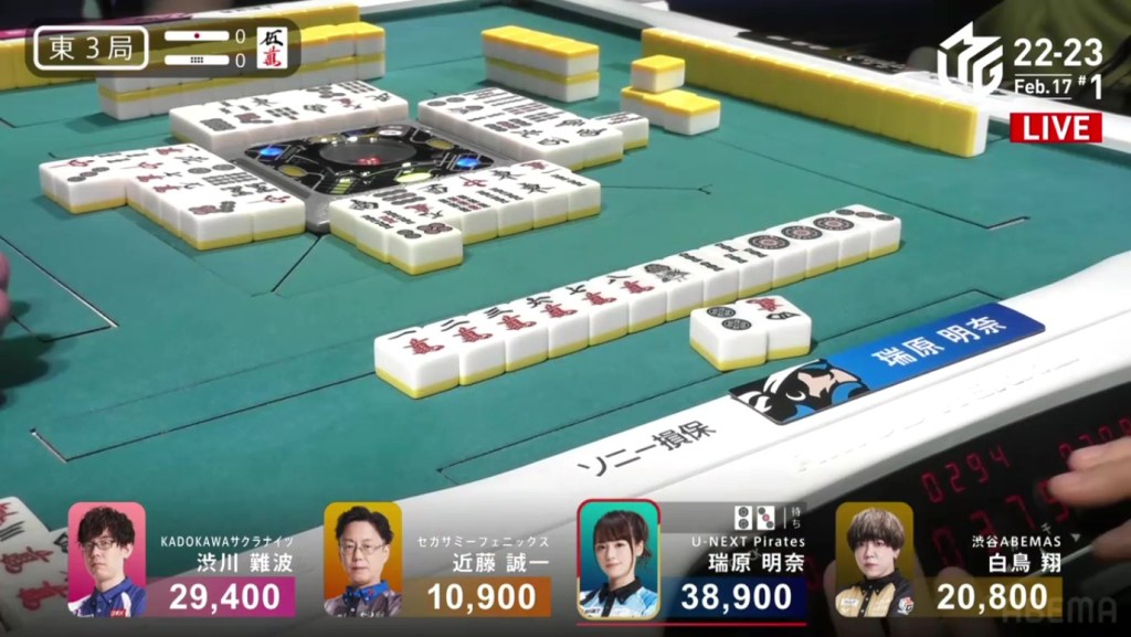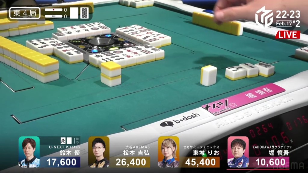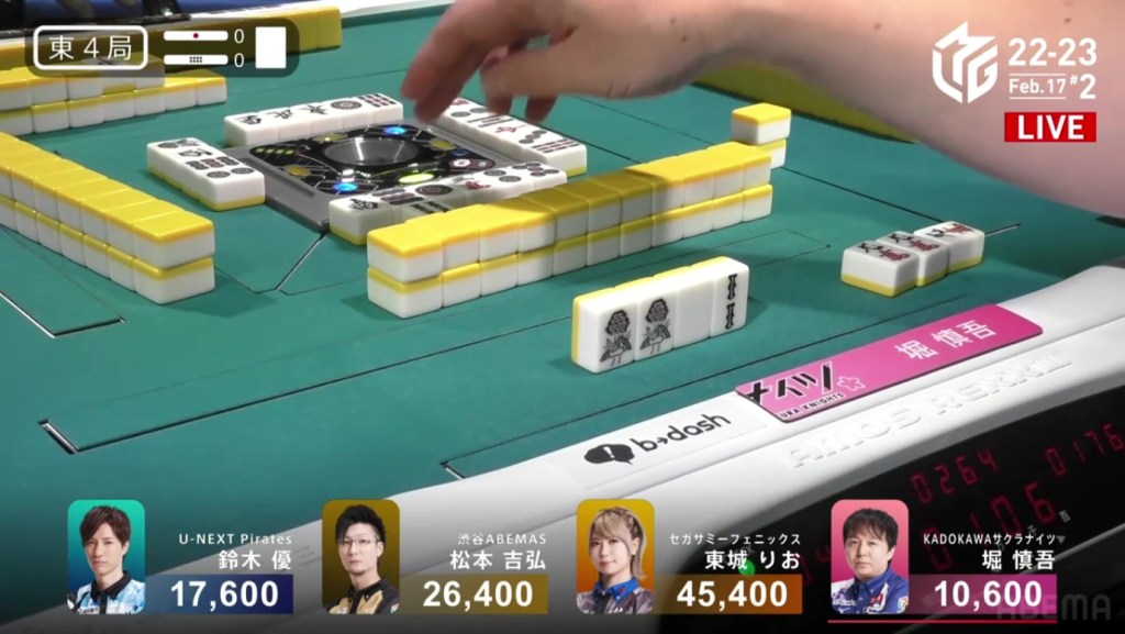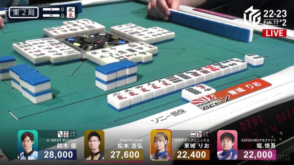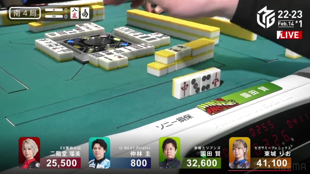 A few turns later, Yu calls pon off Hori’s discarded south to get to tenpai on a white dragon/north shanpon, getting mangan on the north and a haneman on the white dragon.